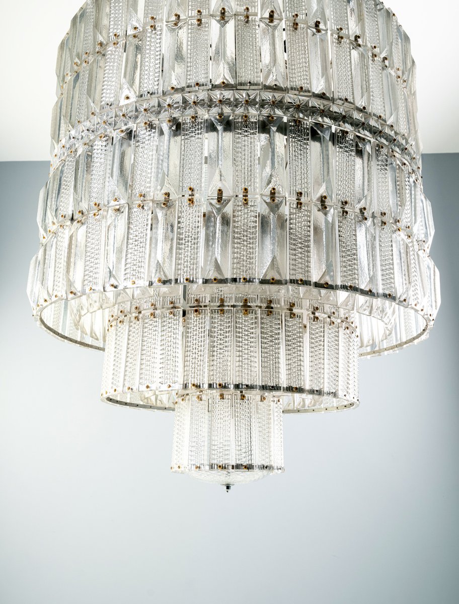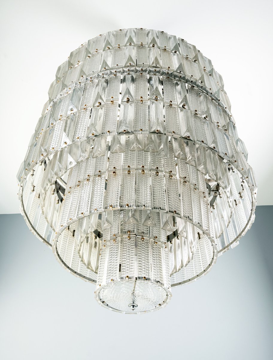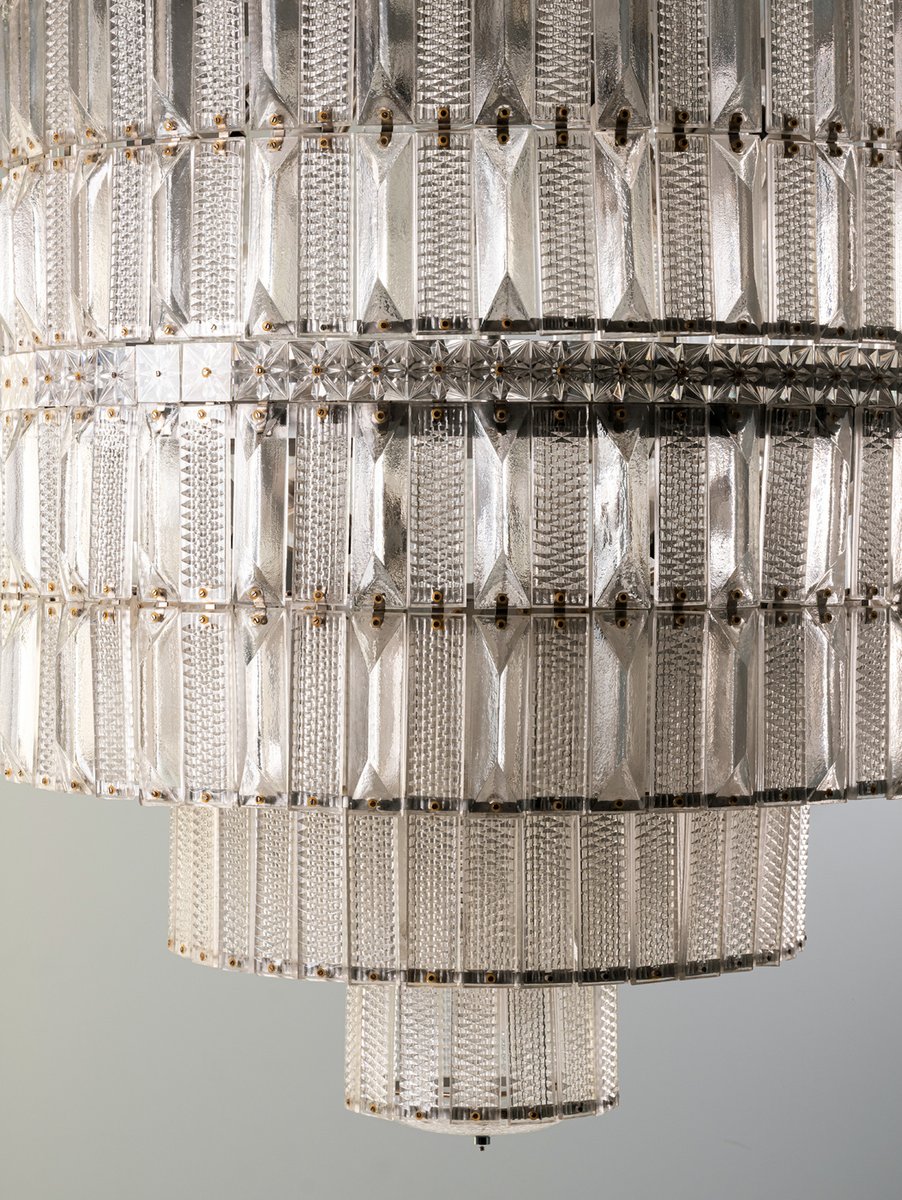 Der Kronleuchter befindet sich in einem unbeschädigten Vintage-Zustand, wobei alle Glaskomponenten intakt sind. Seine beeindruckende Größe und architektonische Präsenz machen ihn zu einem starken Blickfang für große Räume, hohe Decken oder repräsentative Interieurs.