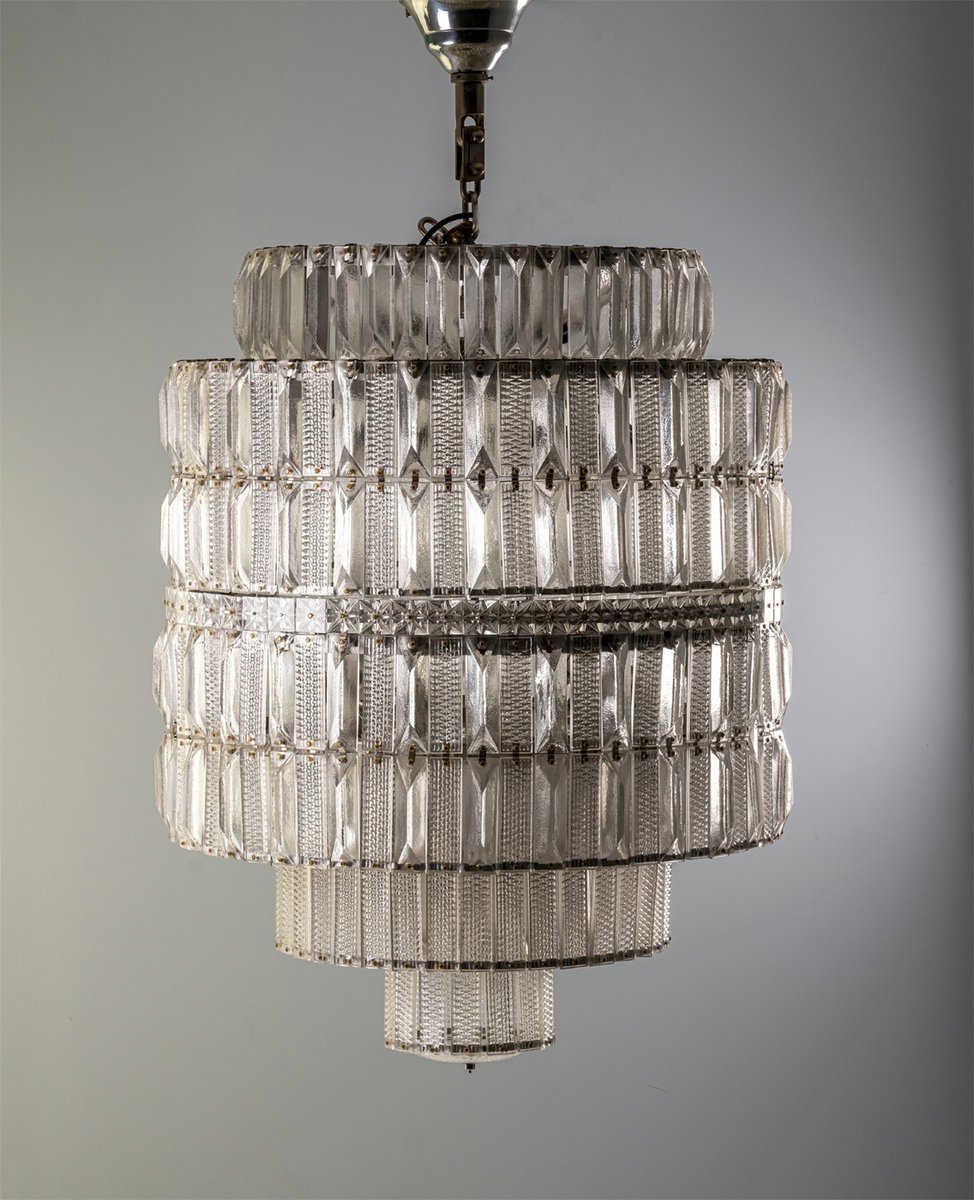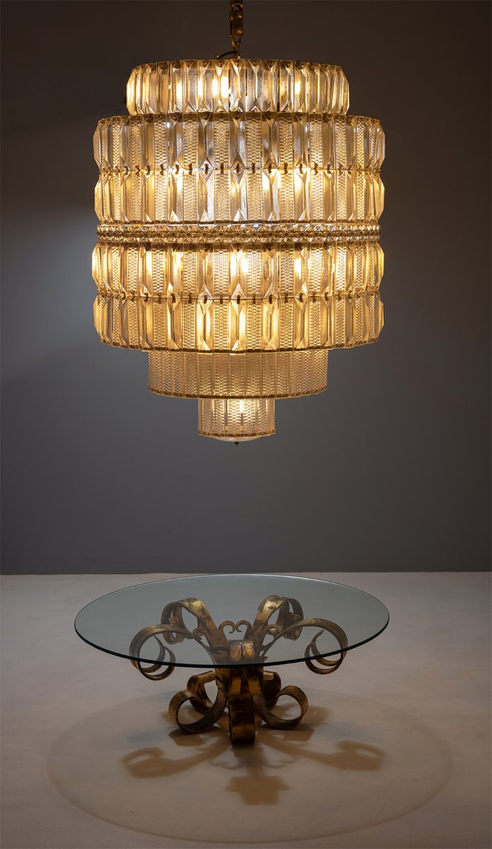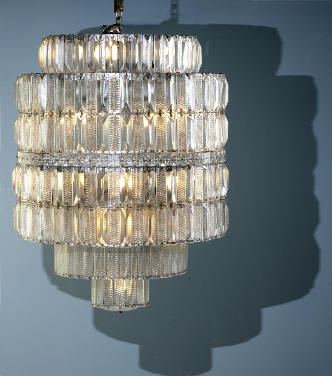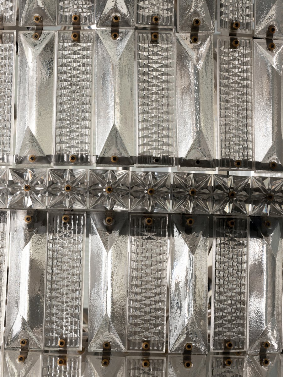 Der Kronleuchter befindet sich in einem unbeschädigten Vintage-Zustand, wobei alle Glaskomponenten intakt sind. Seine beeindruckende Größe und architektonische Präsenz machen ihn zu einem starken Blickfang für große Räume, hohe Decken oder repräsentative Interieurs.