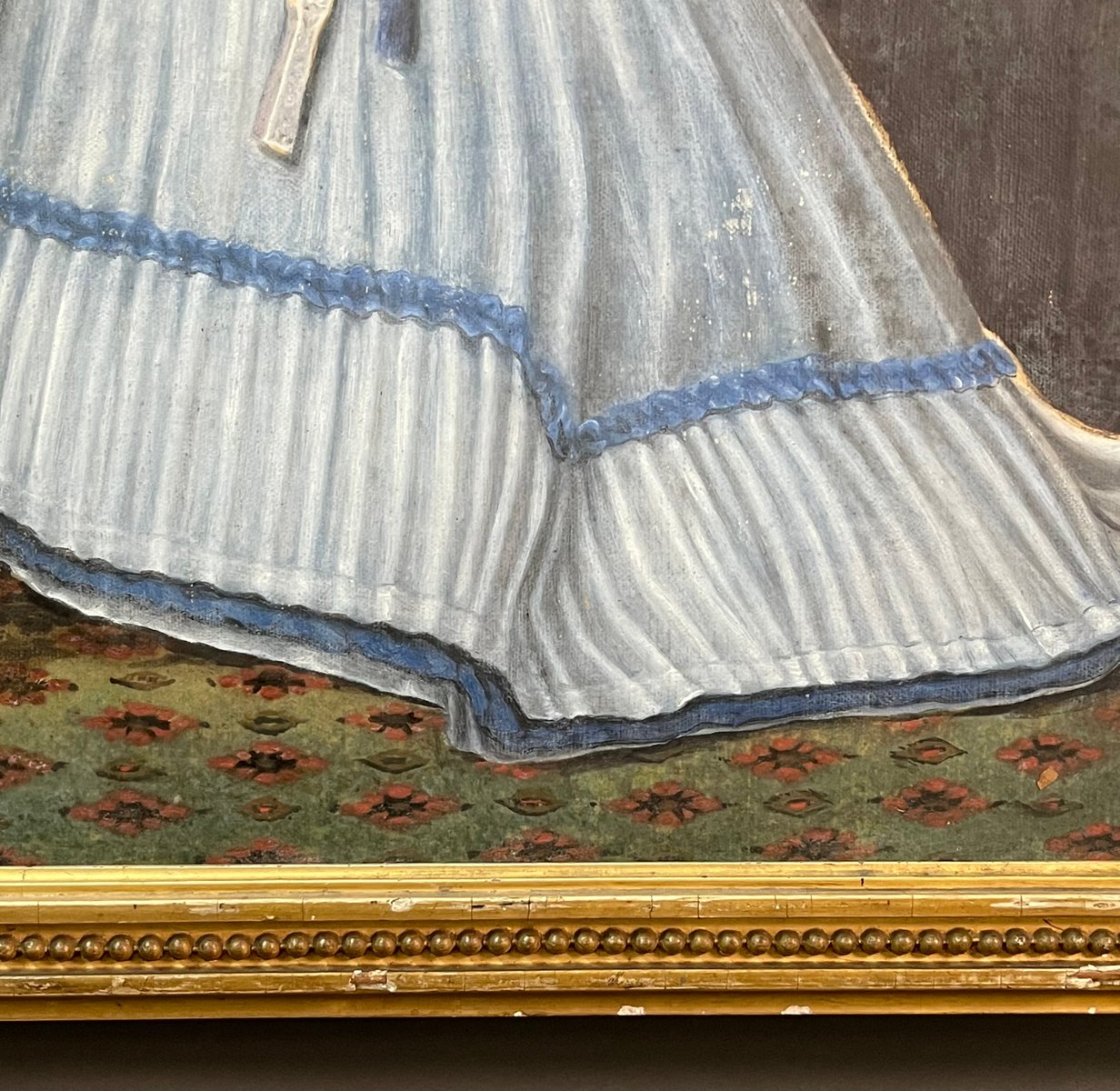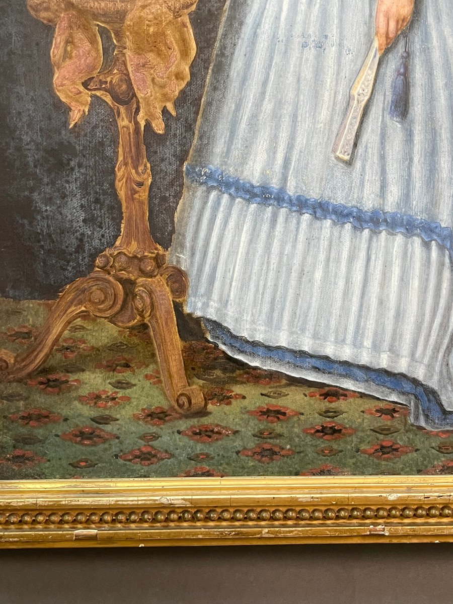 The grace, period, style, and quality all point to the production of a great Flemish-area artist of the second half of the 19th century, Alfred Émile Léopold Stevens, to whom we can attribute the painting.