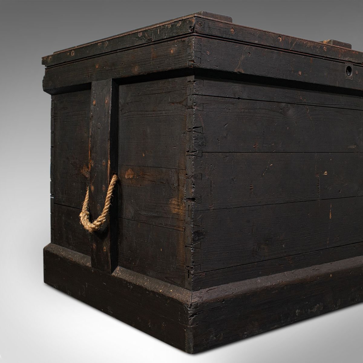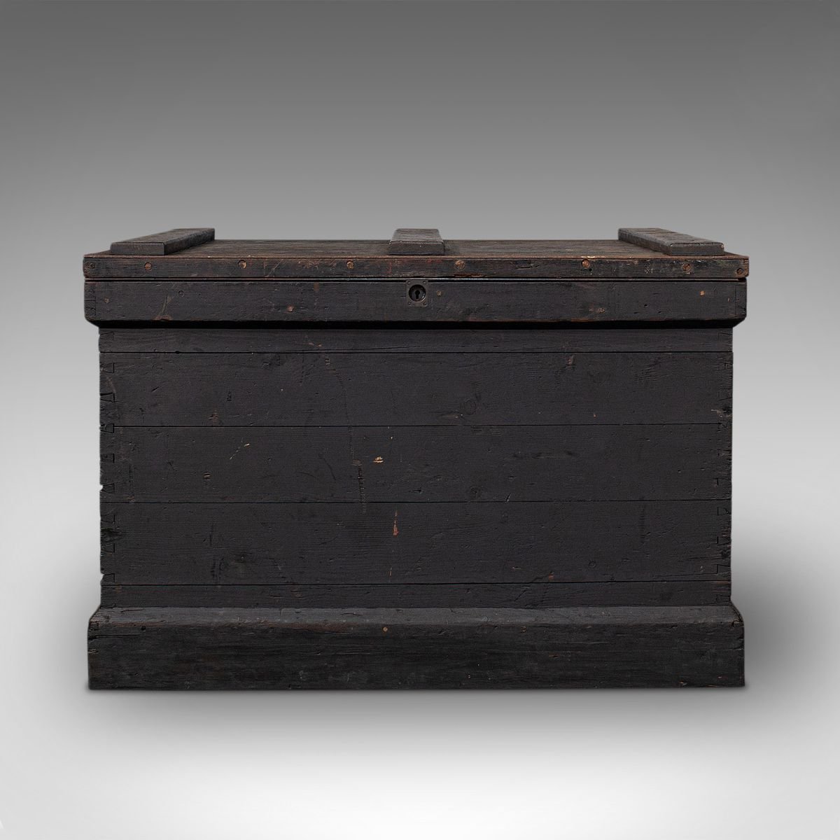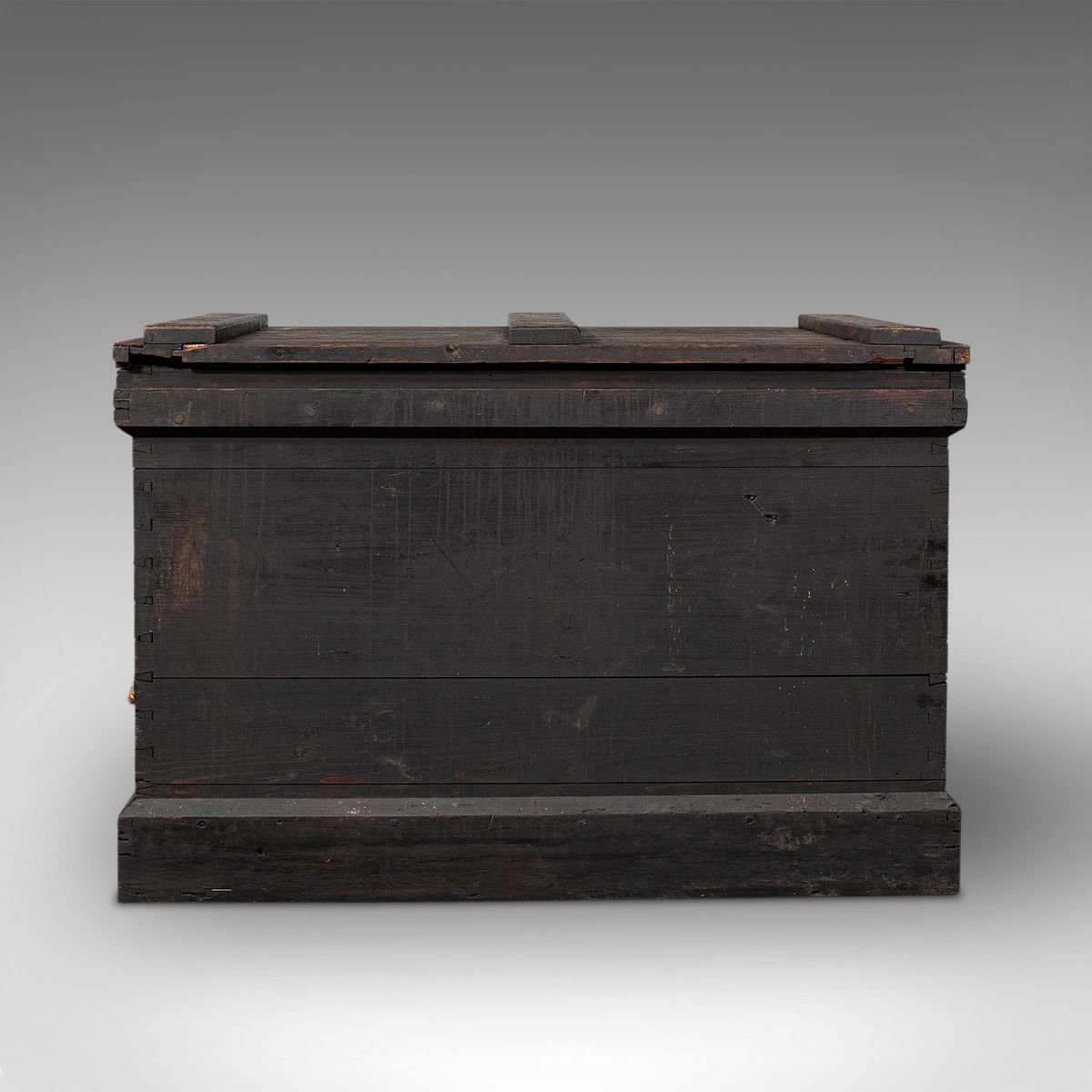 This is a heavy antique master craftsman's chest. An English, ebonised pine and mahogany tool trunk, dating to the Victorian period, circa 1880.