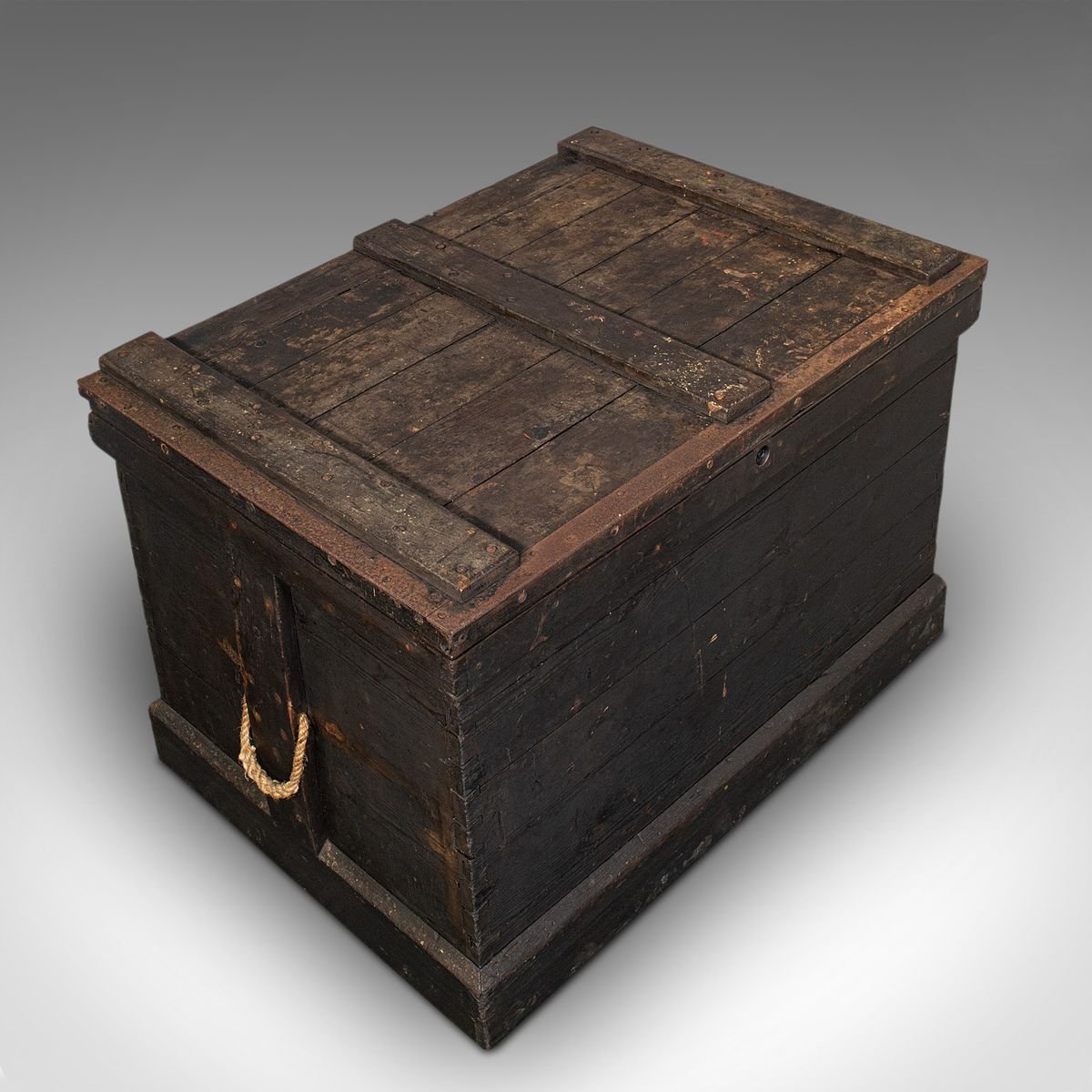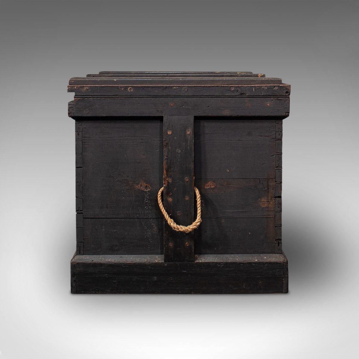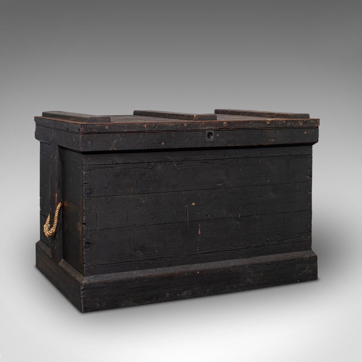 This is a heavy antique master craftsman's chest. An English, ebonised pine and mahogany tool trunk, dating to the Victorian period, circa 1880.