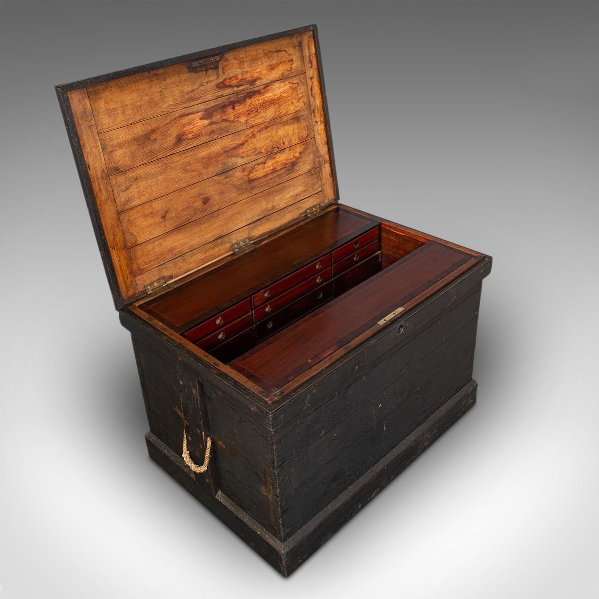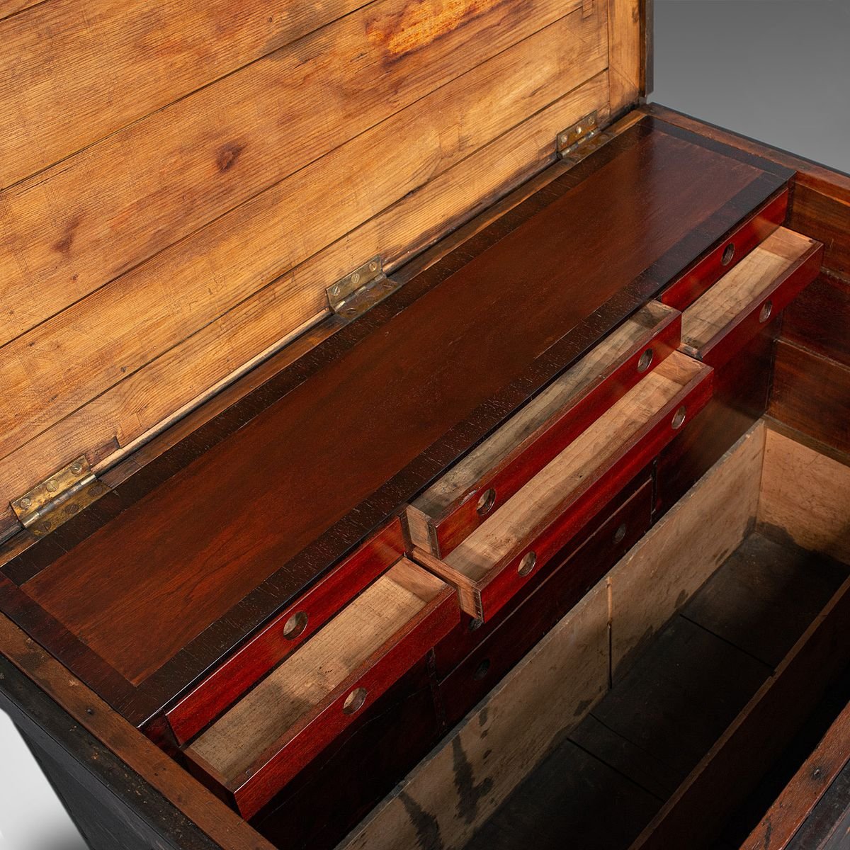 This is a generously sized and substantial antique master craftsman's chest, with a useful fitted interior offering a suite or drawers. Could also be useful for a large coffee table base. Solid joints and construction, delivered waxed, polished and ready for the home.