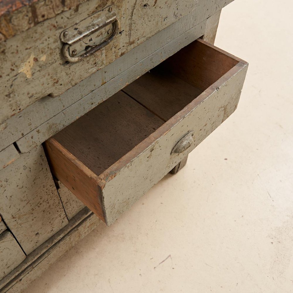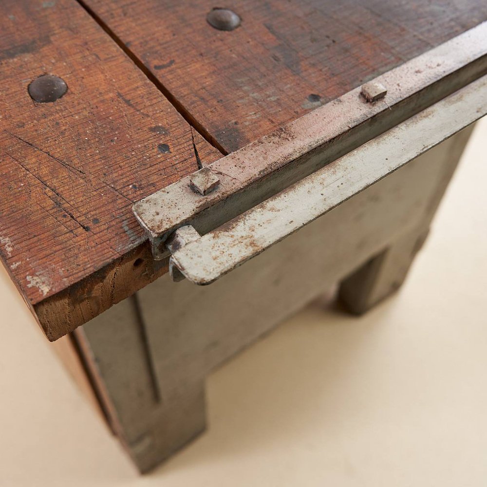 Antike Holzwerkbank mit Schraubstock und Bohrer