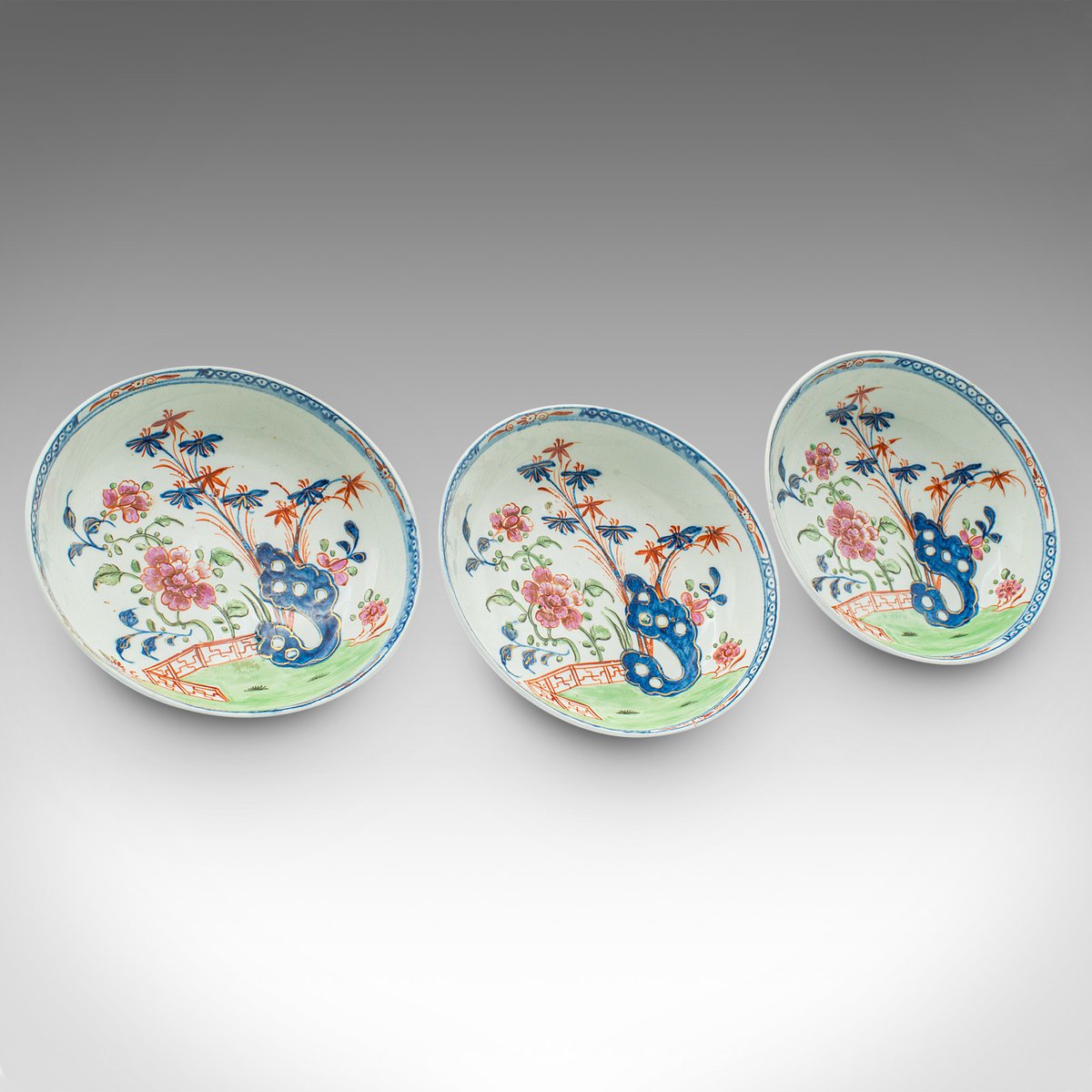 This is a sweet antique trio of small Oriental teacups, finished with a charming Famille Rose motif. Delivered ready to display.