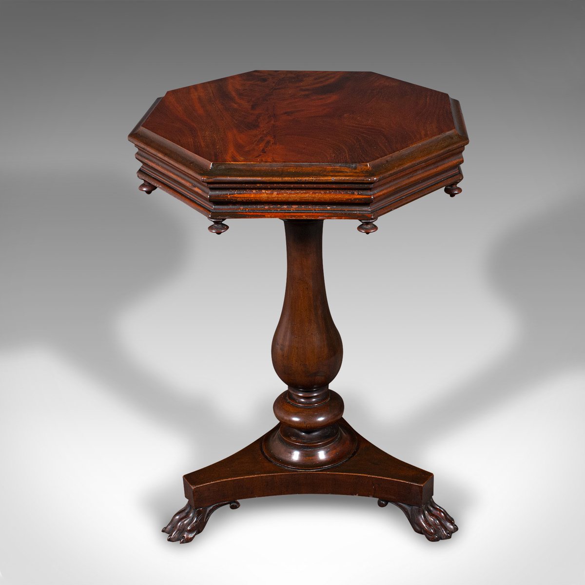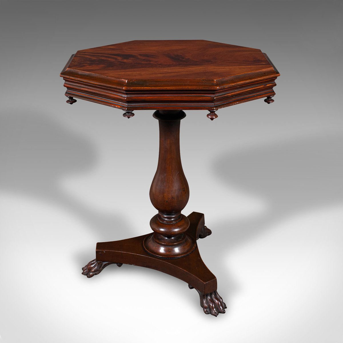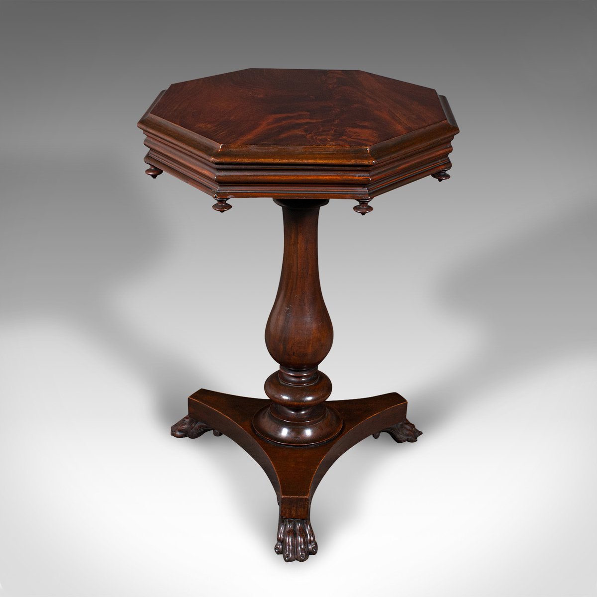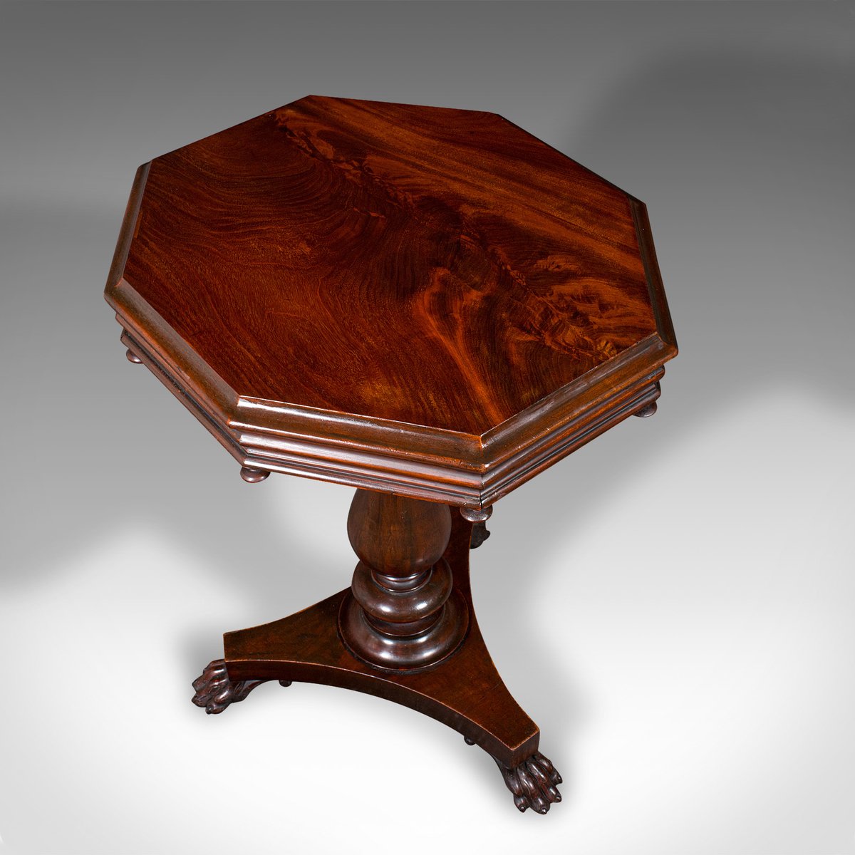 This is an antique octagonal wine table. An English, flame mahogany lamp or side table, dating to the William IV period, circa 1835.