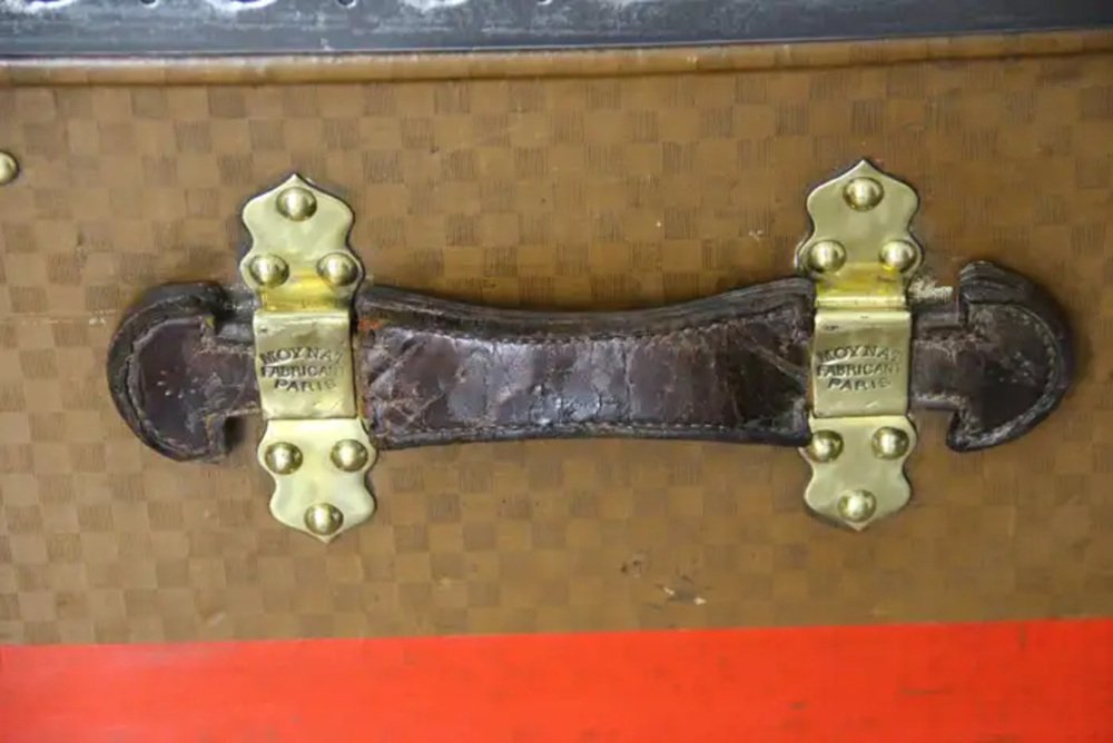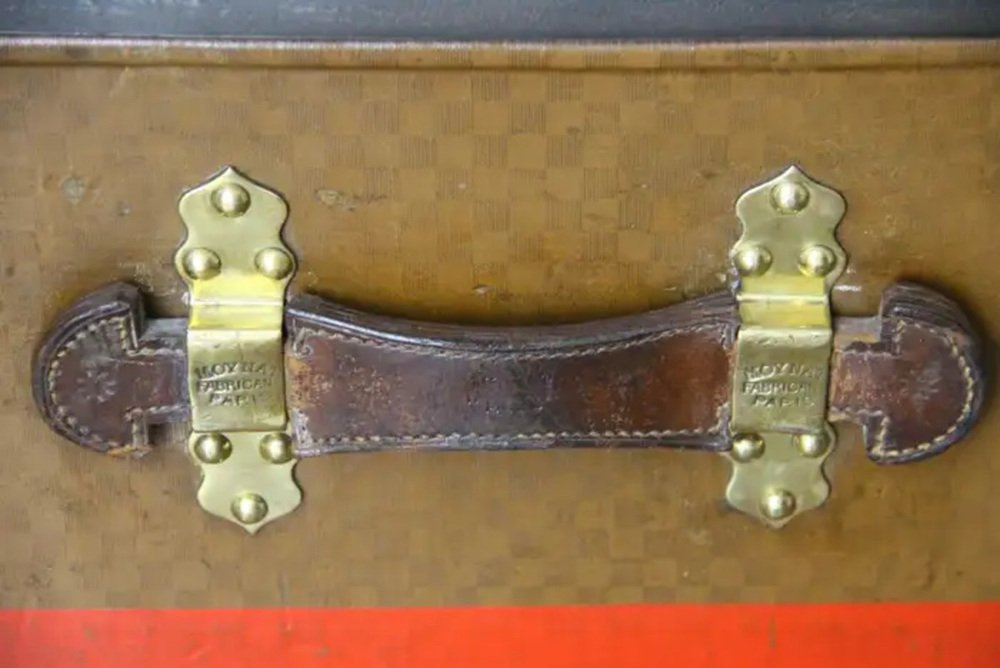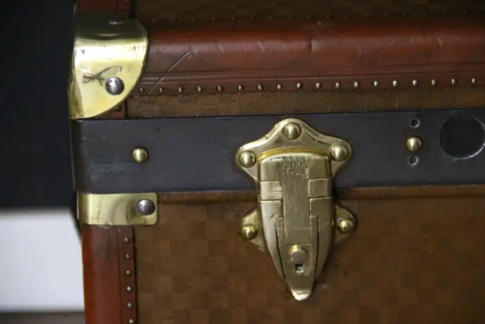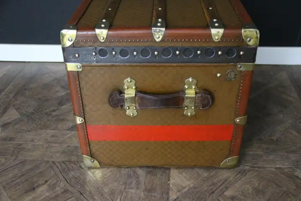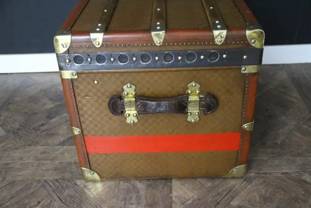 This beautiful and very rare Moynat trunk features beautiful checkers canvas, honey color leather trim, large leather side handles with stamped Moynat solid brass flanges and solid brass stamped Moynat lock and clasps. Its patina is magnificent. Moreover it has a very sought after shape. It also has got painted customized red stripes on its sides to add to its personality. Round Moynat plaque on each side.