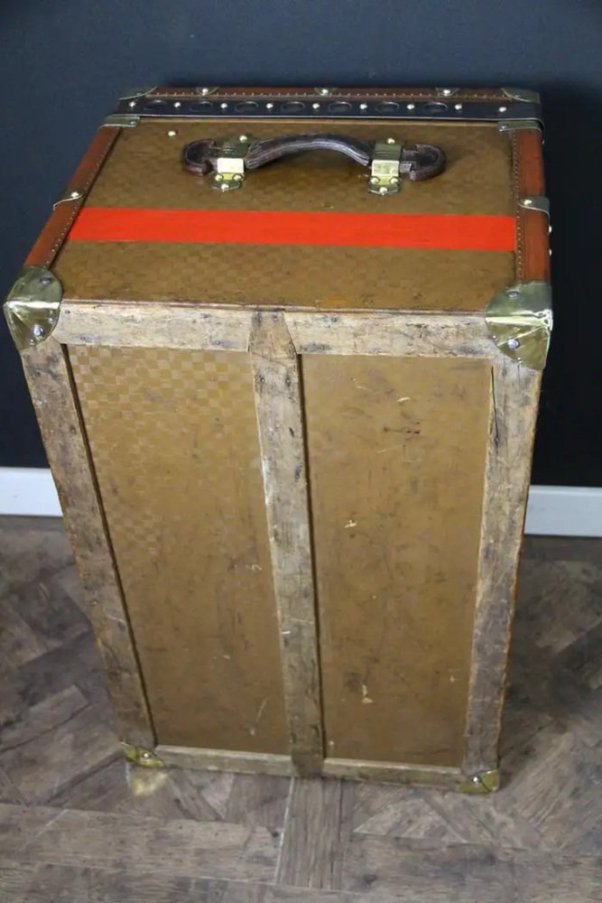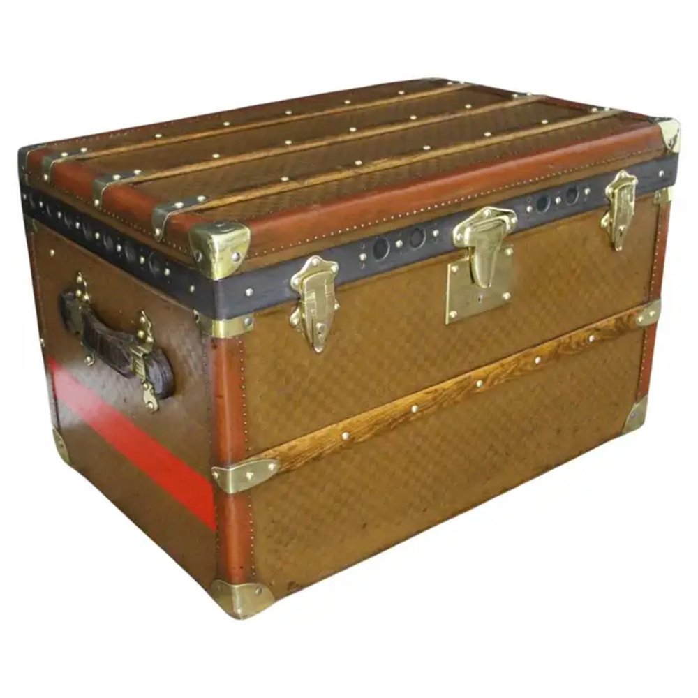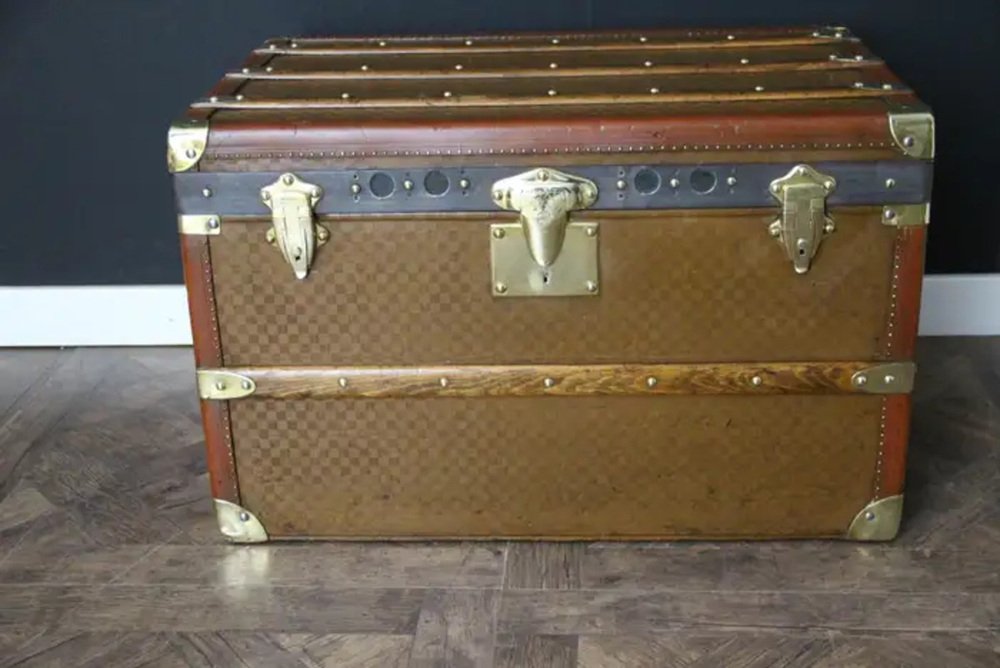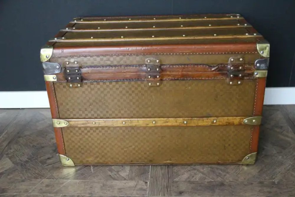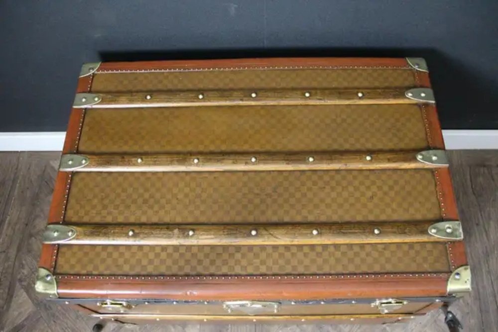 This beautiful and very rare Moynat trunk features beautiful checkers canvas, honey color leather trim, large leather side handles with stamped Moynat solid brass flanges and solid brass stamped Moynat lock and clasps. Its patina is magnificent. Moreover it has a very sought after shape. It also has got painted customized red stripes on its sides to add to its personality. Round Moynat plaque on each side.