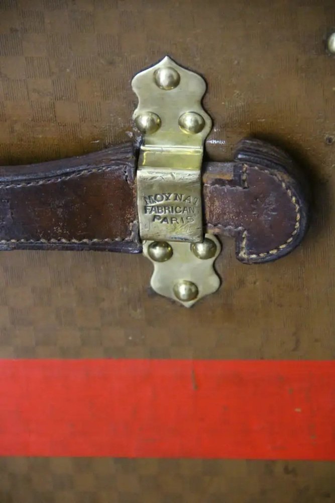 Diese schöne und sehr seltene Moynat Truhe verfügt über schöne Karos Leinwand, Honig Farbe Leder trimmen, große Leder Seitengriffe mit gestempelt Moynat massivem Messing Flansche und massivem Messing gestempelt Moynat Schloss und Schnallen. Seine Patina ist prächtig. Außerdem hat sie eine sehr begehrte Form. Die roten Streifen an den Seiten unterstreichen die Persönlichkeit der Tasche. Runde Moynat-Plakette auf jeder Seite.