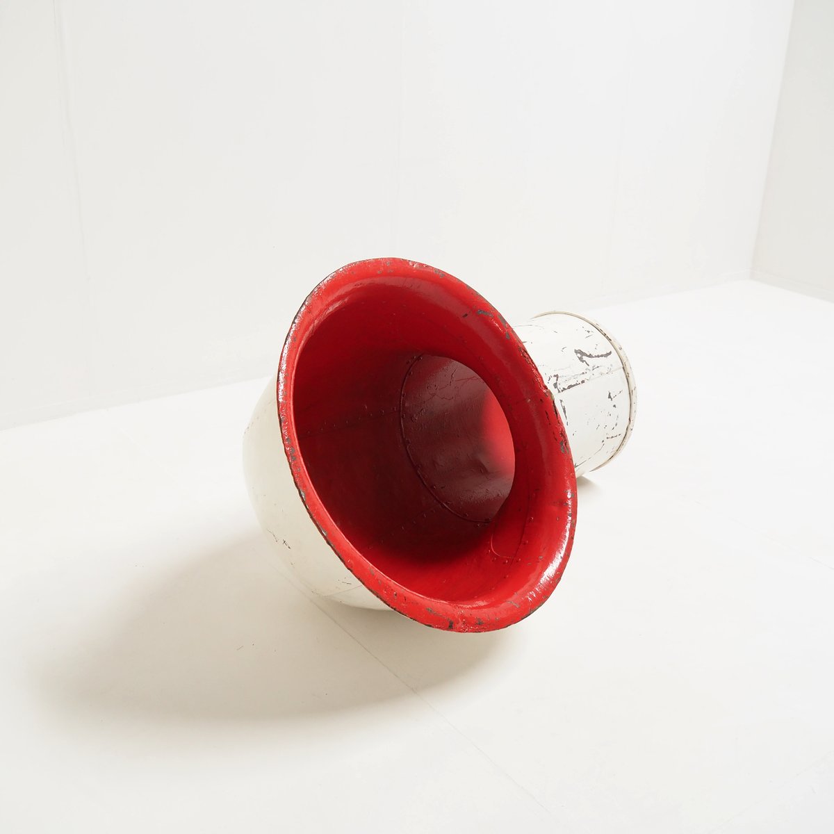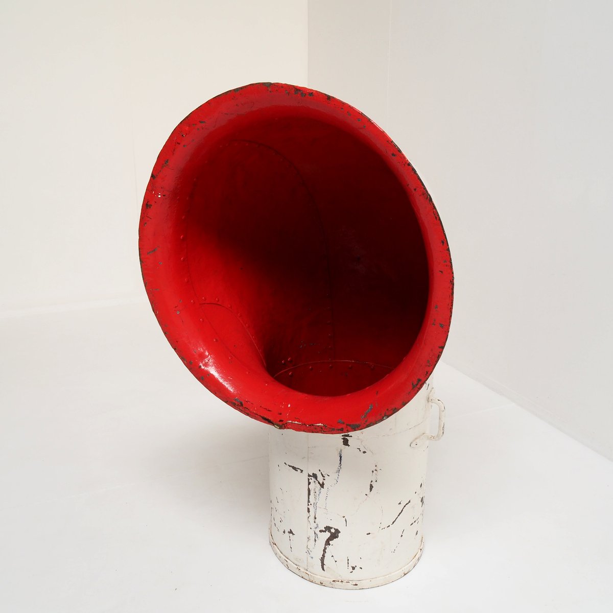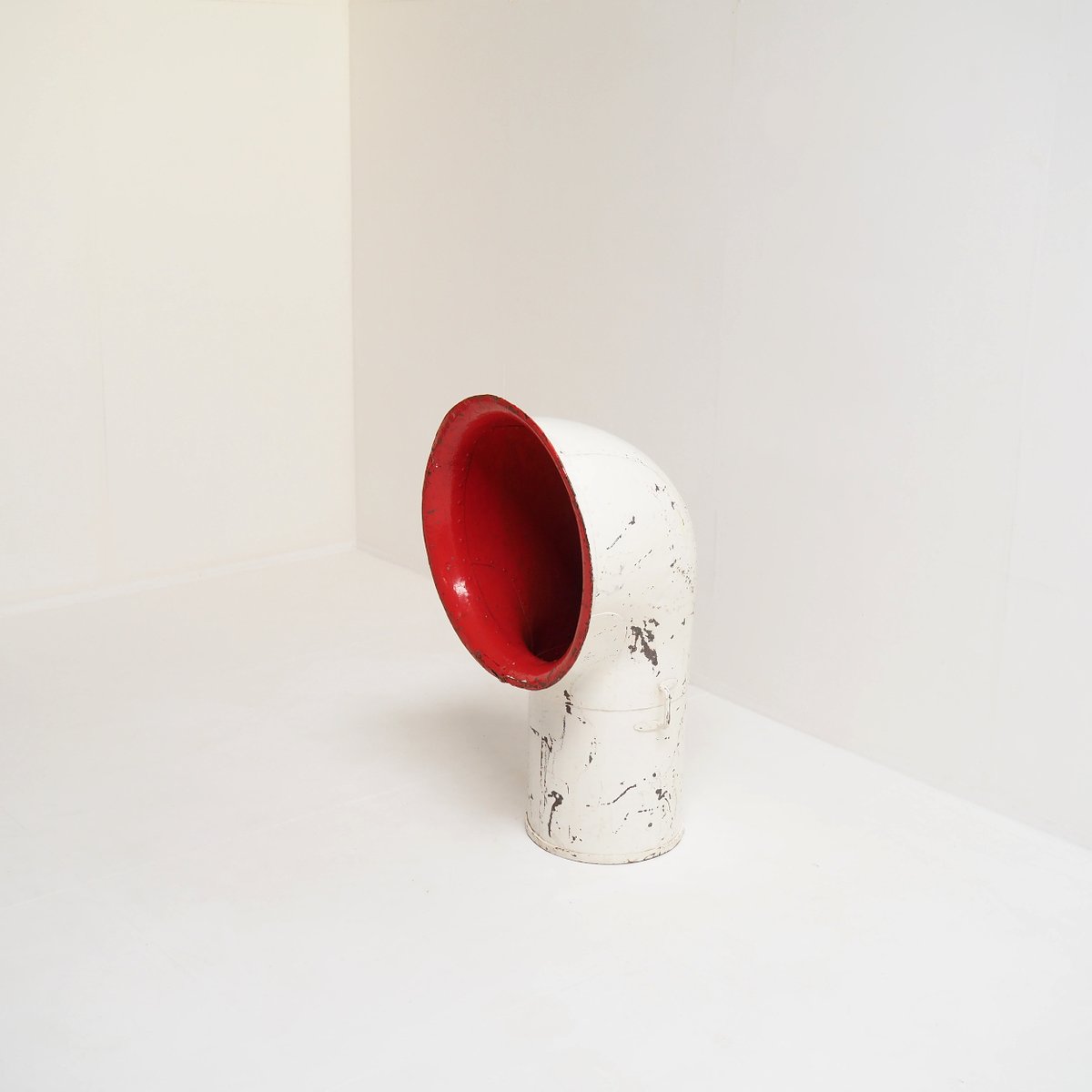 Its bold, curved shape and original white paint, contrasted with a bright cherry red interior, create a captivating industrial aesthetic that effortlessly bridges the gap between history and contemporary design.