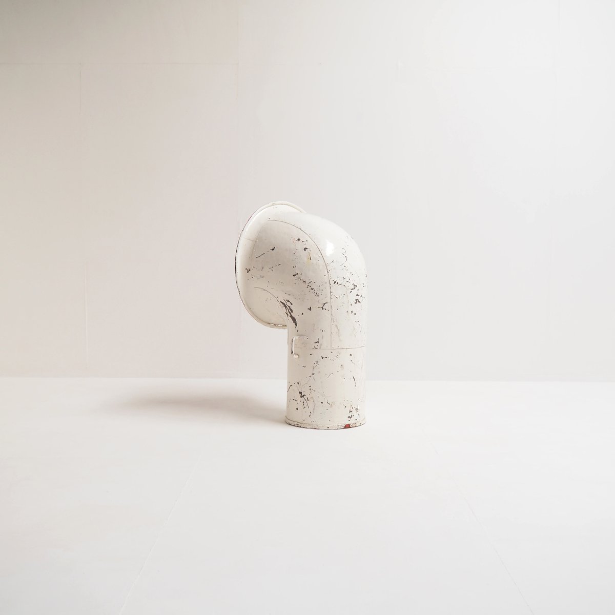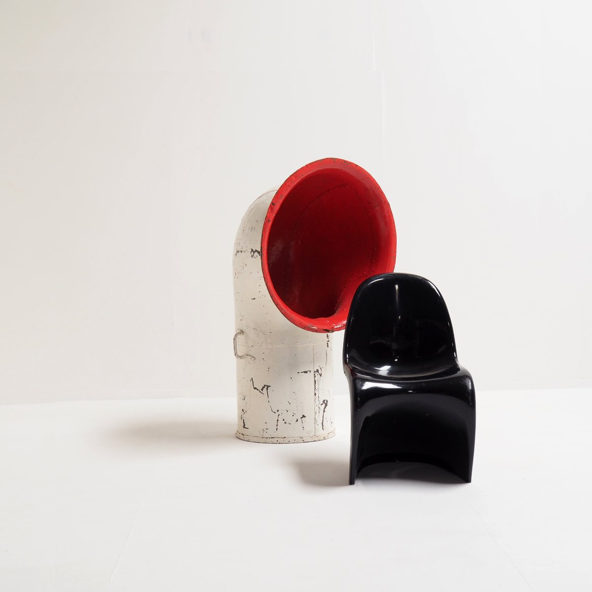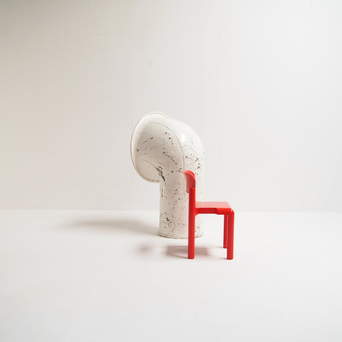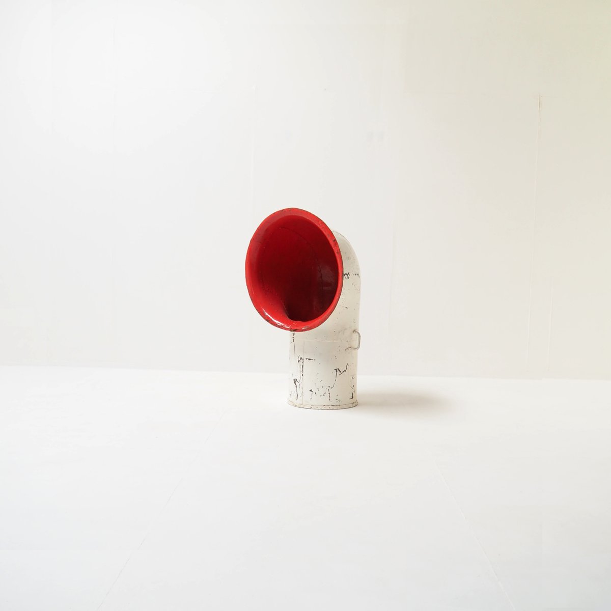 Its bold, curved shape and original white paint, contrasted with a bright cherry red interior, create a captivating industrial aesthetic that effortlessly bridges the gap between history and contemporary design.