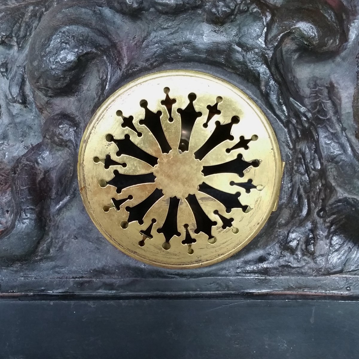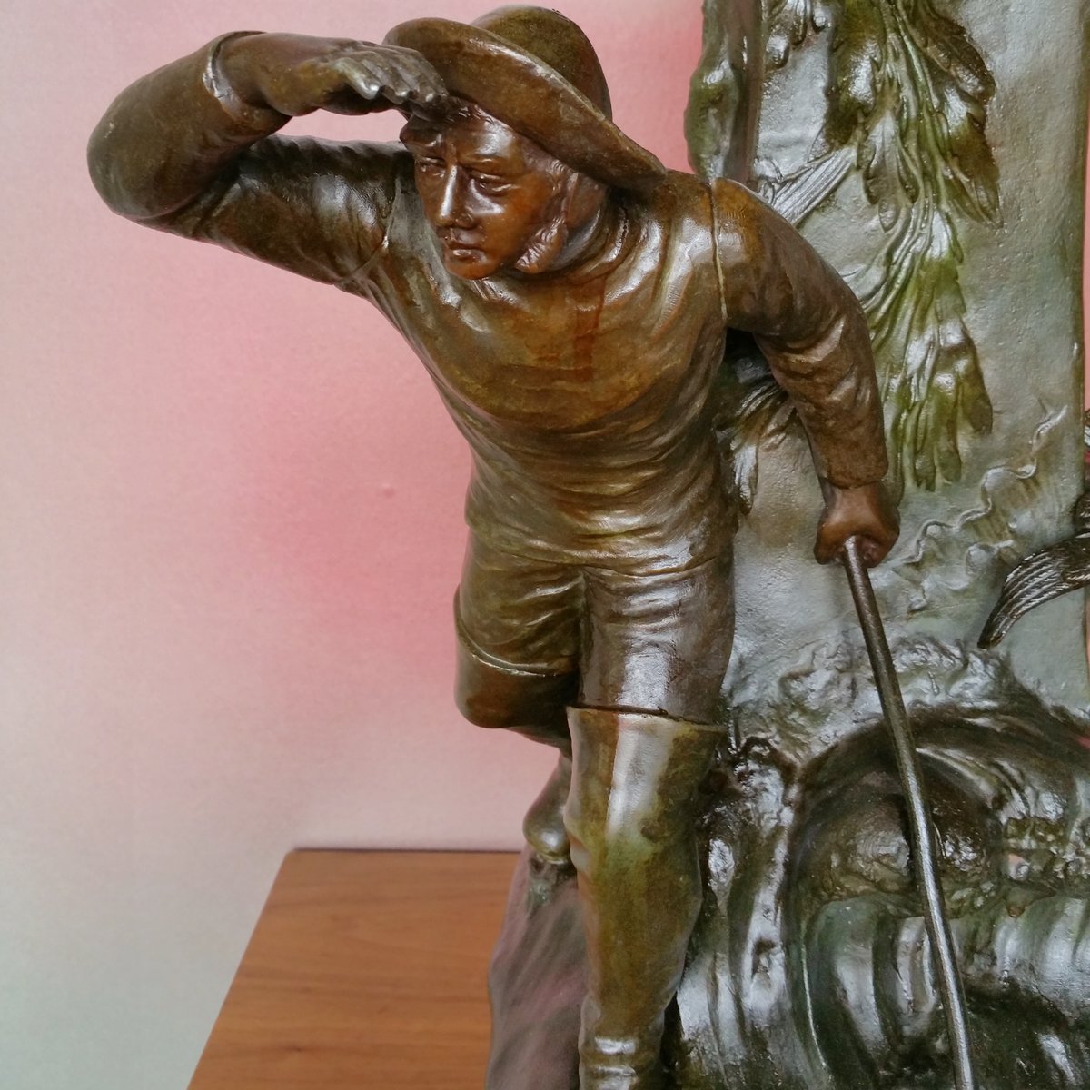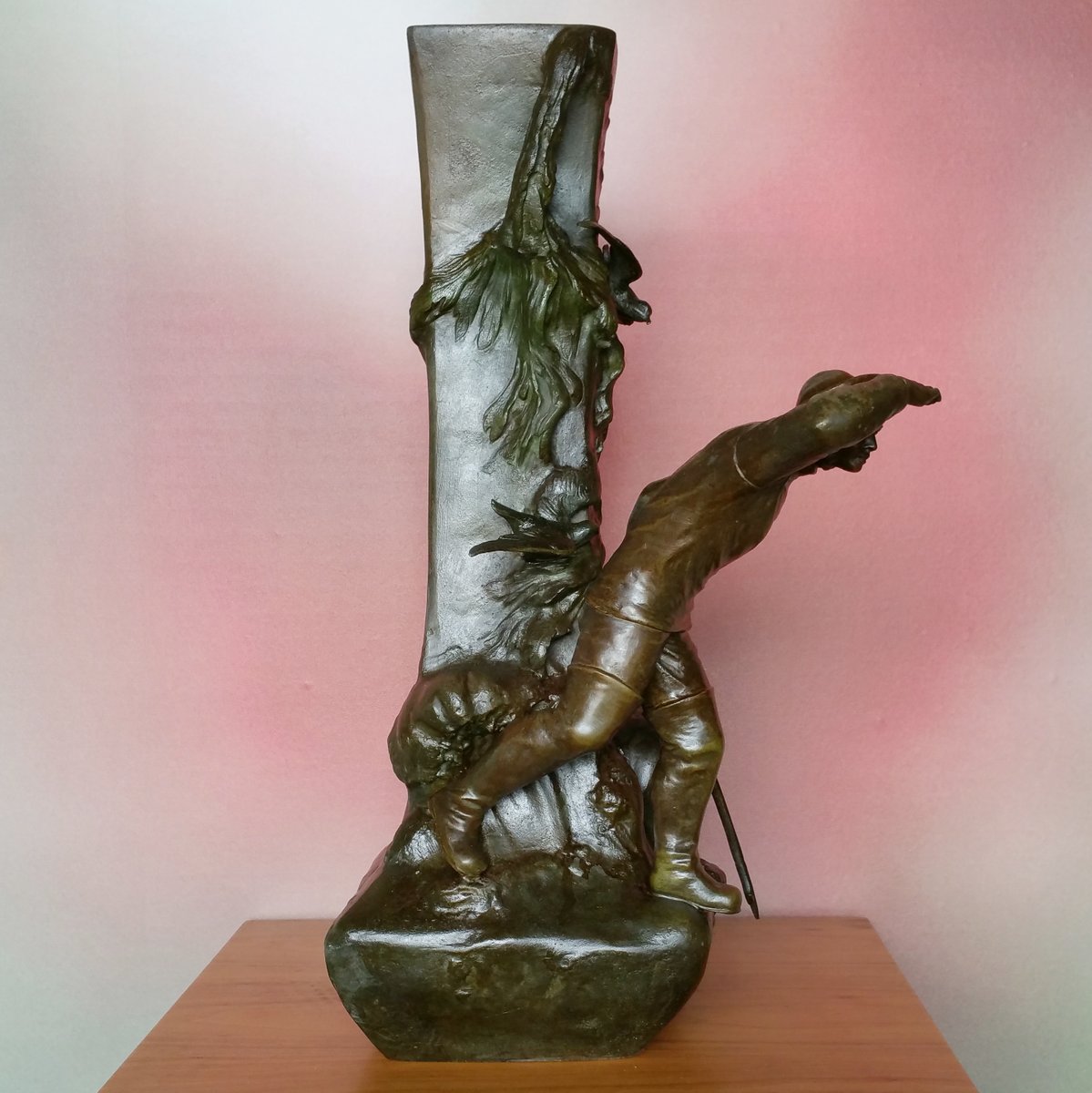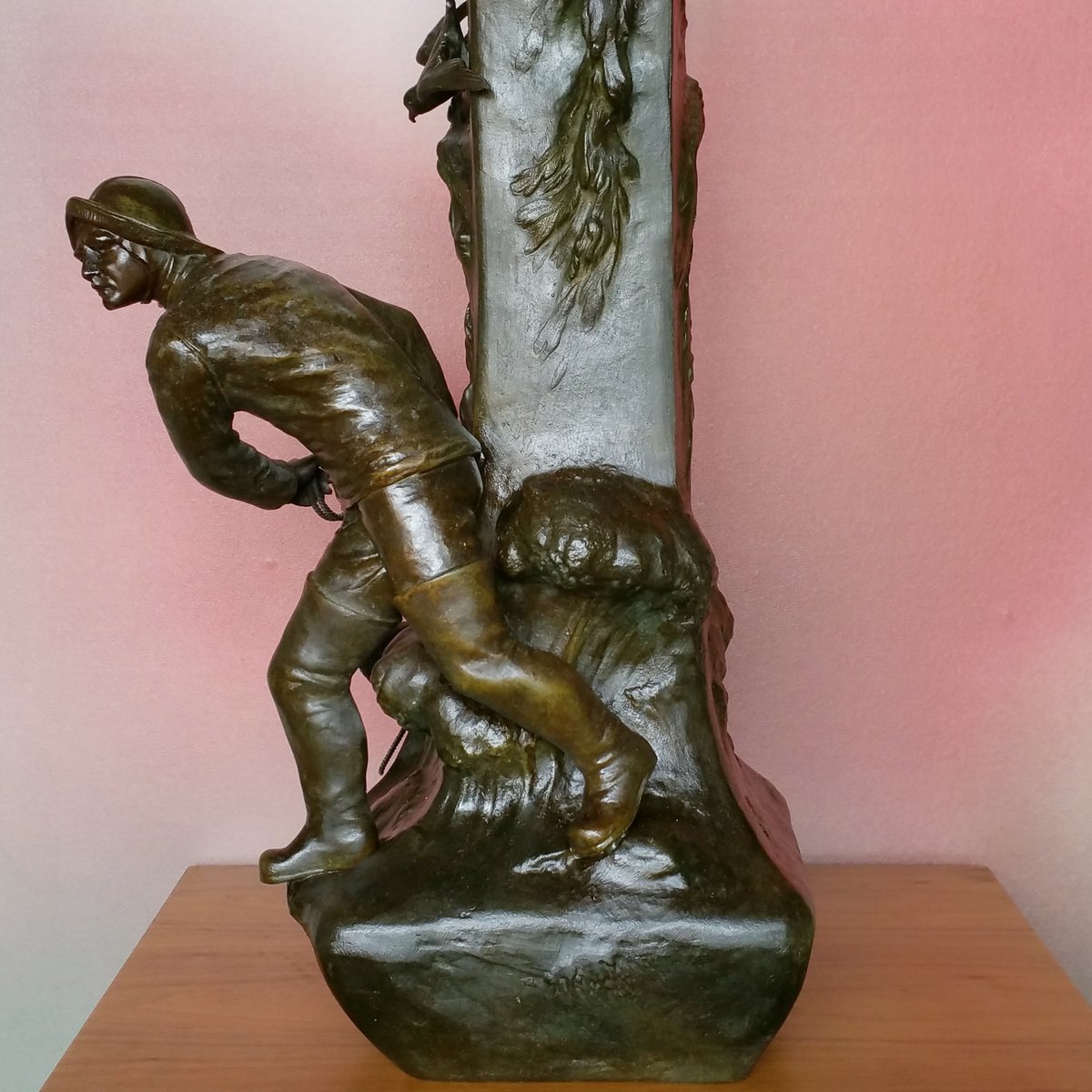 This clock with a large sculpture of Neptune (total height 87 cm) was acquired as a set with two vases with figures of whalers. Though the pieces have the same theme, the sea, they are different in style. The sculpture and vases are made of spelter (a die cast metal with a bronze coating) and are in good condition. The clock (A la Renaissance, 49. Boulevard St. Martin, Paris) is in working order and with keys. The designer of the vases is not known. The Neptune clock measures height 87 cm, width 51 cm, and depth 38 cm, while the vase measurements are below, with the smaller piece measuring 29 cm in width, and 33 cm in depth.
