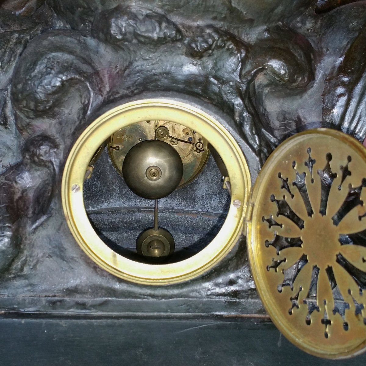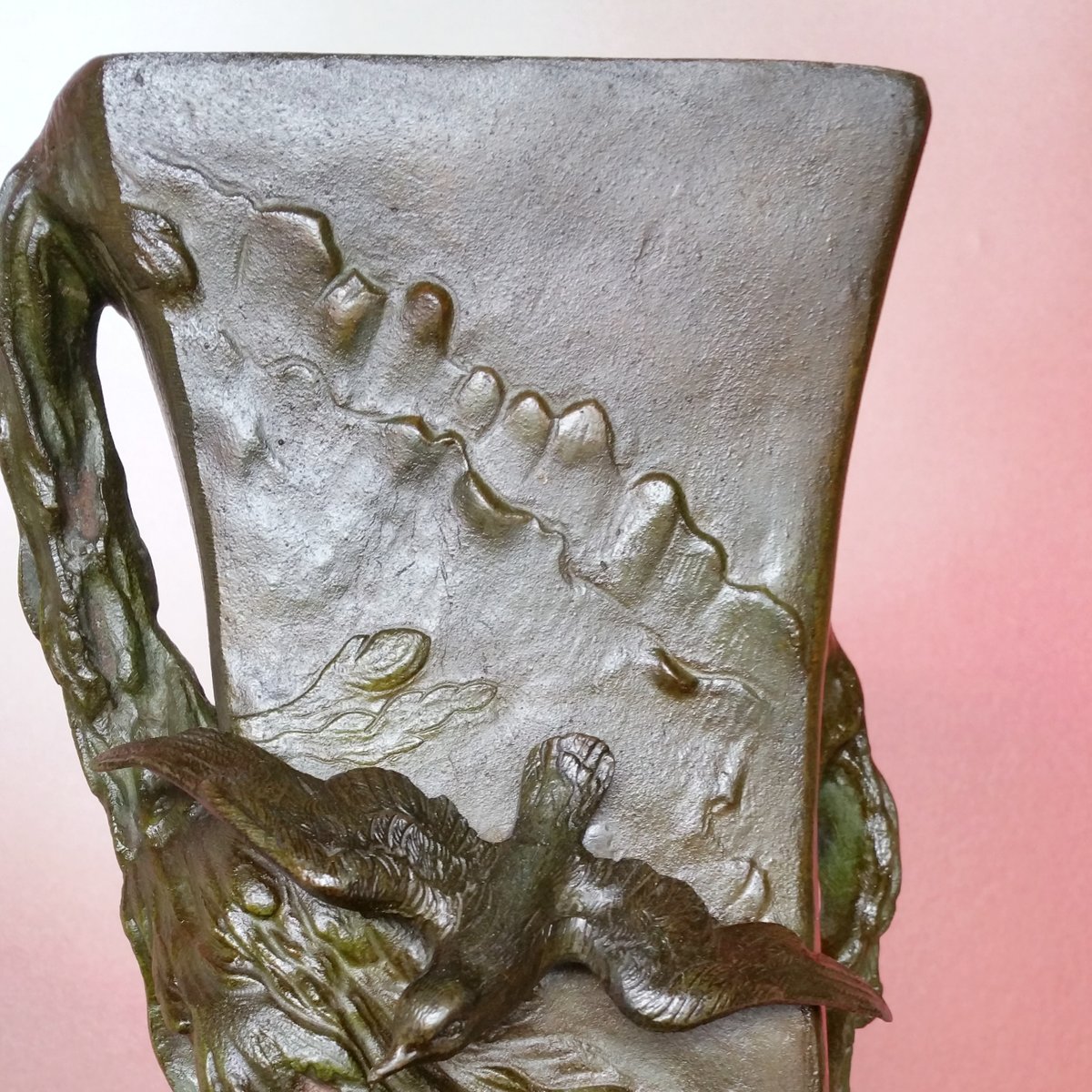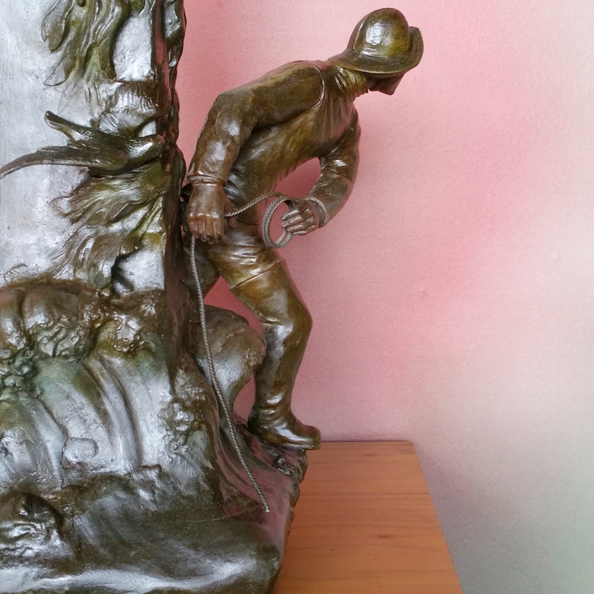 This clock with a large sculpture of Neptune (total height 87 cm) was acquired as a set with two vases with figures of whalers. Though the pieces have the same theme, the sea, they are different in style. The sculpture and vases are made of spelter (a die cast metal with a bronze coating) and are in good condition. The clock (A la Renaissance, 49. Boulevard St. Martin, Paris) is in working order and with keys. The designer of the vases is not known. The Neptune clock measures height 87 cm, width 51 cm, and depth 38 cm, while the vase measurements are below, with the smaller piece measuring 29 cm in width, and 33 cm in depth.
