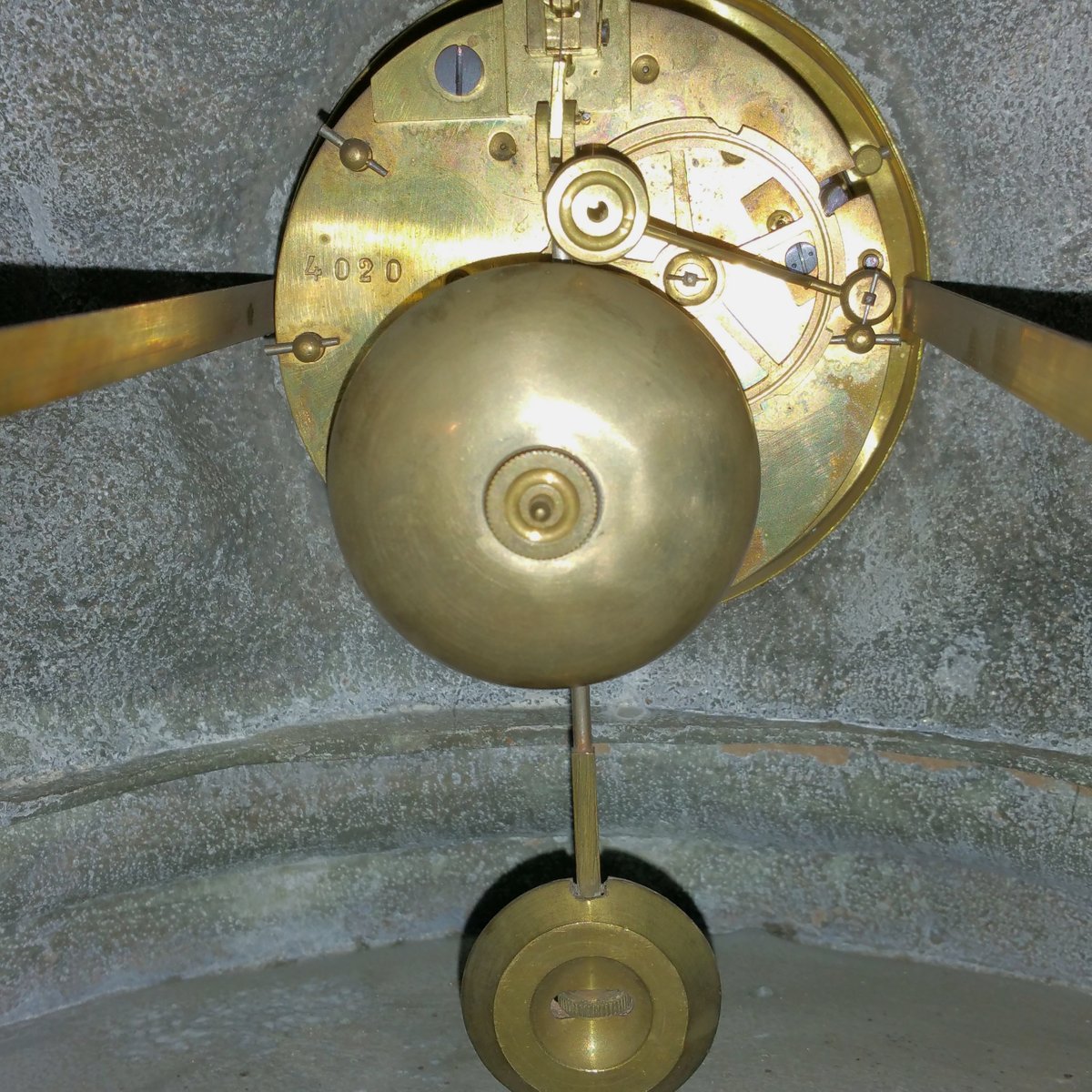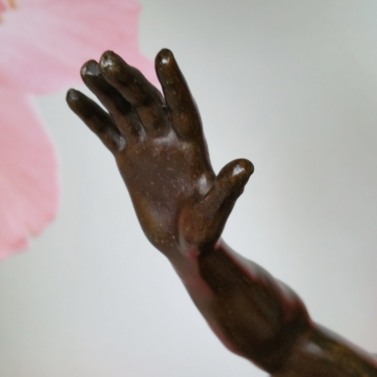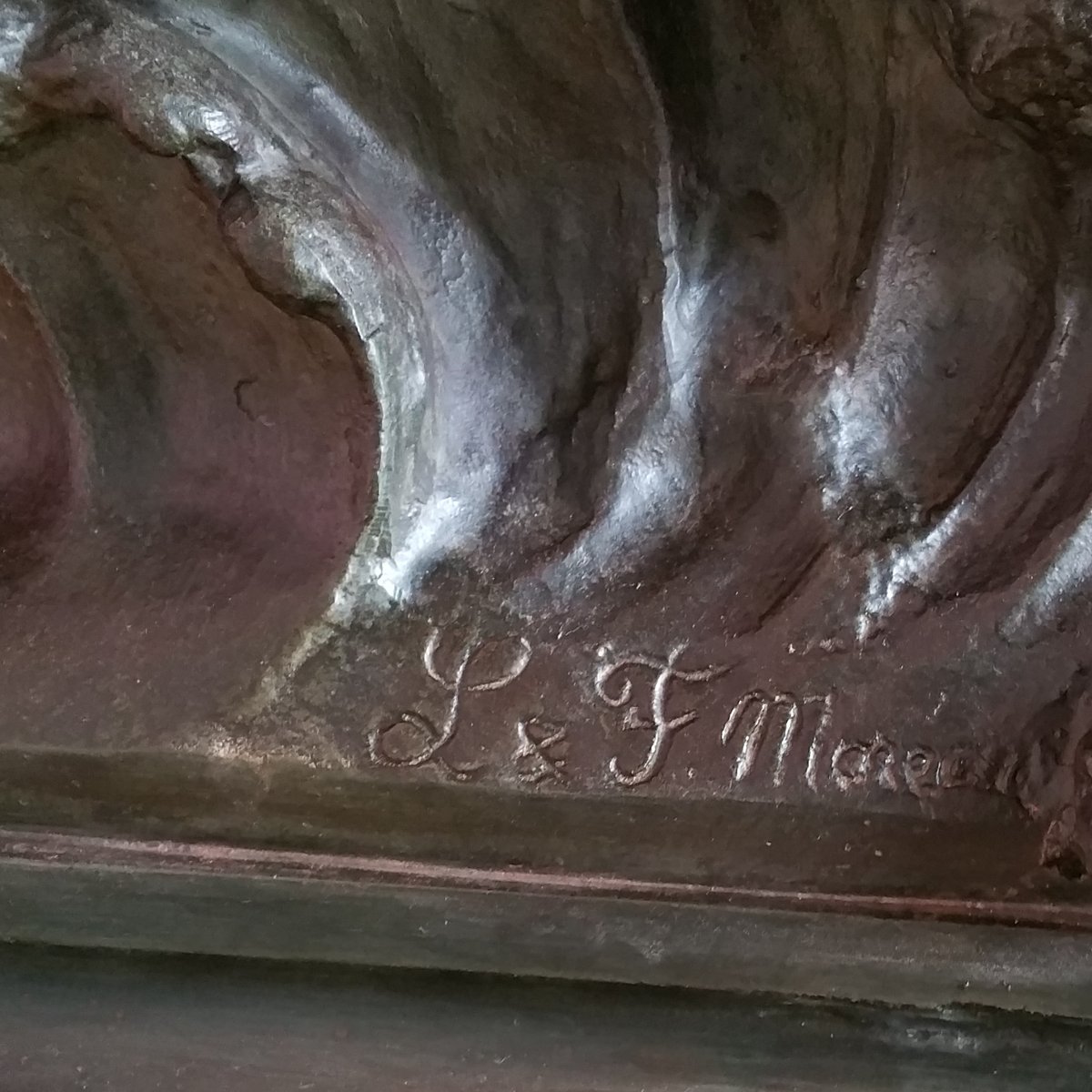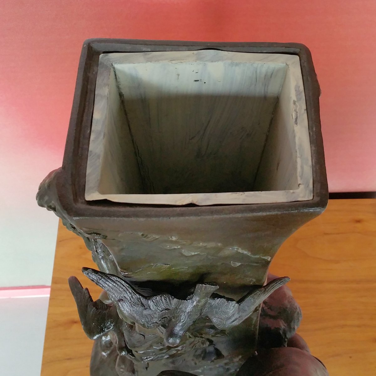 This clock with a large sculpture of Neptune (total height 87 cm) was acquired as a set with two vases with figures of whalers. Though the pieces have the same theme, the sea, they are different in style. The sculpture and vases are made of spelter (a die cast metal with a bronze coating) and are in good condition. The clock (A la Renaissance, 49. Boulevard St. Martin, Paris) is in working order and with keys. The designer of the vases is not known. The Neptune clock measures height 87 cm, width 51 cm, and depth 38 cm, while the vase measurements are below, with the smaller piece measuring 29 cm in width, and 33 cm in depth.