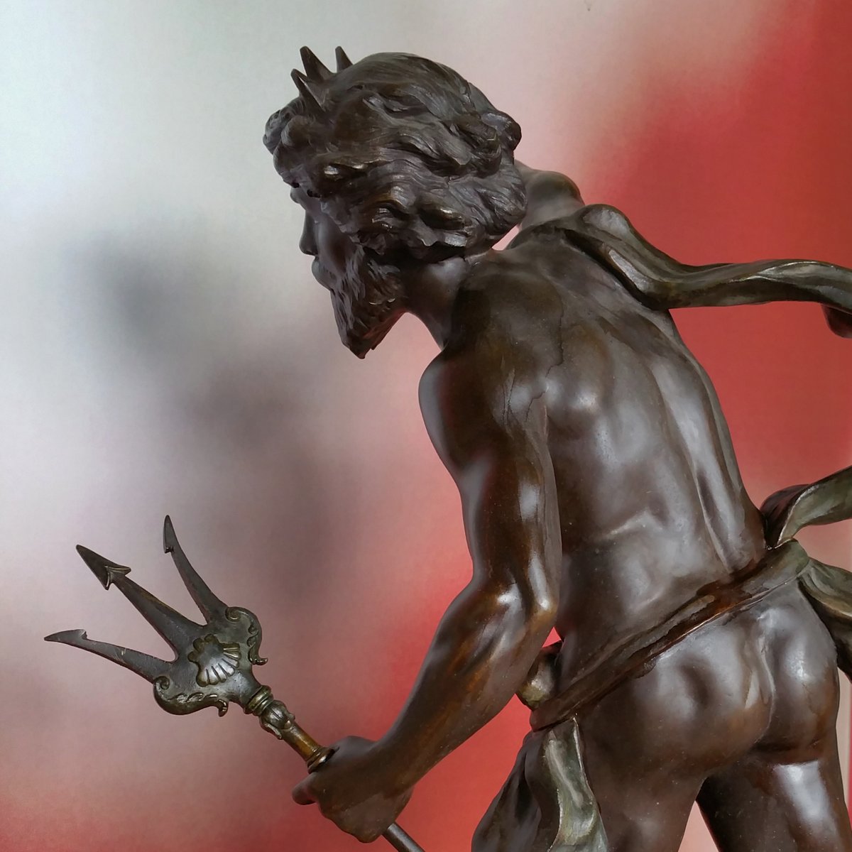 Diese Uhr mit einer großen Neptun-Skulptur (Gesamthöhe 87 cm) wurde als Set mit zwei Vasen mit Walfängerfiguren erworben. Obwohl die Stücke das gleiche Thema haben, das Meer, sind sie in ihrem Stil unterschiedlich. Die Skulptur und die Vasen sind aus Spelter (einem druckgegossenen Metall mit Bronzeüberzug) und befinden sich in gutem Zustand. Die Uhr (A la Renaissance, 49. Boulevard St. Martin, Paris) ist funktionstüchtig und hat Schlüssel. Der Designer der Vasen ist nicht bekannt. Die Neptun-Uhr misst 87 cm in der Höhe, 51 cm in der Breite und 38 cm in der Tiefe, während die Vase unten abgebildet ist, wobei das kleinere Stück 29 cm in der Breite und 33 cm in der Tiefe misst.