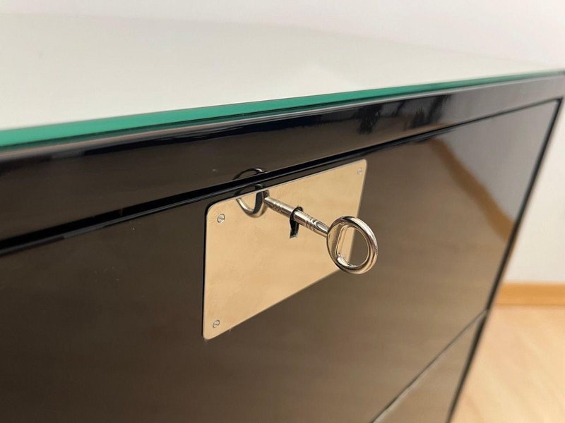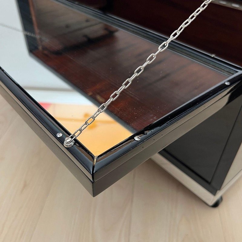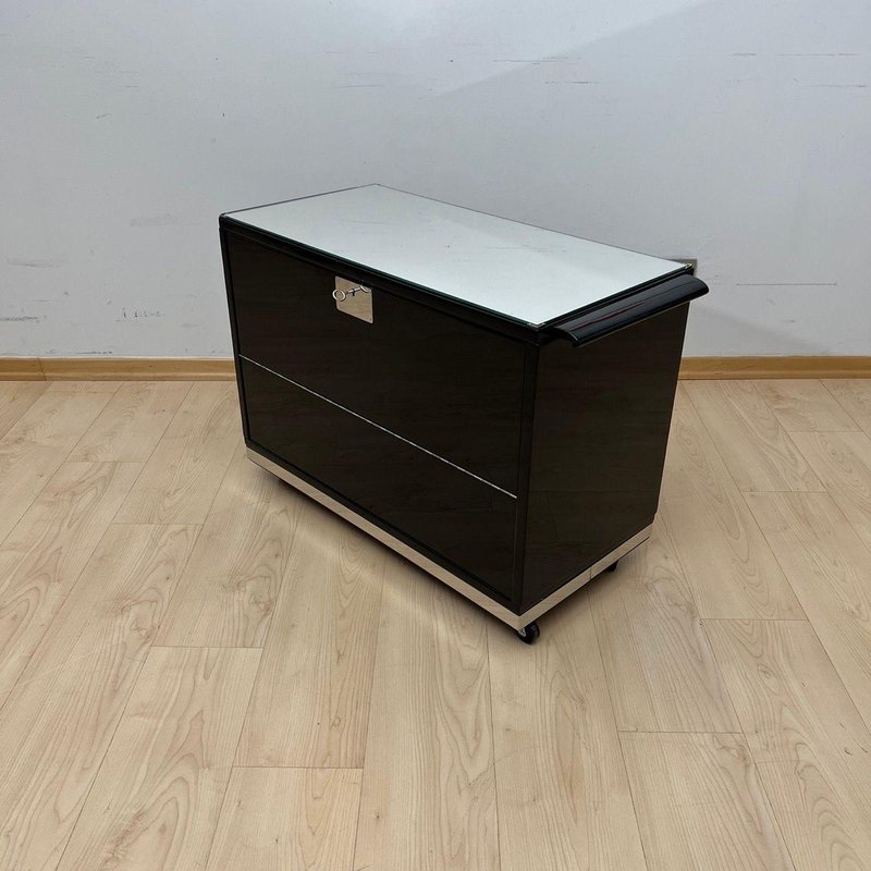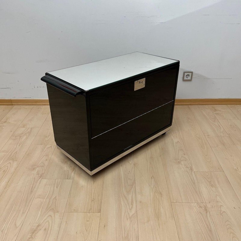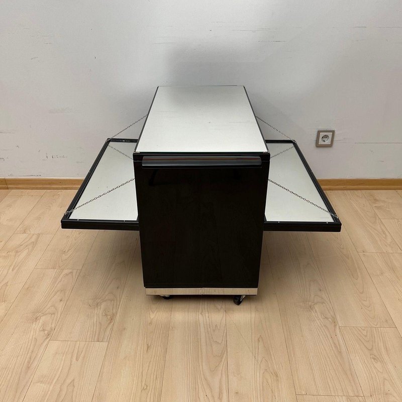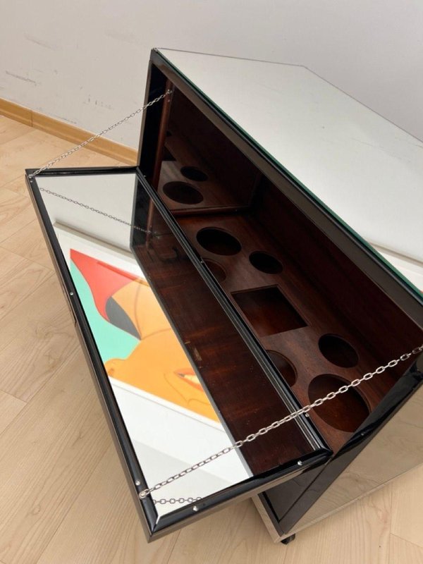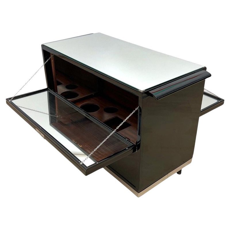 Exterior lacquered inn black and polished to a high gloss. Chrome-plated metal parts and polished stainless steel trim around the bottom. Top with mirror glass framed by metal corners. Two hinged doors on the sides, which also serve as storage shelf, with mirror glass, metal chains, and original locks. Original mahogany interior compartments for bottles and glasses, with framed mirrors on the left and right. Mobile on four wheels. Dimensions: