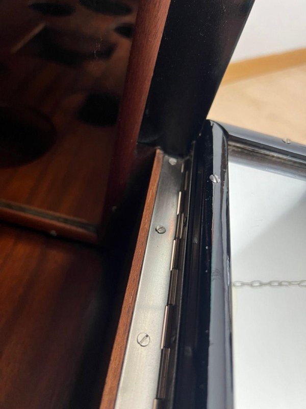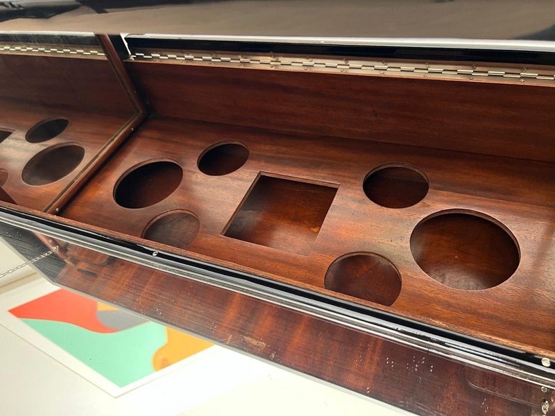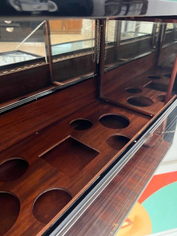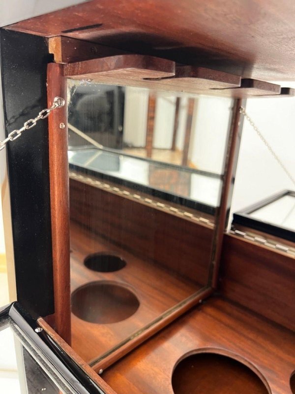 Außen in Schwarz lackiert und auf Hochglanz poliert. Verchromte Metallteile und polierte Edelstahleinfassung an der Unterseite. Oberteil mit Spiegelglas, umrahmt von Metallecken. Zwei Flügeltüren an den Seiten, die auch als Ablagefläche dienen, mit Spiegelglas, Metallketten und Originalschlössern. Originale Mahagoni-Innenfächer für Flaschen und Gläser, mit gerahmten Spiegeln links und rechts. Fahrbar auf vier Rädern. Abmessungen: