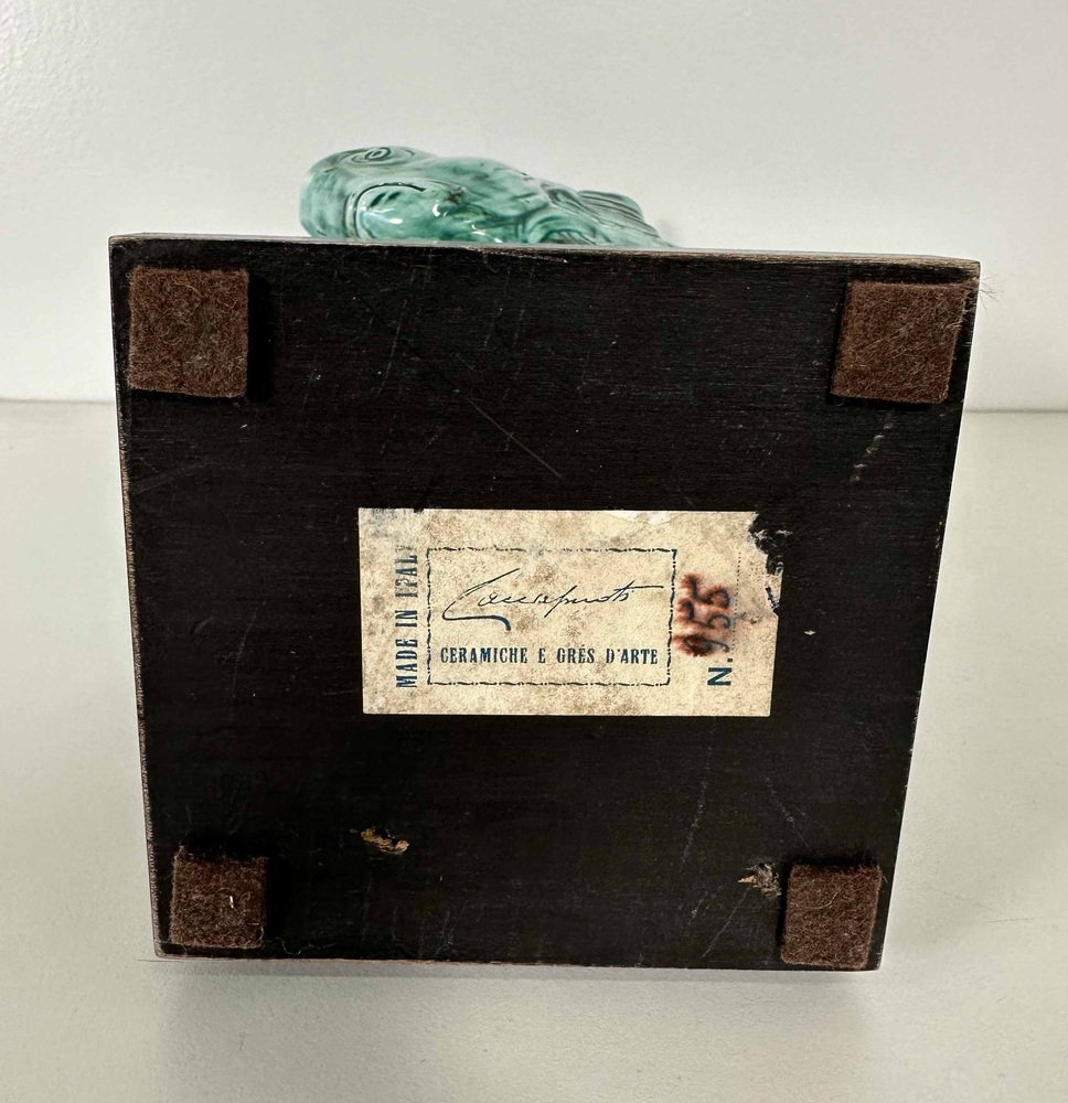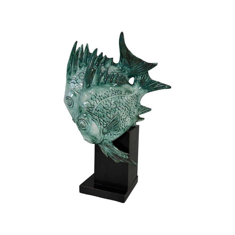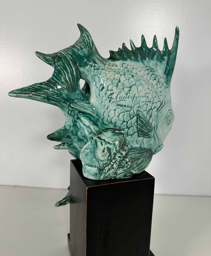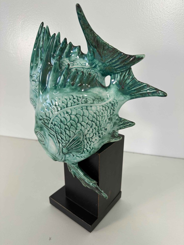 Art Deco Fischskulptur aus hellblauem Porzellan & ebonisiertem Holz von G. Cacciapuoti, 1930er