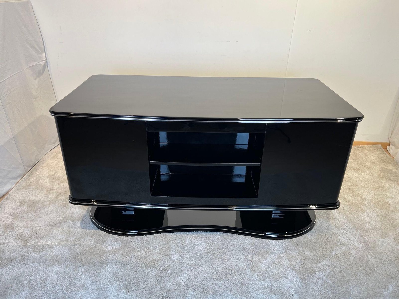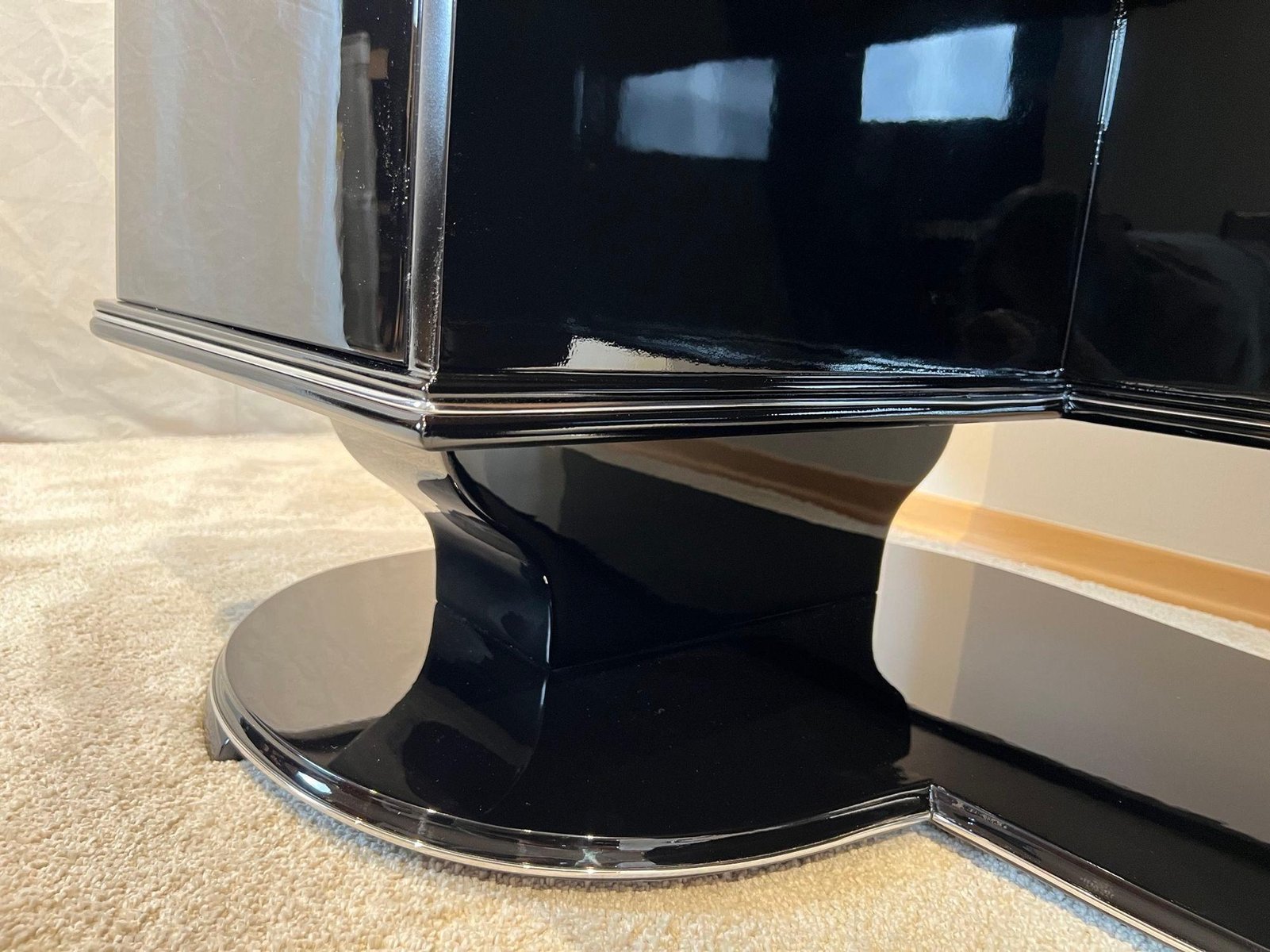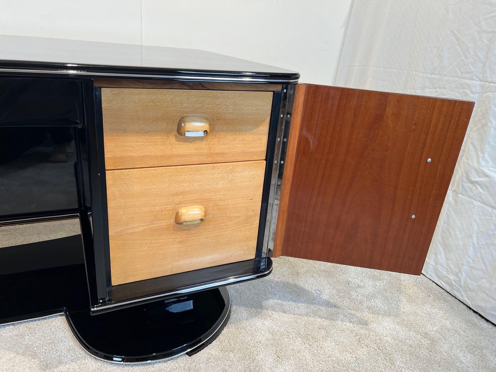 Large Art Deco desk in black lacquer with chrome details from France, 1950s. High quality restoration with black high gloss polished piano lacquer on mahogany body. Standing on a beautiful large, curved floor base. Chrome-plated handles and metal panels. Silver-colored decorative bands at the bottom, middle and top. Two doors, one central drawer, free compartment on the back with one black shelf. Doors inside in lacquered mahogany with chrome-plated long hinges. Inside on the left there are two long mahogany pull-out boards. In the middle there is a drawer in made in beech, mahogany and walnut wood. On the right, two long drawers in bright maple wood with wooden handles. Three chrome-plated keys, both doors and the drawer can be locked with original newly chrome-plated locks. Dimensions: H 77.5 cm x W 155 cm x D 80 cm x footwell H 66 cm H 30.5“ x W 61“ x D 31,5“ x footwell H 26“