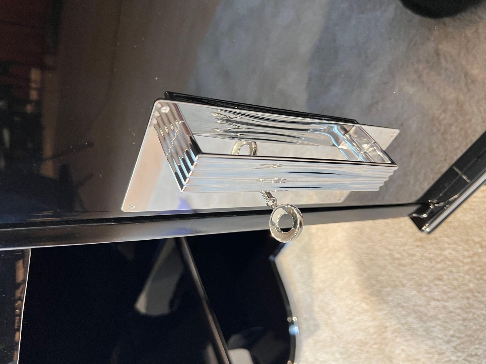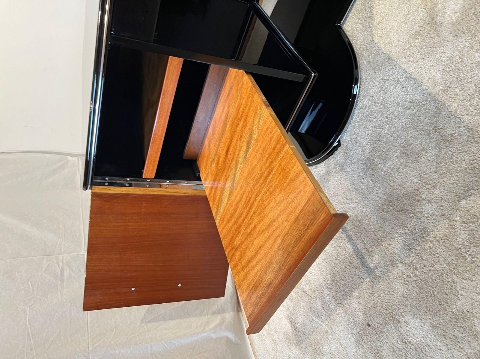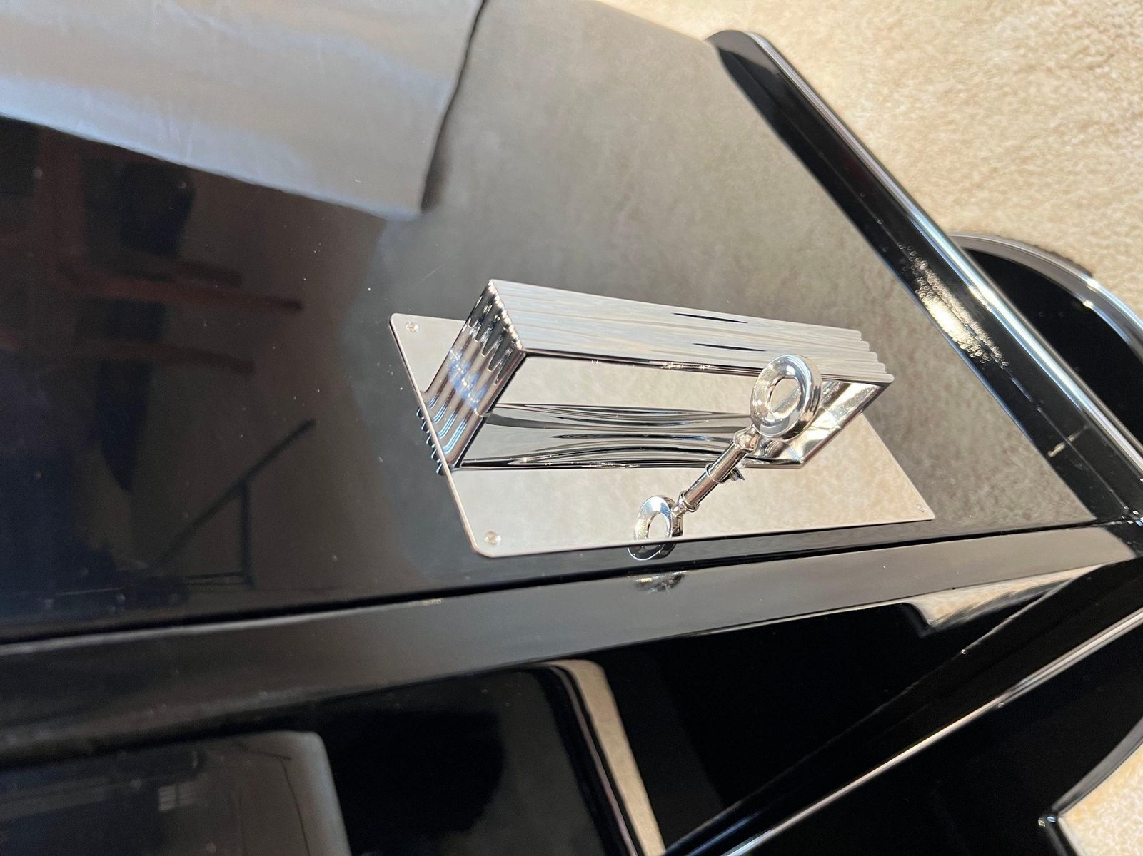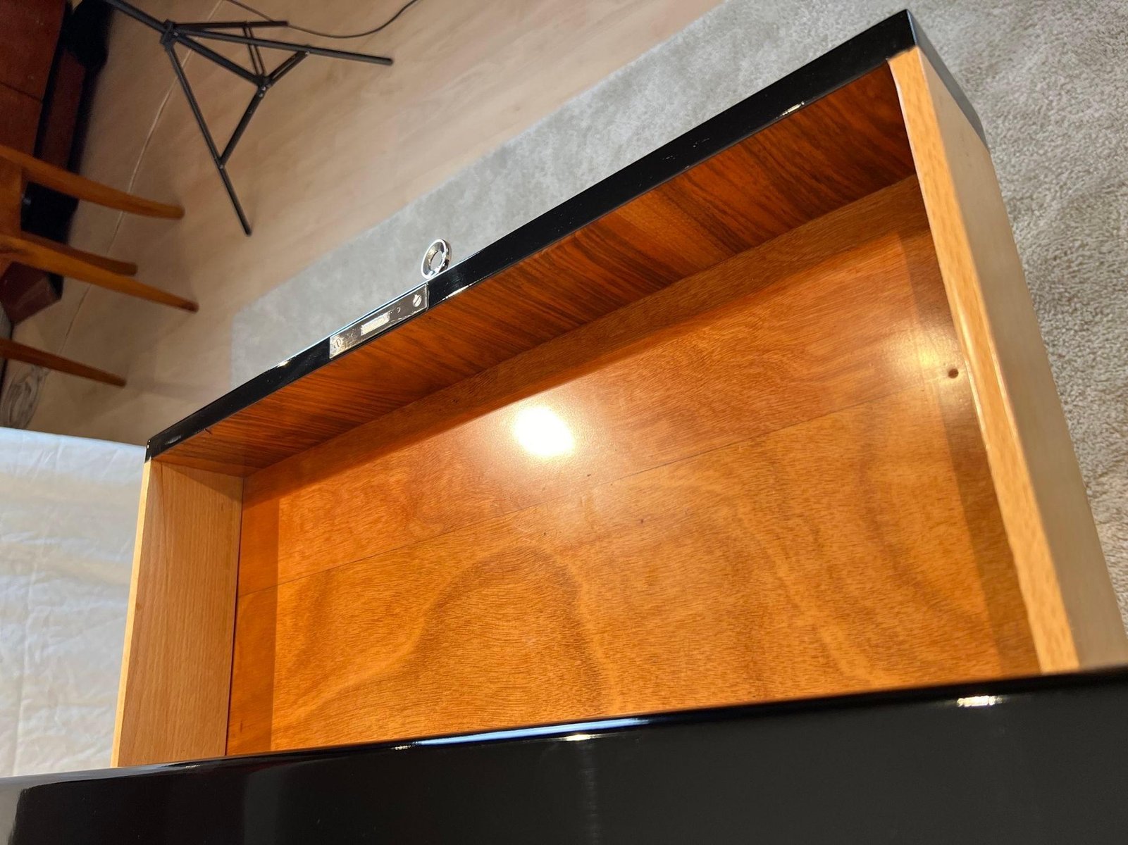 Large Art Deco desk in black lacquer with chrome details from France, 1950s. High quality restoration with black high gloss polished piano lacquer on mahogany body. Standing on a beautiful large, curved floor base. Chrome-plated handles and metal panels. Silver-colored decorative bands at the bottom, middle and top. Two doors, one central drawer, free compartment on the back with one black shelf. Doors inside in lacquered mahogany with chrome-plated long hinges. Inside on the left there are two long mahogany pull-out boards. In the middle there is a drawer in made in beech, mahogany and walnut wood. On the right, two long drawers in bright maple wood with wooden handles. Three chrome-plated keys, both doors and the drawer can be locked with original newly chrome-plated locks. Dimensions: H 77.5 cm x W 155 cm x D 80 cm x footwell H 66 cm H 30.5“ x W 61“ x D 31,5“ x footwell H 26“