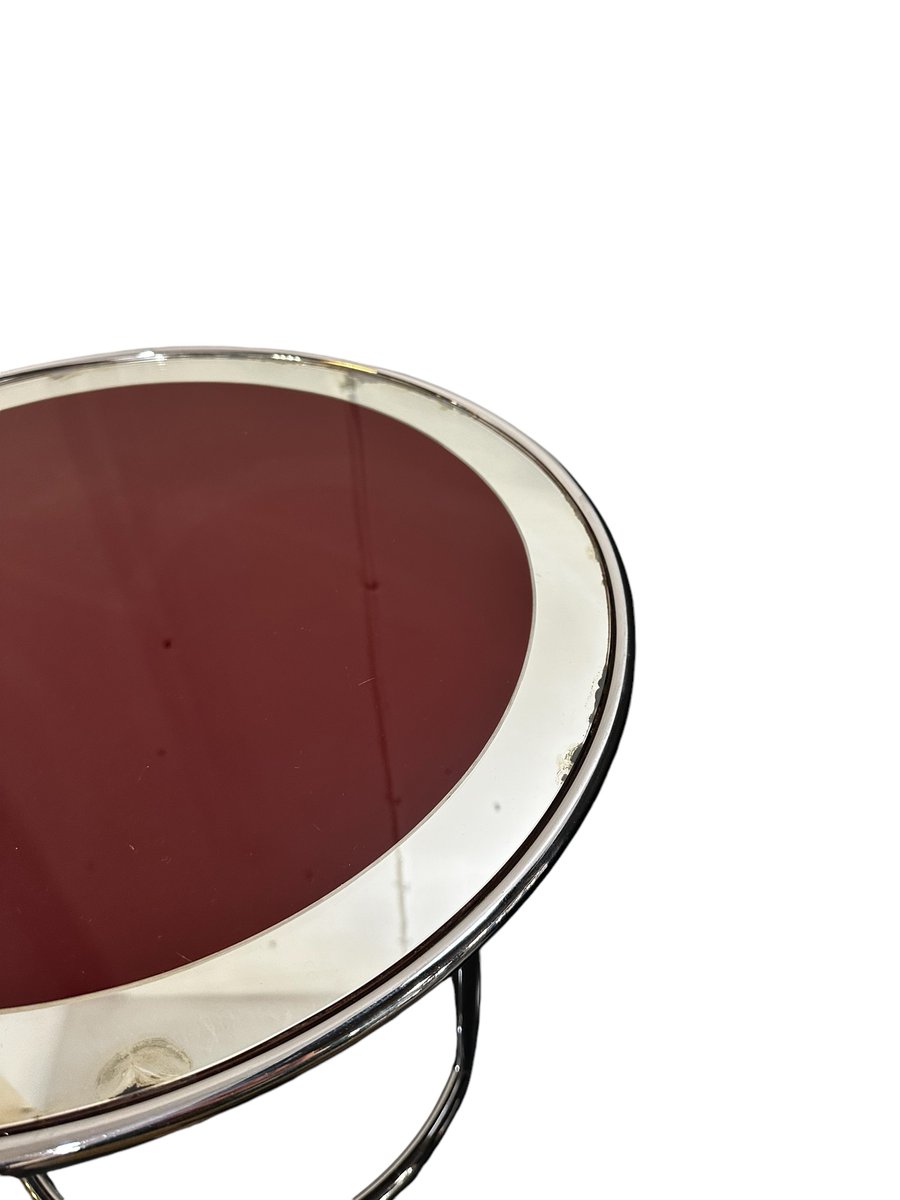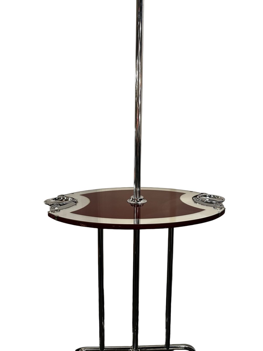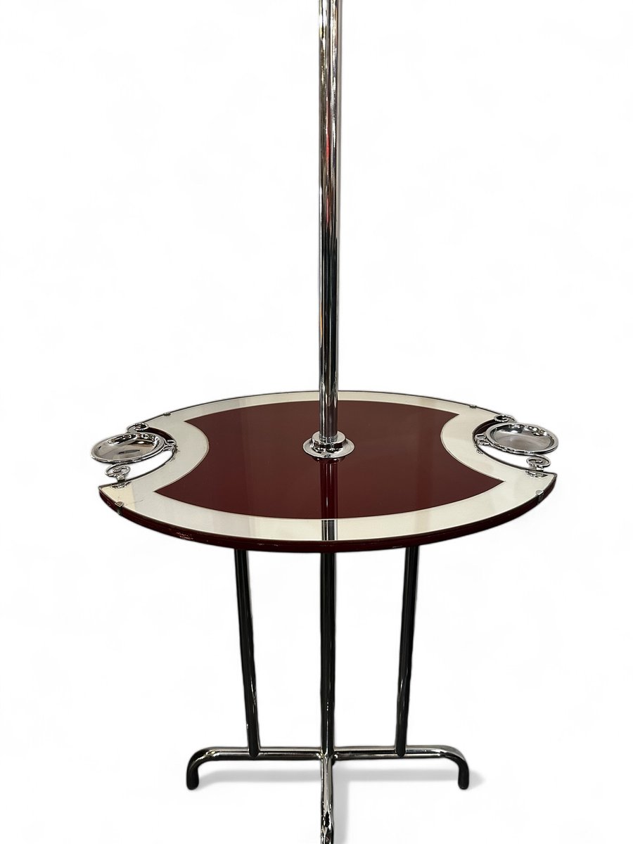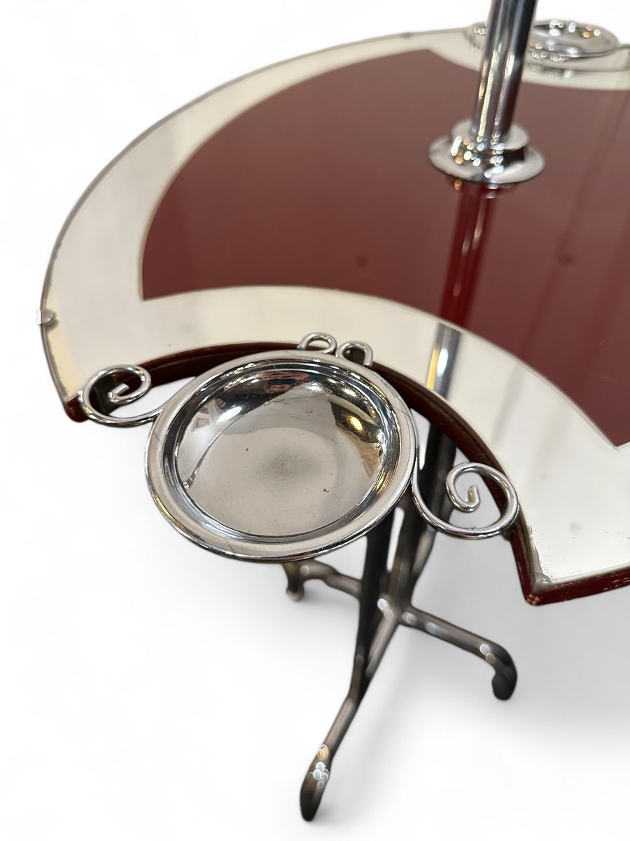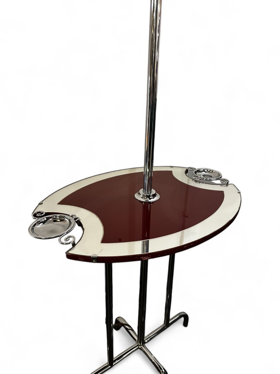 Hervorragender antiker Zustand, das Chrom ist schön poliert, das Licht ist voll funktionsfähig, die Tabletts sind in Takt, die Spiegel sind an den Rändern nicht geknickt, der gemalte Spiegel und Burgunder auf dem kleinen Tisch haben einige sichtbare Alterung, der Spiegel auf der Lampe ist schön erhalten, bitte beachten Sie die Fotos.