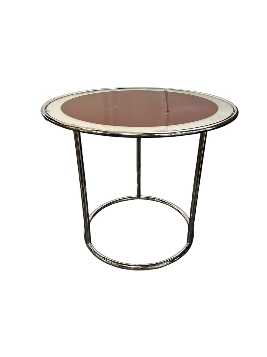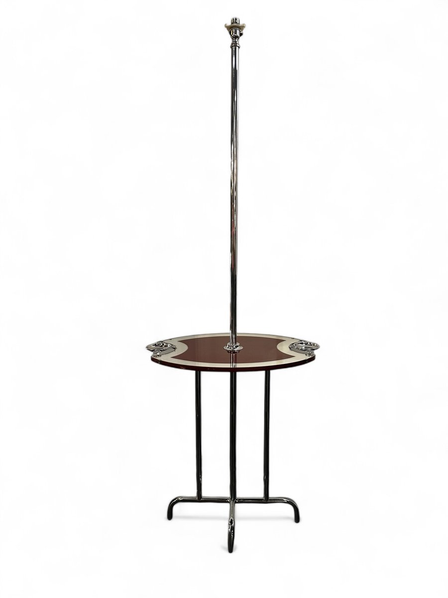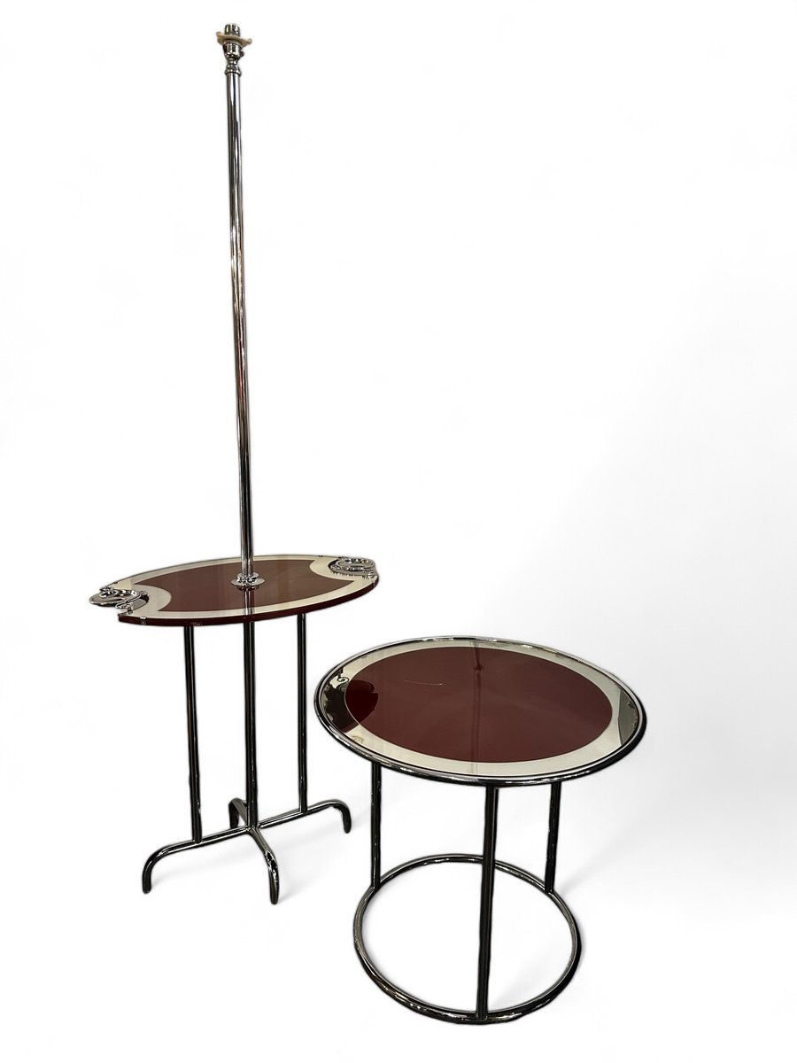 A fine and extremely rare pair of English cylindrical and oval side table and smoking lamp with frames of chromed tubular steel from the Art Deco era, designed by J.M Doughty & Sons LTD, pioneers of the British Art Deco period.