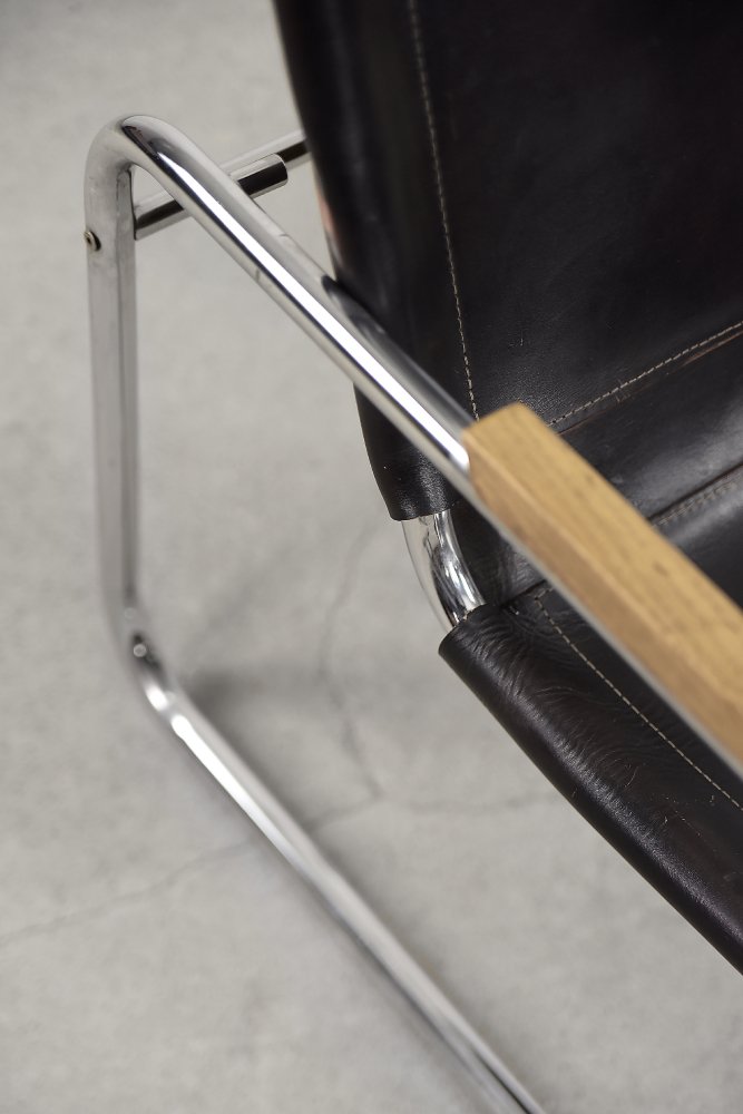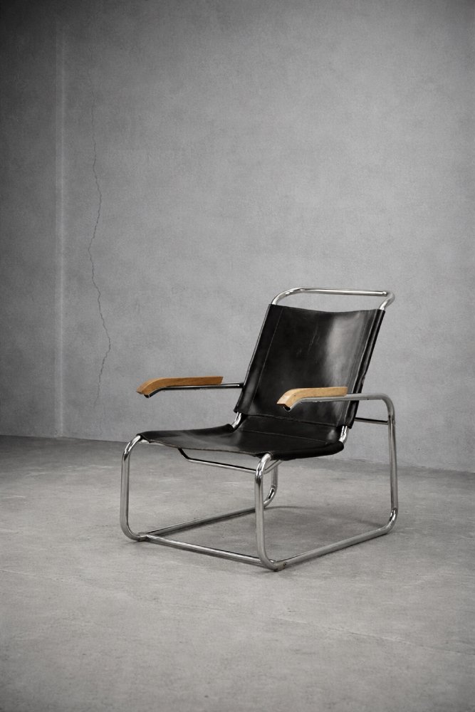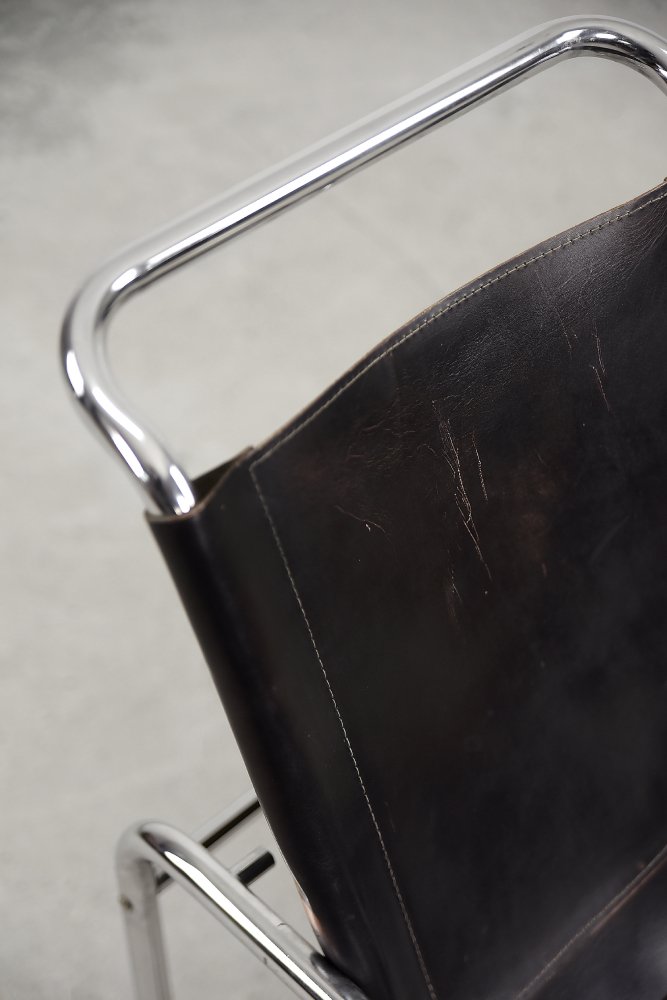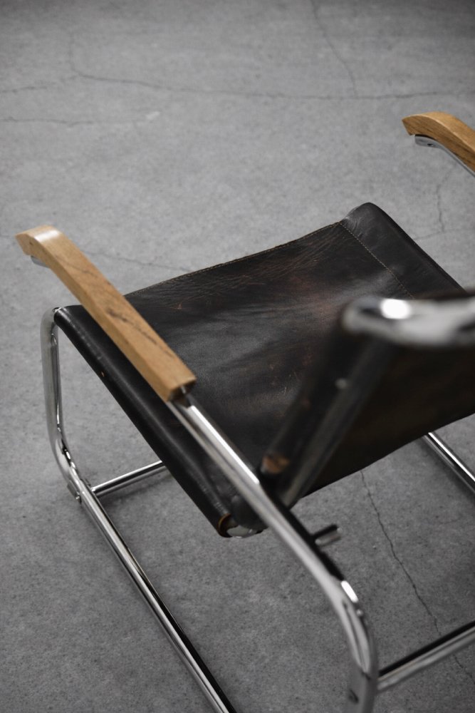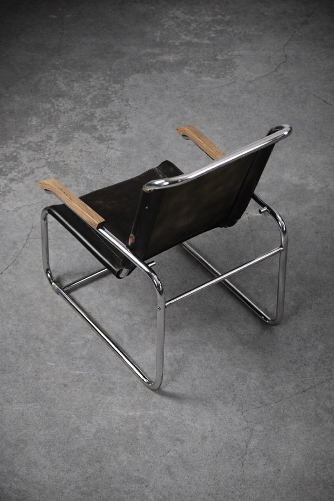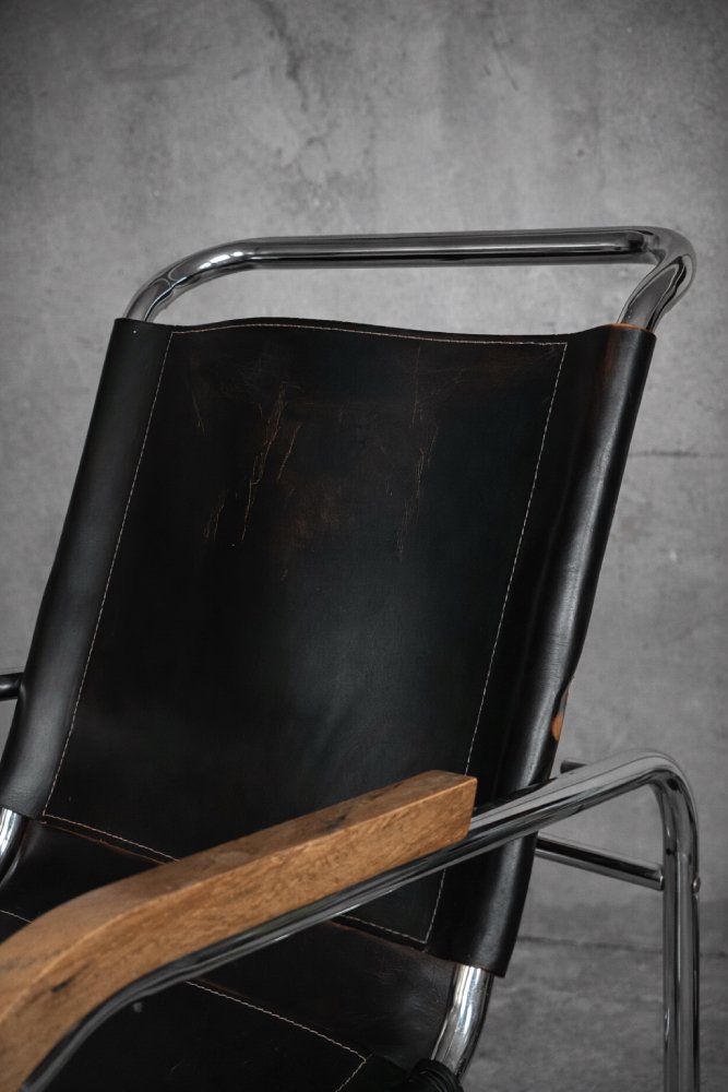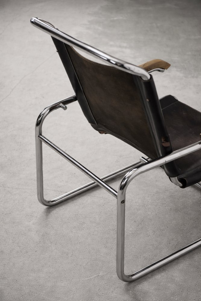 This design icon from 1928, the B35 armchair, was designed by Marcel Breuer in the late 1920s and made by the German Thonet factory in the early 1930s. This piece is made of tubular steel and black leather with natural patina. The materials used and the traces of wear show that this is an early production of this timeless modell. The armrests are finished with solid wood. Following the success of his Wassily chair, Breuer continued to experiment with tubular steel furniture. Like the Wassily chair, the B35 was not a direct representative of the Bauhaus school, but is clearly in line with the Bauhaus design and construction principles, with a modern, stripped-down form made of industrial materials not used today in furniture production.