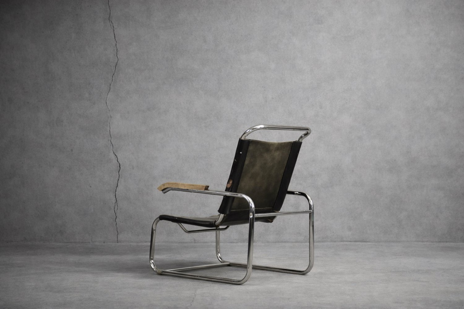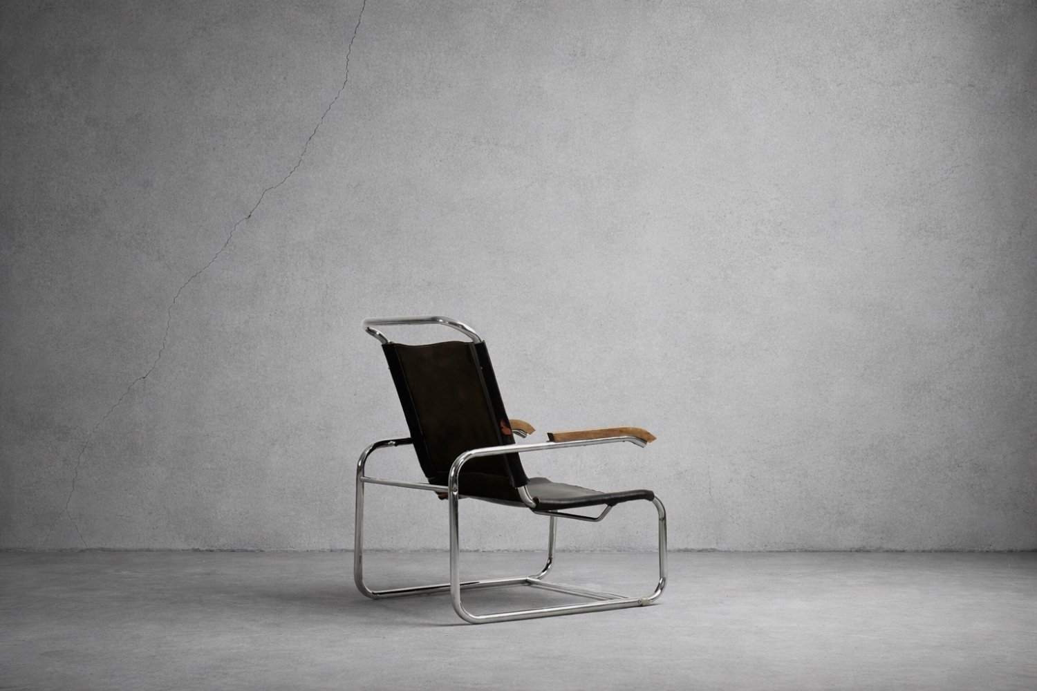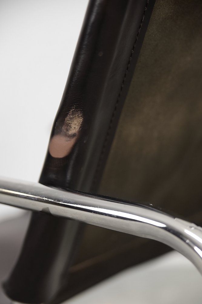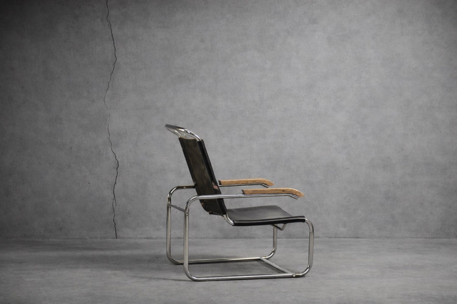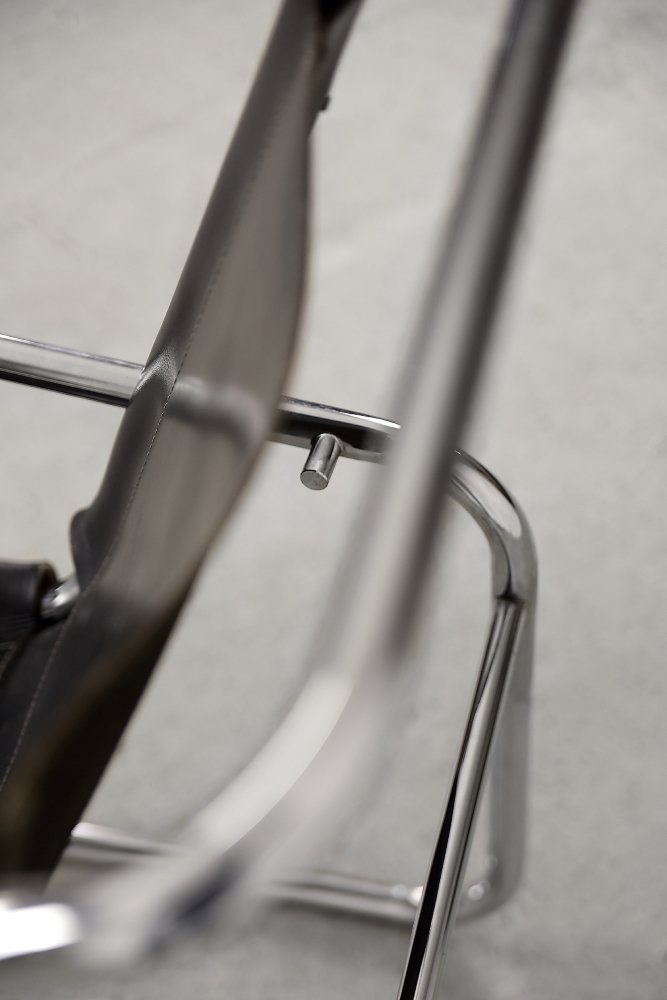 This design icon from 1928, the B35 armchair, was designed by Marcel Breuer in the late 1920s and made by the German Thonet factory in the early 1930s. This piece is made of tubular steel and black leather with natural patina. The materials used and the traces of wear show that this is an early production of this timeless modell. The armrests are finished with solid wood. Following the success of his Wassily chair, Breuer continued to experiment with tubular steel furniture. Like the Wassily chair, the B35 was not a direct representative of the Bauhaus school, but is clearly in line with the Bauhaus design and construction principles, with a modern, stripped-down form made of industrial materials not used today in furniture production.