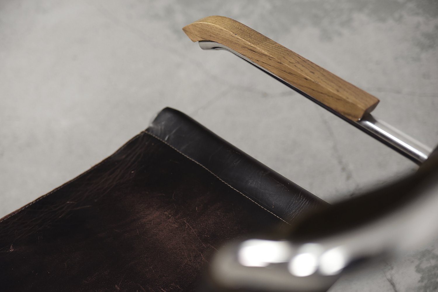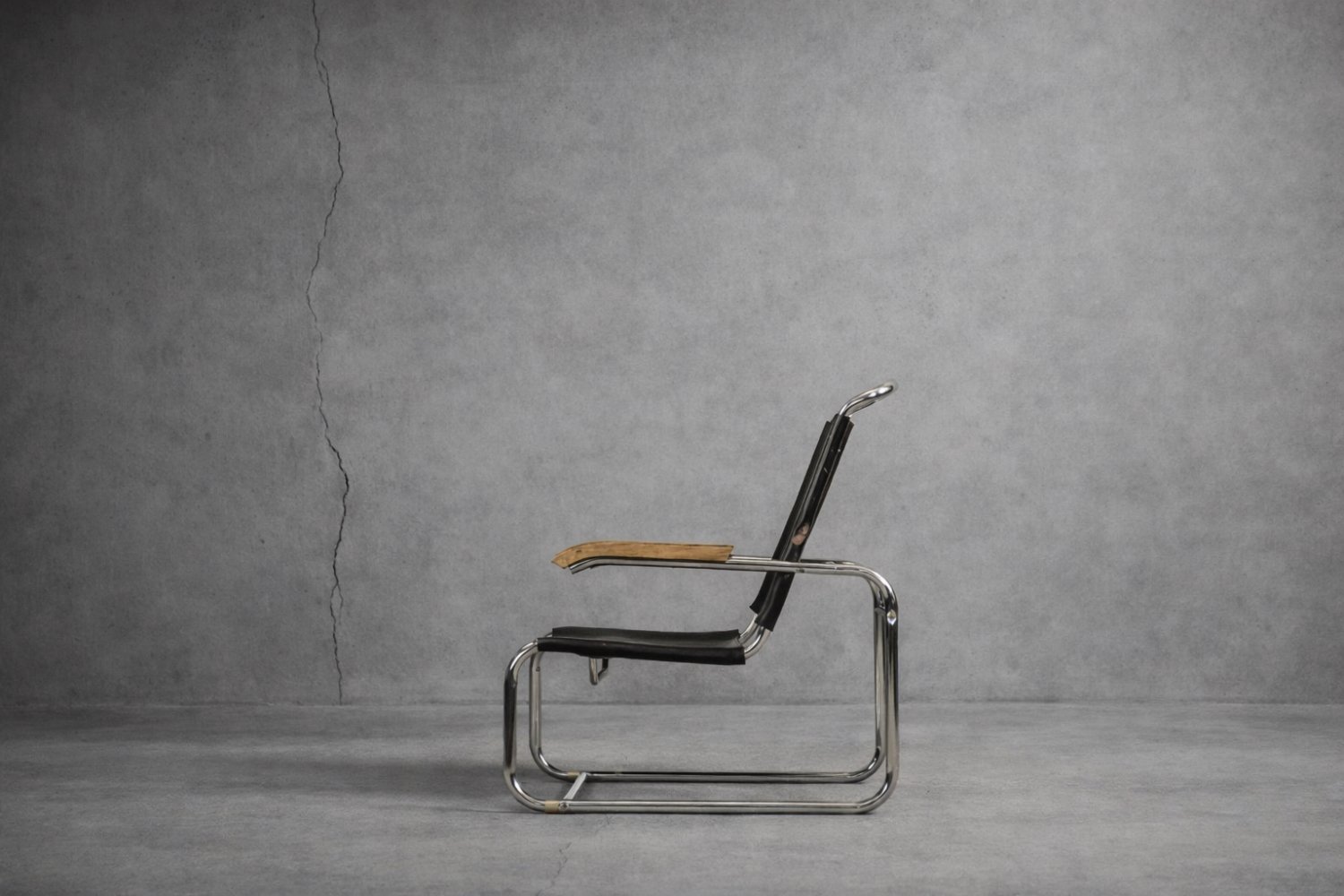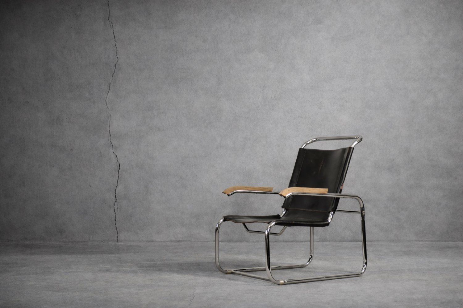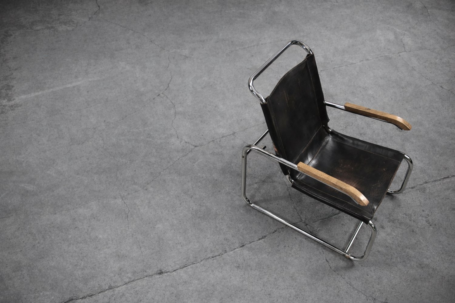 This design icon from 1928, the B35 armchair, was designed by Marcel Breuer in the late 1920s and made by the German Thonet factory in the early 1930s. This piece is made of tubular steel and black leather with natural patina. The materials used and the traces of wear show that this is an early production of this timeless modell. The armrests are finished with solid wood. Following the success of his Wassily chair, Breuer continued to experiment with tubular steel furniture. Like the Wassily chair, the B35 was not a direct representative of the Bauhaus school, but is clearly in line with the Bauhaus design and construction principles, with a modern, stripped-down form made of industrial materials not used today in furniture production.