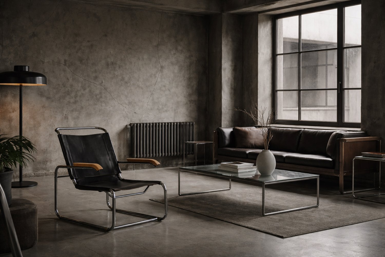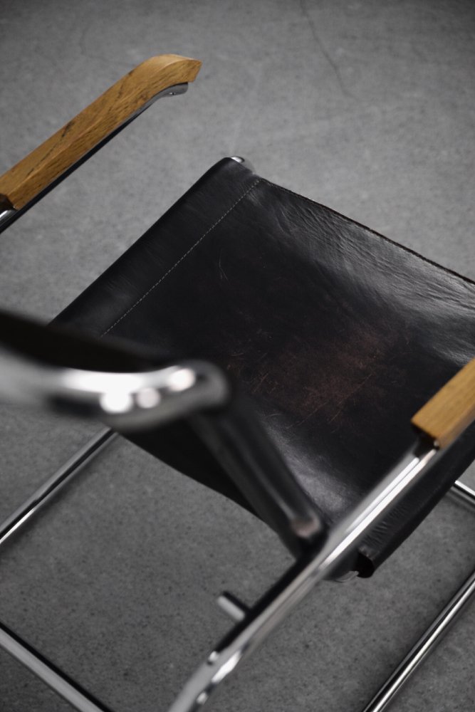 Diese Design-Ikone aus dem Jahr 1928, der Sessel B35, wurde Ende der 1920er Jahre von Marcel Breuer entworfen und in den frühen 1930er Jahren von der deutschen Thonet-Fabrik hergestellt. Dieses Stück ist aus Stahlrohr und schwarzem Leder mit natürlicher Patina gefertigt. Die verwendeten Materialien und die Gebrauchsspuren zeigen, dass es sich um eine frühe Produktion dieses zeitlosen Modells handelt. Die Armlehnen sind aus Massivholz gefertigt. Nach dem Erfolg seines Wassily-Stuhls experimentierte Breuer weiter mit Stahlrohrmöbeln. Wie der Wassily-Stuhl war auch der B35 kein direkter Vertreter der Bauhaus-Schule, steht aber eindeutig im Einklang mit den Design- und Konstruktionsprinzipien des Bauhauses, mit einer modernen, reduzierten Form aus industriellen Materialien, die heute in der Möbelproduktion nicht verwendet werden.
