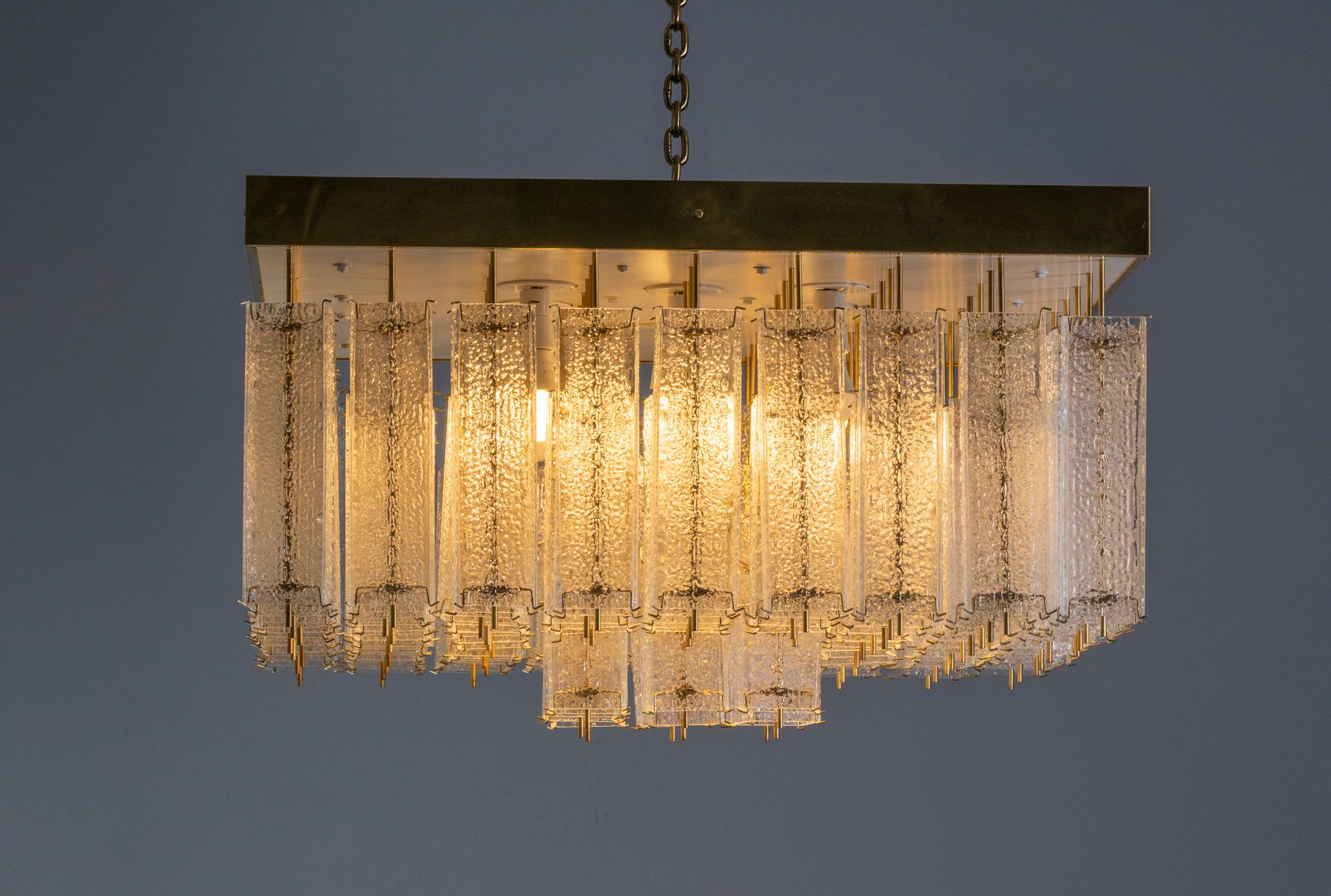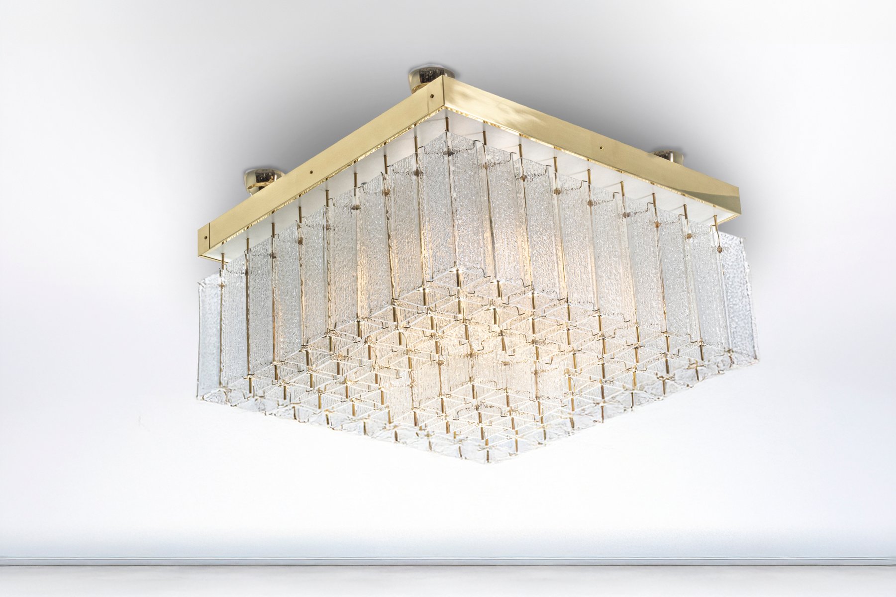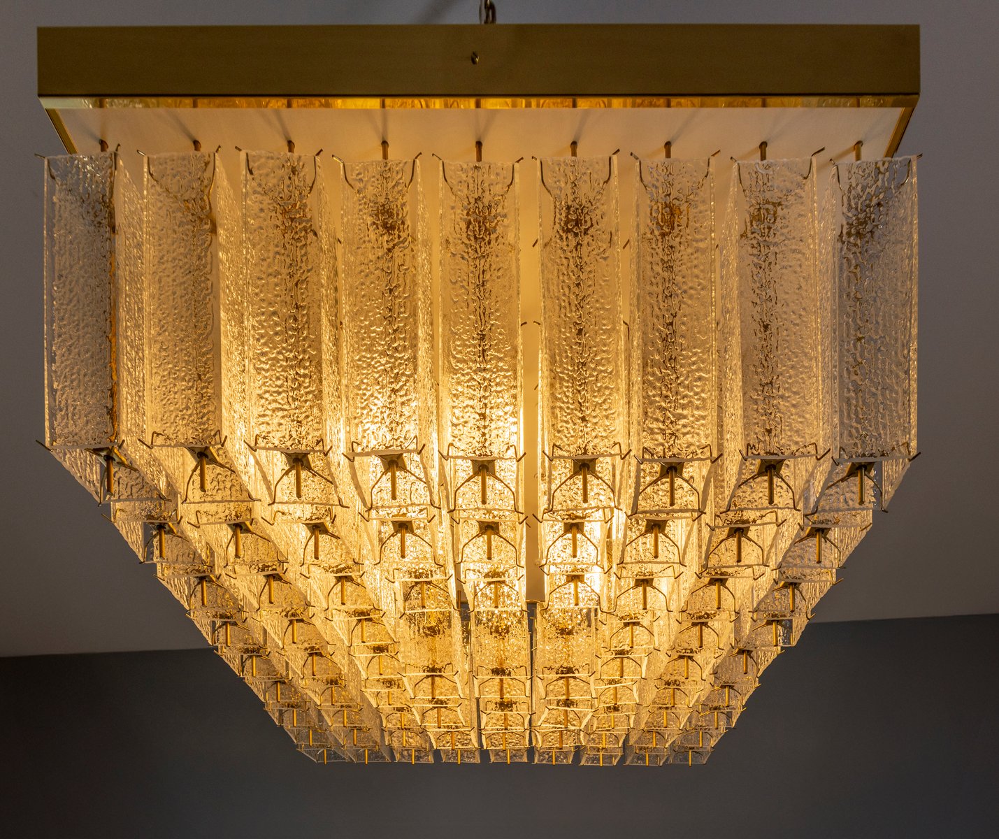 Eine auffällige böhmische Deckenleuchte aus den 1960er Jahren, die ursprünglich in Prag hergestellt wurde. Dieses seltene Stück zeichnet sich durch seine kühnen Proportionen und seine raffinierte Handwerkskunst aus. Der quadratische Messingrahmen trägt 81 einzeln strukturierte Glaselemente, die in einer stufenförmigen Komposition angeordnet sind, die das Licht mit außergewöhnlicher Tiefe bricht und streut.