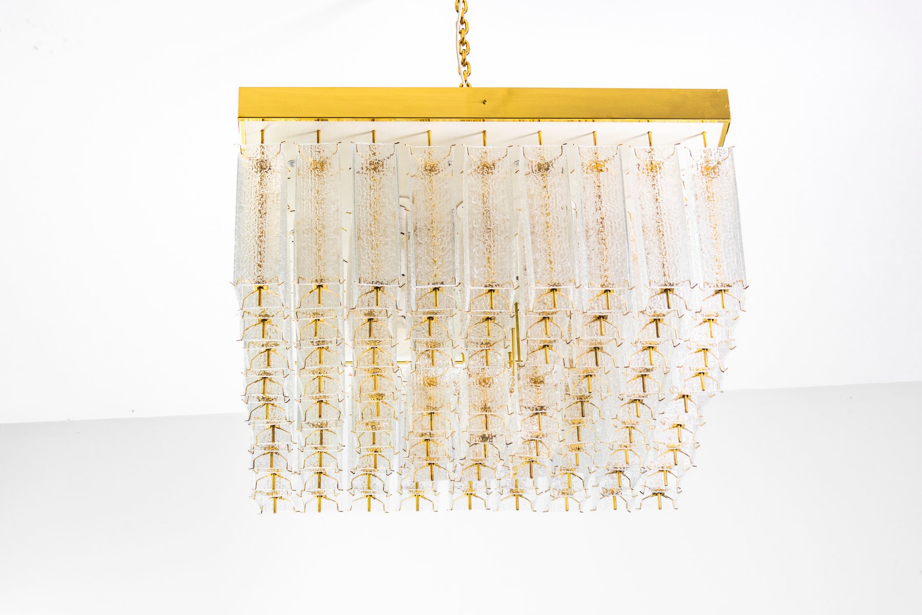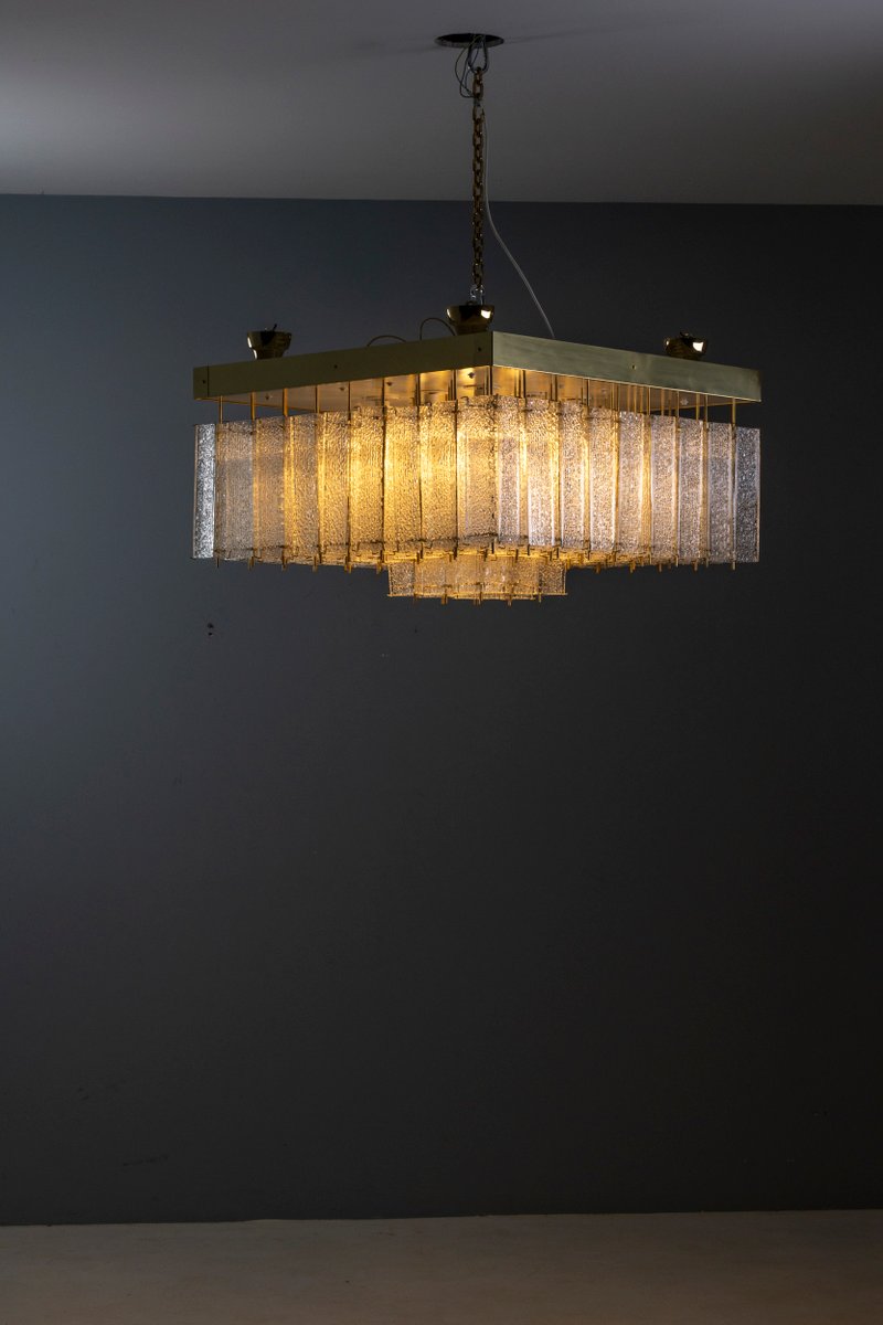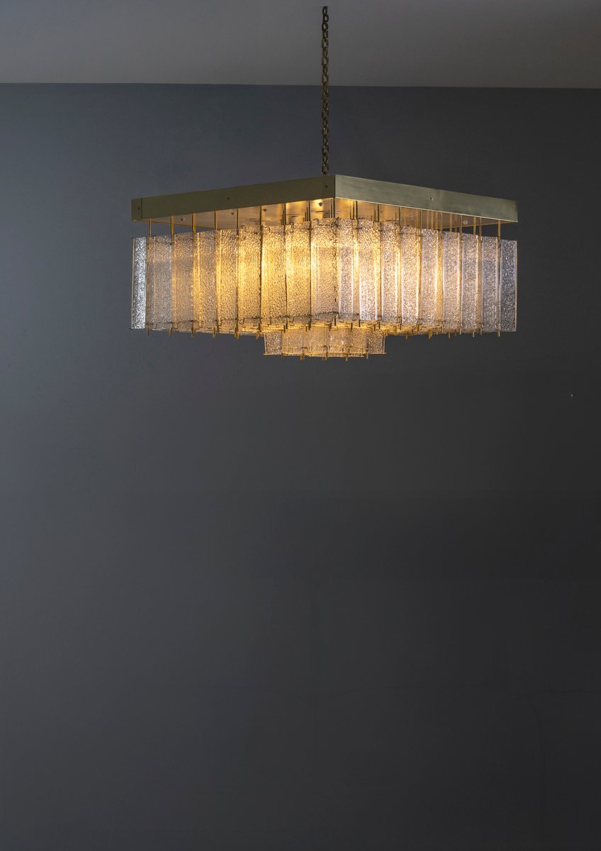 Eine auffällige böhmische Deckenleuchte aus den 1960er Jahren, die ursprünglich in Prag hergestellt wurde. Dieses seltene Stück zeichnet sich durch seine kühnen Proportionen und seine raffinierte Handwerkskunst aus. Der quadratische Messingrahmen trägt 81 einzeln strukturierte Glaselemente, die in einer stufenförmigen Komposition angeordnet sind, die das Licht mit außergewöhnlicher Tiefe bricht und streut.
