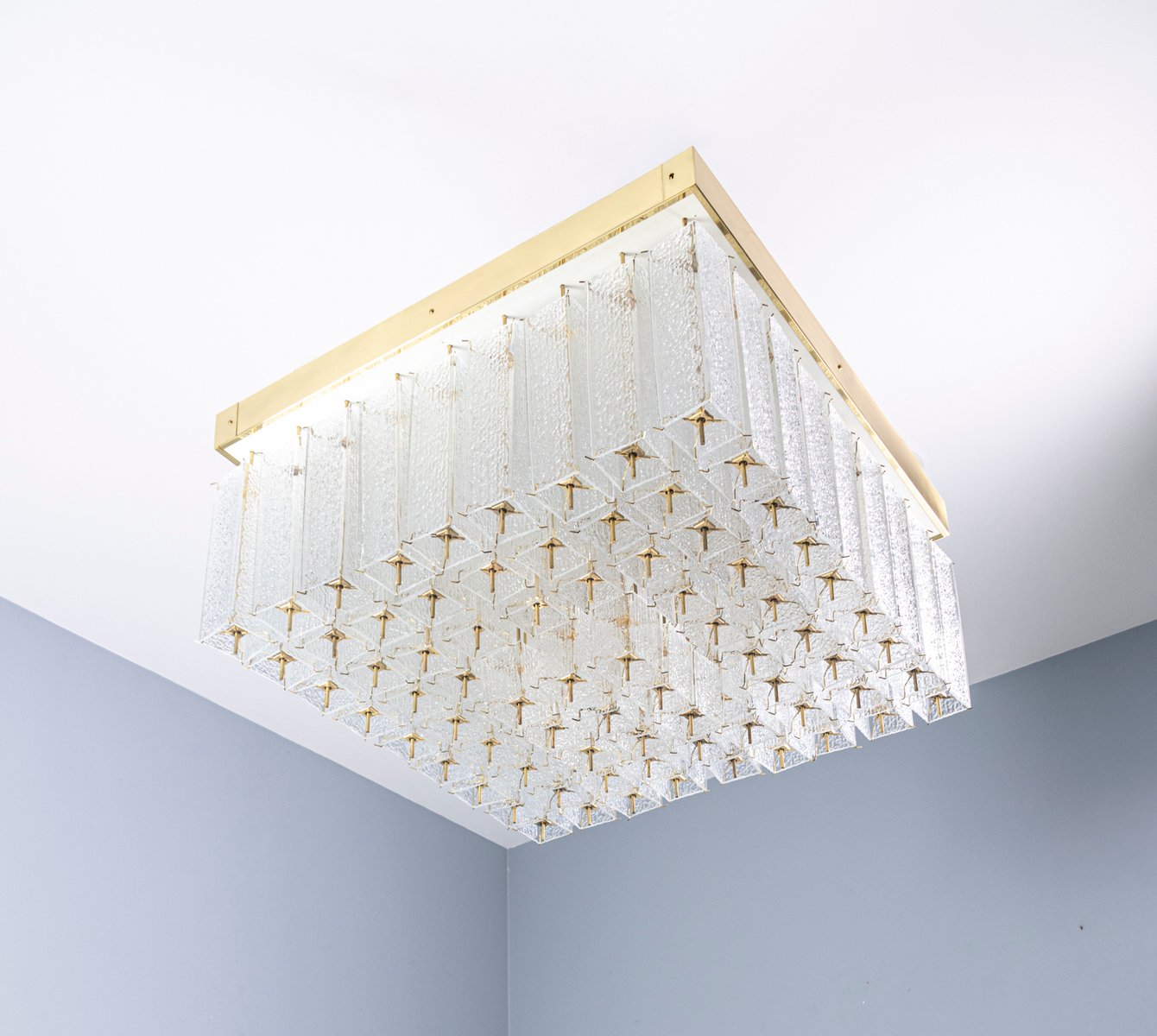 A striking Bohemian flush-mount ceiling light from the 1960s, originally produced in Prague. This rare piece is defined by its bold proportions and refined craftsmanship. The square brass frame supports 81 individually textured glass elements, arranged in a stepped composition that breaks and diffuses light with exceptional depth.