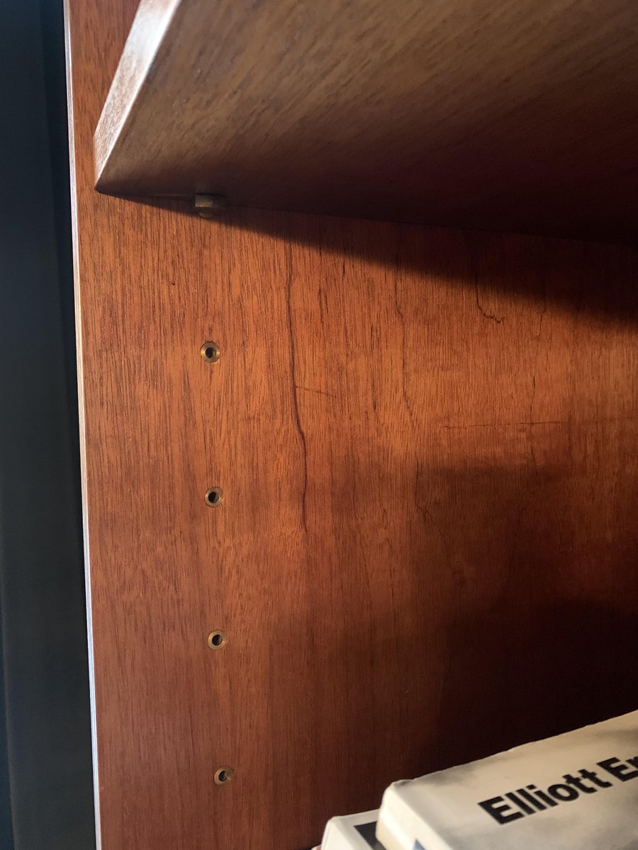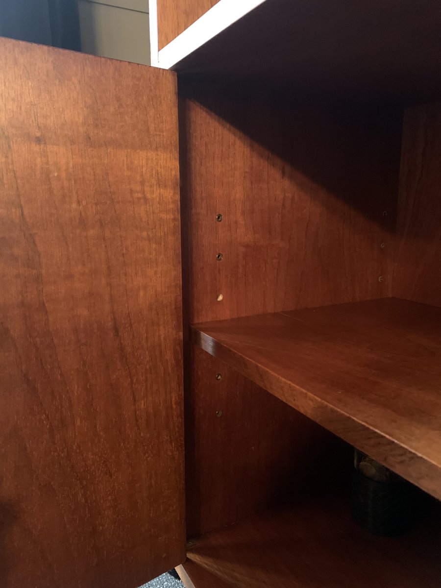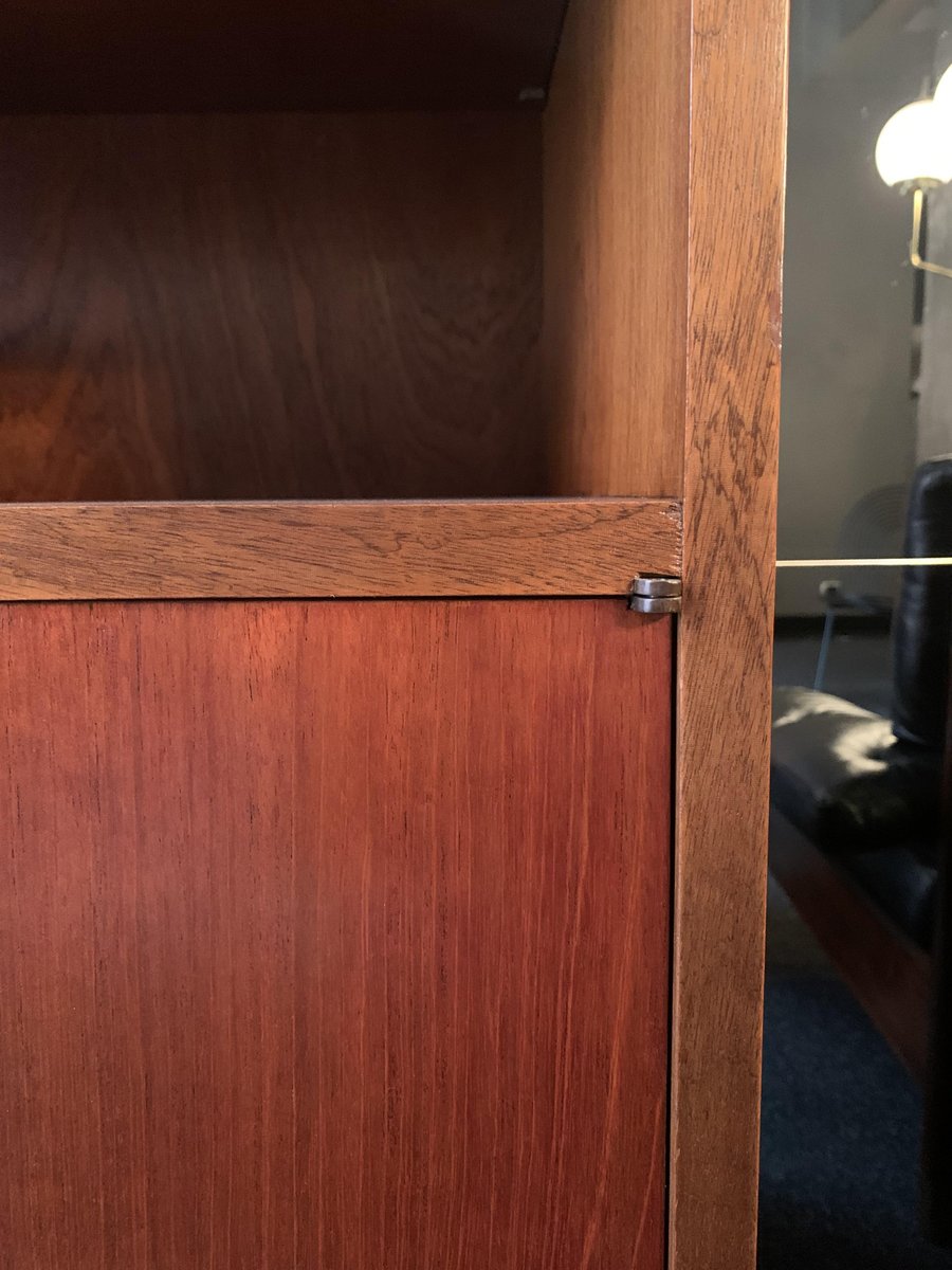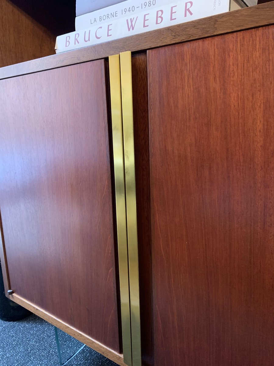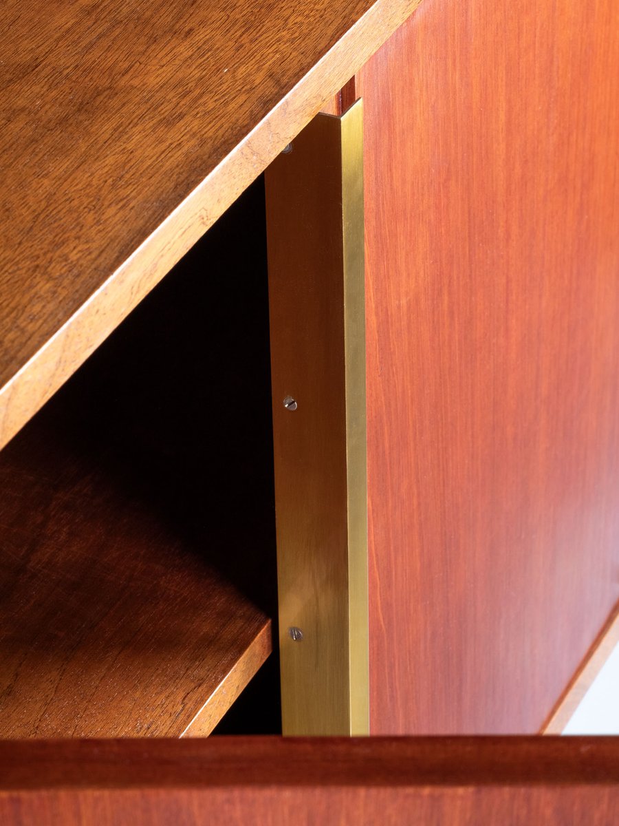 Raphael Décorateur (Raphael Reffel), Bücherregal aus Holz, Messing und Glas. Das Bücherregal wurde Anfang der 1970er Jahre in Frankreich aus hellem Holz gefertigt, das im Laufe der Zeit eine schöne rote Patina angenommen hat, und ruht auf zwei Glasplatten, die den Eindruck erwecken, dass es schwebt. Abgesehen von den Glasböden zeichnet sich das Möbel durch äußerst einfache und geometrische Linien aus. Nur zwei lange Messinggriffe an den Türen und die kleinen Eckscharniere bringen Bewegung in die Oberfläche. Sowohl die äußeren als auch die inneren Einlegeböden können in verschiedenen Höhen angebracht werden. Das Bücherregal befindet sich in einem ausgezeichneten Zustand, nachdem es renoviert wurde: einige kleine Gebrauchsspuren sind auf den Bildern hervorgehoben.