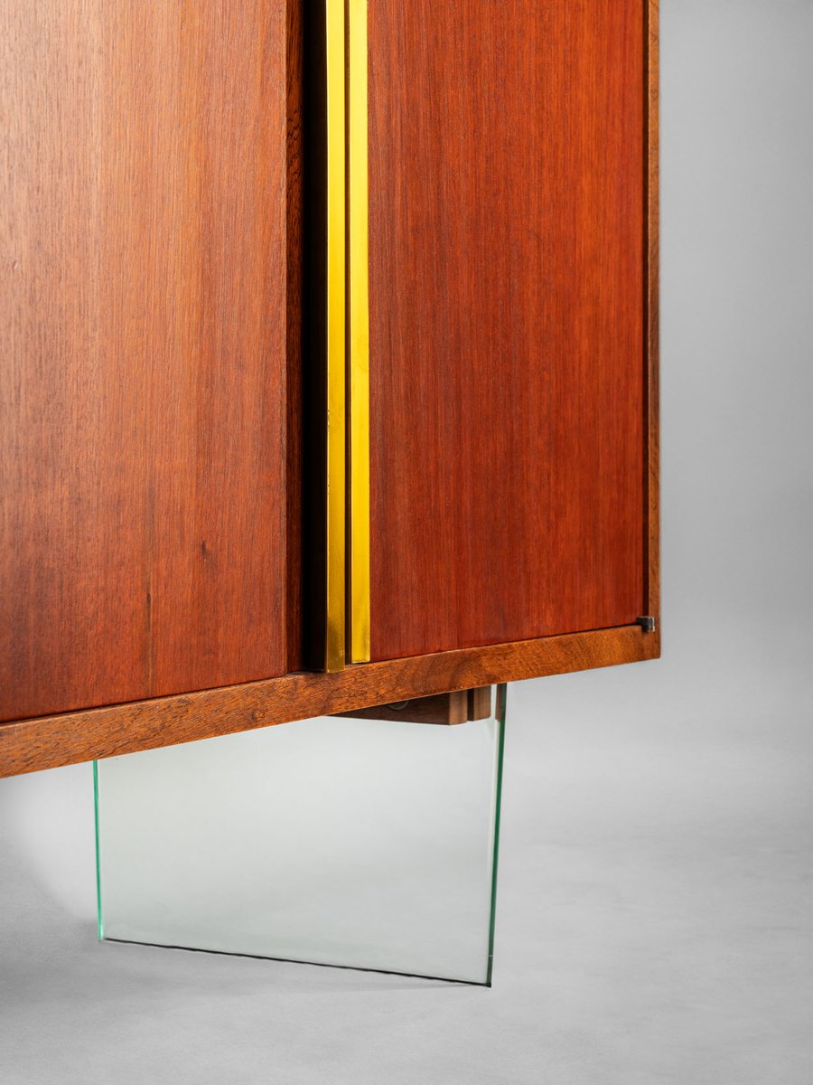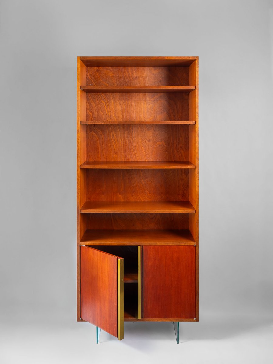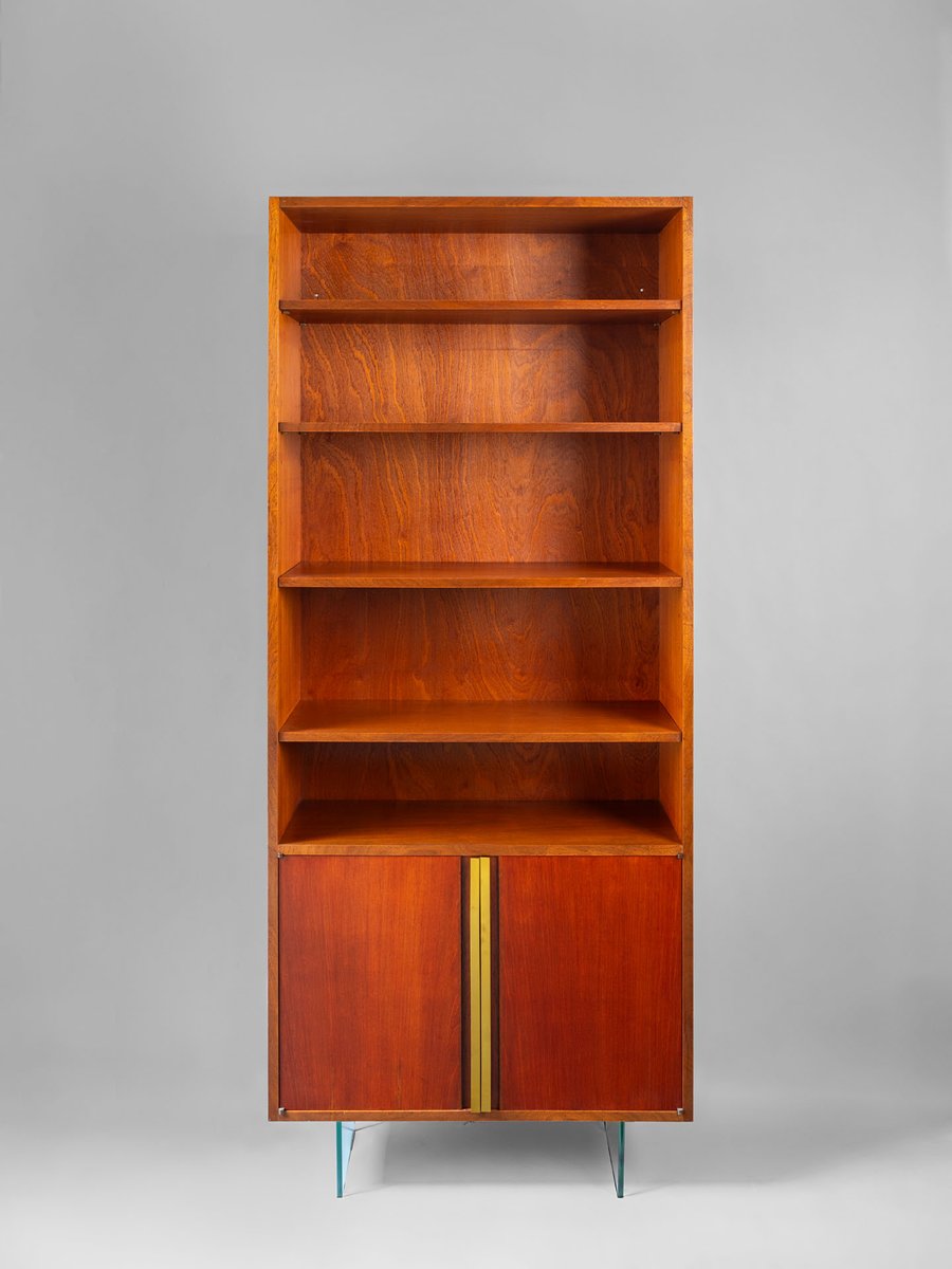 Raphael Décorateur (Raphael Reffel), bookcase in wood, brass and glass. The bookcase was made in France in the early 1970s in light wood, which over time has acquired a beautiful red patina, resting on two sheets of glass, which give the impression that it is suspended. Apart from the glass bases, the furniture is characterized by extremely simple and geometric lines. Only two long brass handles on the doors and the small corner hinges give movement to the surface. Both the external and internal shelves can be placed at different heights. The bookcase is in excellent conditions having been refurbished: some small signs of wear are highlighted in the images.