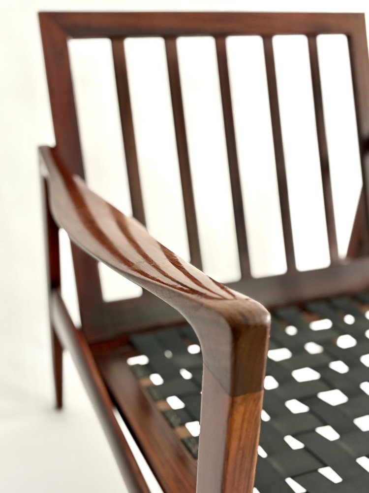 An elegant pair of "Candidate" armchairs designed by IbKofod-Larsen and crafted from solid afrormosia (African teak) for Olof Perssons Fatöljindustri (O.P.E.) in Sweden, circa 1960s. Danish designer IbKofod-Larsen is a leading figure in Scandinavian modernism and achieved success collaborating with manufacturers such as O.P.E.