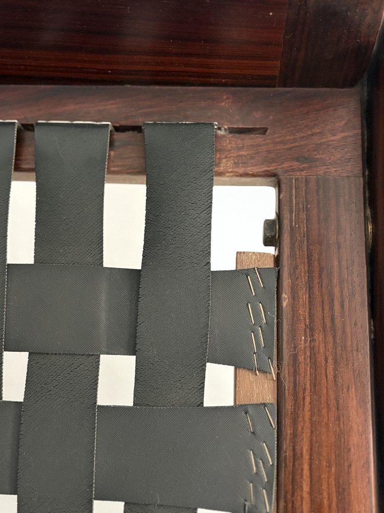 The armchairs are in very good condition, never restored: they retain the original cushion upholstery, with some slight visible stains on the fabric. The afrormosia frames are solid, with a uniform patina. They exhibit some marks, including rare, barely visible dents, attributable to age and use. These marks are indicative of their originality. A quick and inexpensive polish can be used to remove them.