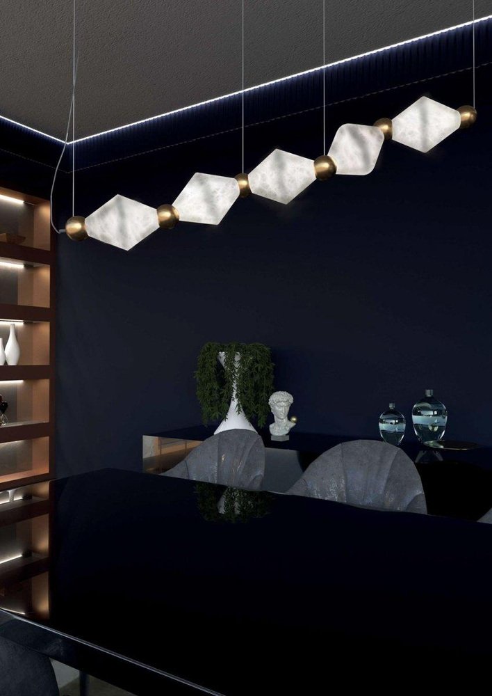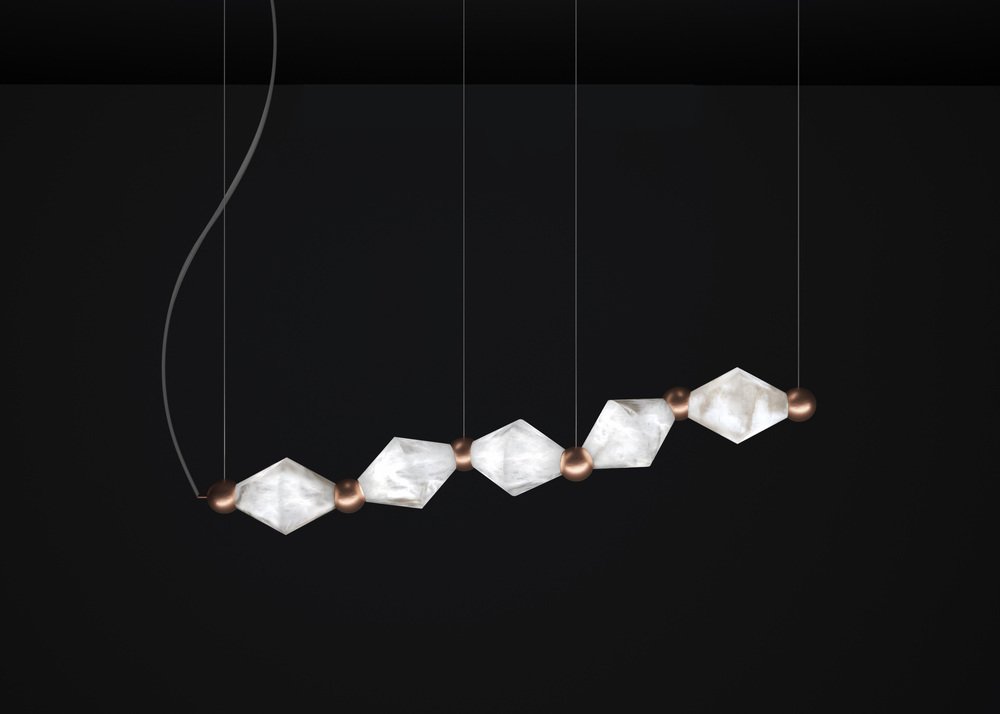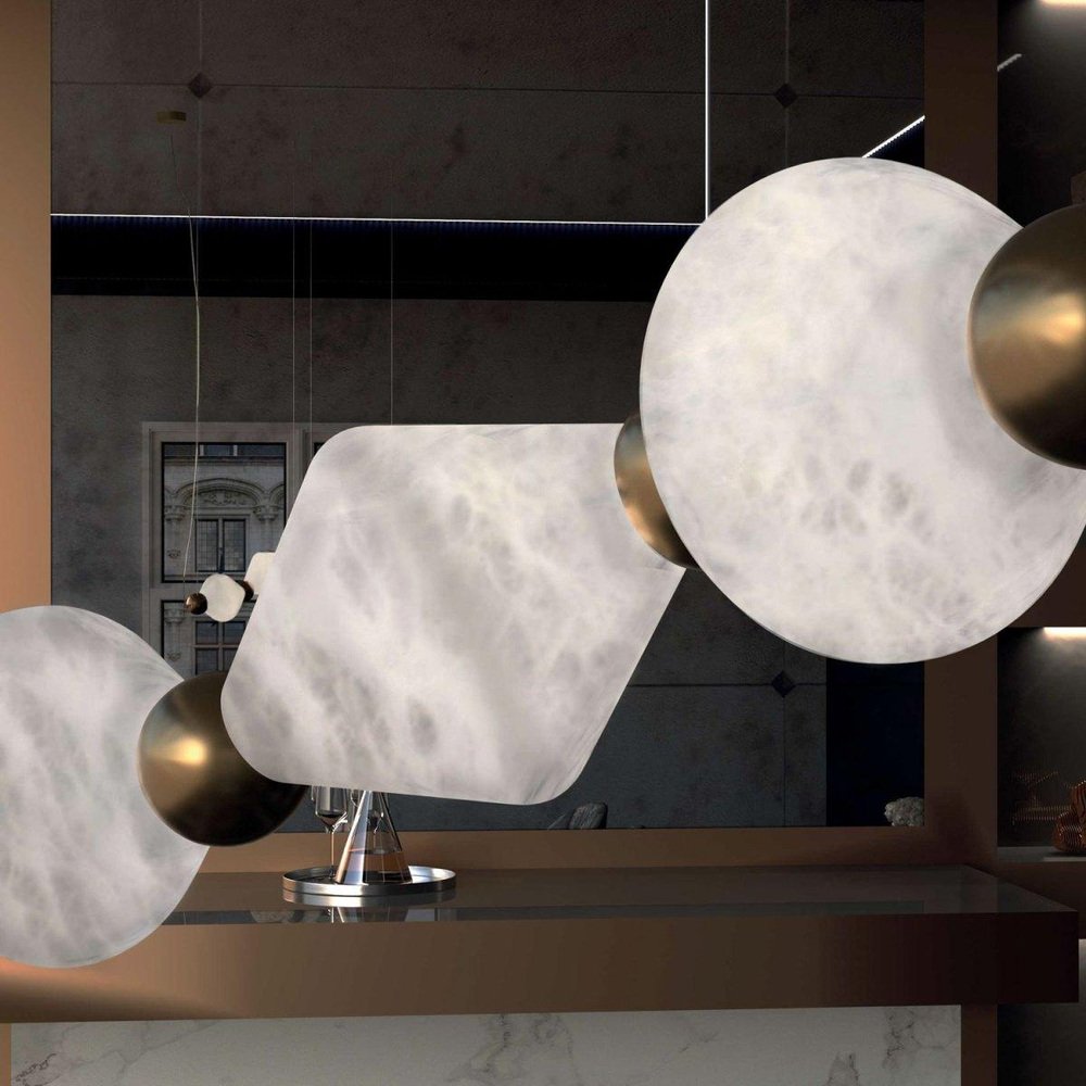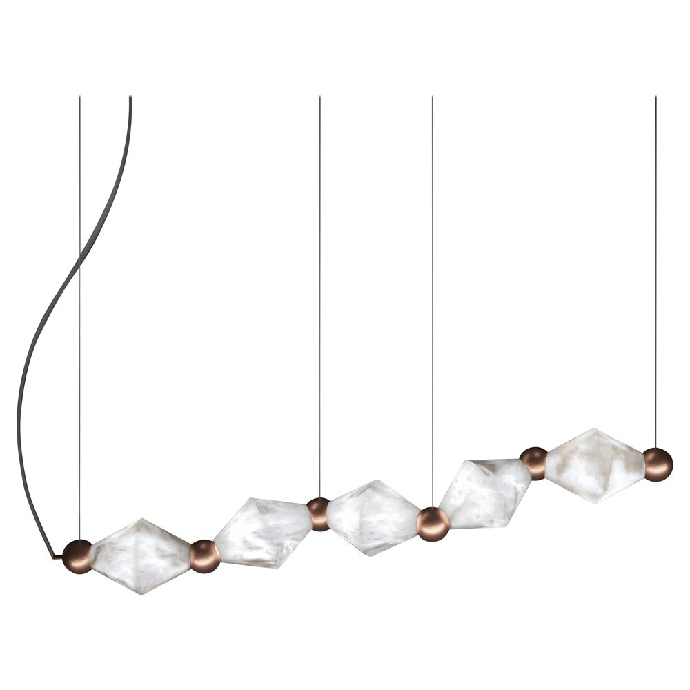 Chronos Copper Metal Pendant Lamp by Alabastro Italiano Dimensions: D 21 x W 142 x H 31 cm. Materials: White alabaster and copper. Available in different finishes: Shiny Silver, Bronze, Brushed Brass, Ruggine of Florence, Brushed Burnished, Shiny Gold, Brushed Black, Freedom Green, Shiny Black and Copper. Please contact us. All our lamps can be wired according to each country. If sold to the USA it will be wired for the USA for instance. Chronos, God of time, inspired this Alabastro Italiano series. The conical shapes of the alabaster diffusers resemble stylised hourglasses marking the passage of time. After years of experience in the family business, which specializes in design and lighting, Riccardo and Alberto Ongarato found the brand Alabastro Italiano. Each project is conceived and designed to give a strong sign of recognizability and uniqueness. The use of precious materials such as alabaster, brass, leather and blown glass, worked by the skilful hands of our craftsmen, are combined to create “timeless” objects. from the depths of the earth to the light of the sun. ALABASTRO ITALIANO care about these extremes and transcends them in a creative dynamic that emphasizes simplicity and clean-cut lines. The company has created an entirely new project MADE IN ITALY, revolutionizing the previously existing collections into eternal and evergreen lighting elements. By designing clean-cut and original lines, built-in with the latest technology and continuously innovating, ALABASTRO ITALIANO has never lost sight of its goal: perfection. The result of this work is an extraordinary collection of alabaster lightings. Alabaster needs human hands to come to life. The charm of these stone objects comes from their uniqueness, from the fact that they come from the hand of those who has left a mark and a memory with their work, each grain makes each piece unique. Alabaster needs human hands to come to life. The charm of these stone objects comes from their uniqueness, from the fact that they come from the hand of those who has left a mark and a memory with their work, each grain makes each piece unique. Alabaster is a Material that leaves little traces of magic all around it. It is difficult to identify the exact point where the Material ends and its reflection begins. It is impossible to understand how far the light sinks in its soft transparency. It changes according to the positions in which it is placed, depending on the point of view. Alabaster is a compact and rare stone that lays down very precise laws requires a familiarity that only Italian craftsmen possess. Alabastro Italiano collaborates with each client to create a unique project. Starting from the advice for better architectural lighting, it brings its know-how, materials, design and creative inspiration to interior architects and interior designers.