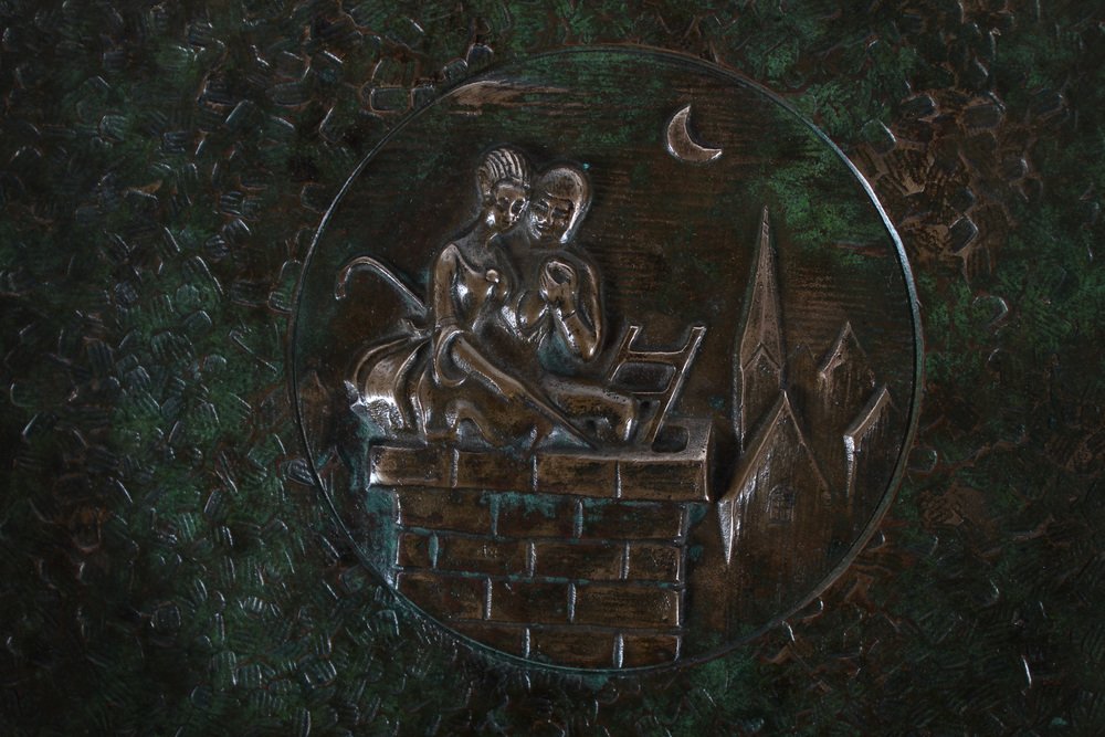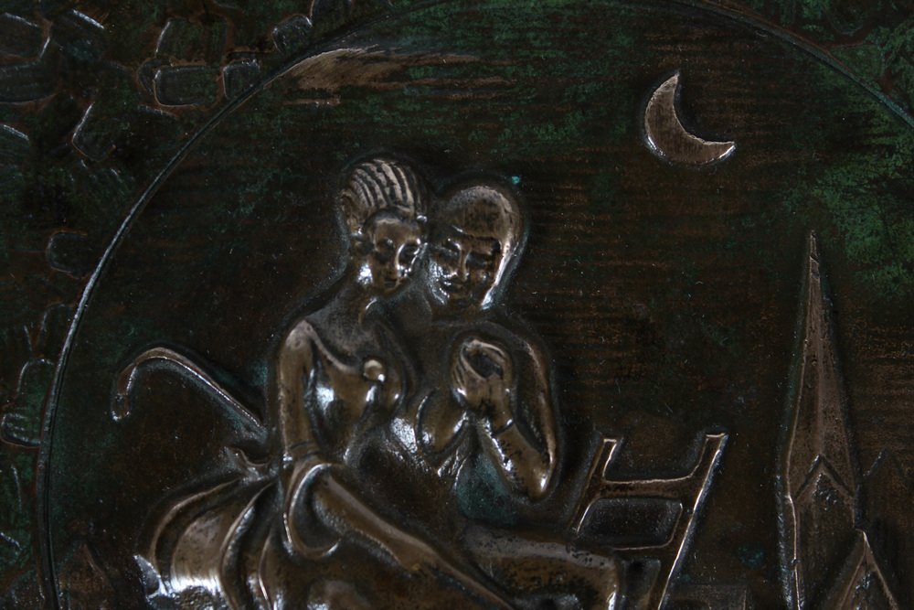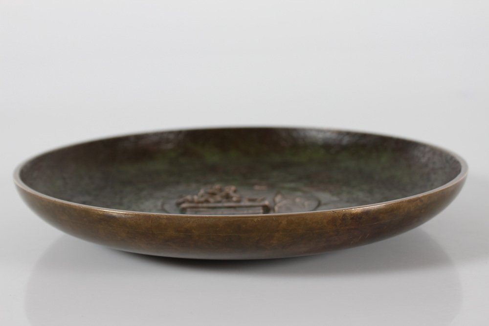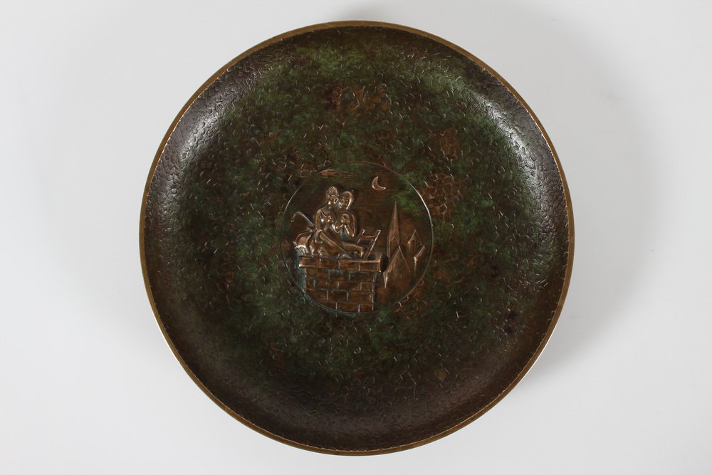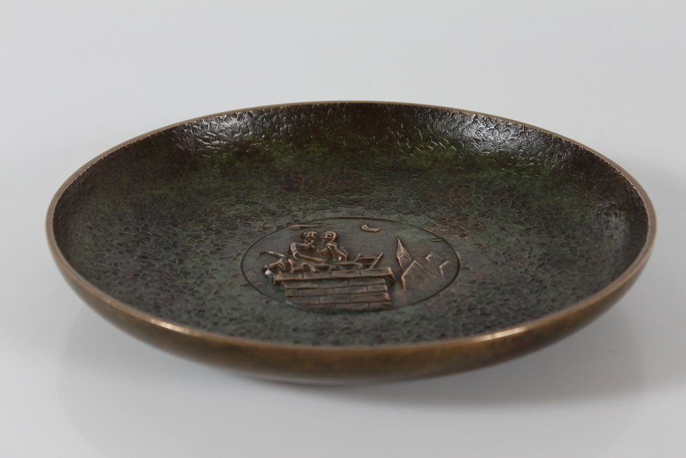 Dänische Art Deco The Shepherdess and the Schornsteinfeger Tinos Bronze Schale mit Relief von HC Andersen, Dänemark, 1950er