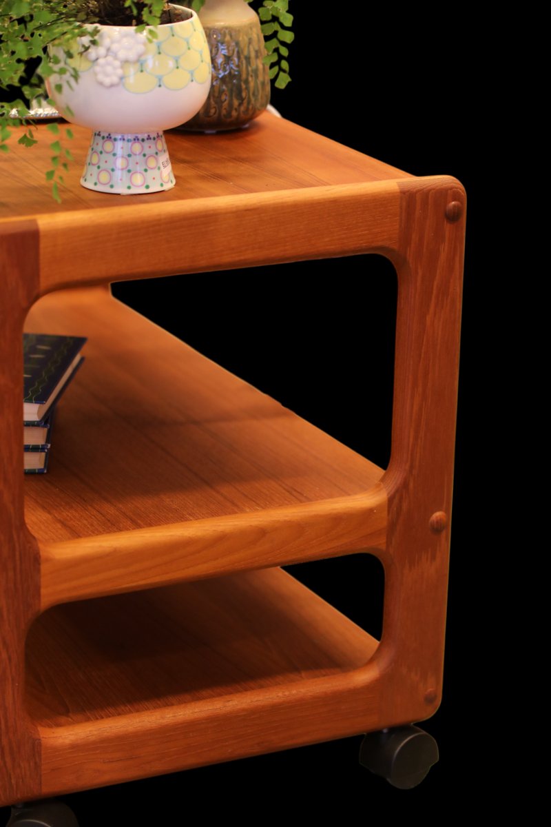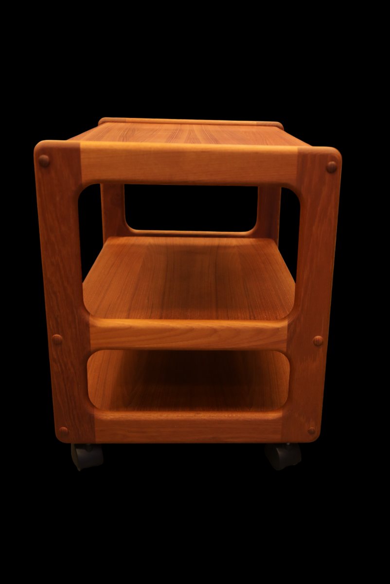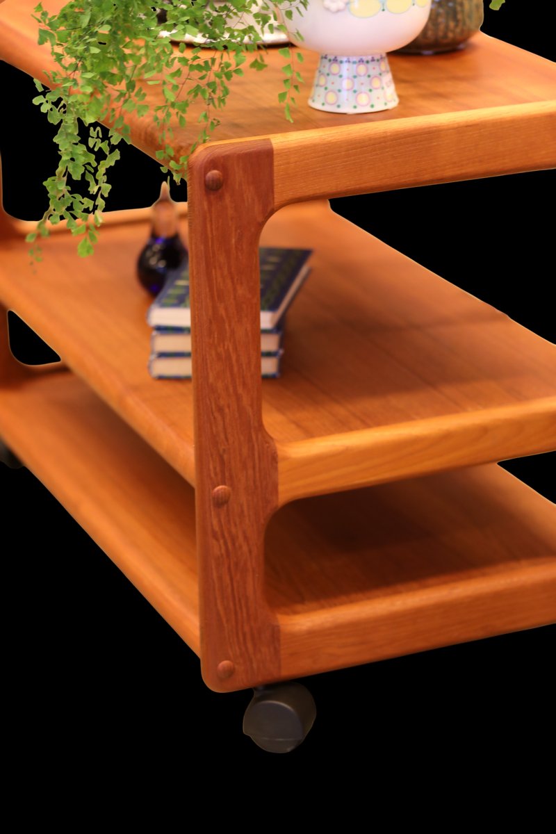 Ein fantastisch schöner und praktischer Barwagen/Servierwagen auf drei Ebenen! Der Wagen wird in Dänemark hergestellt und ist aus wunderschönem goldbraunem Teakholz gefertigt, was ihm einen zeitlosen und eleganten Look verleiht, der die Atmosphäre jedes Raumes aufwertet. Mit seinem eleganten Design und den langlebigen Materialien ist er nicht nur eine optische Freude, sondern auch eine praktische Investition für viele Jahre. Der Wagen hat drei Ebenen, sodass Sie leicht Platz für alles finden, was Sie brauchen, egal ob es sich um Bücher, Dekorationen oder andere Dinge handelt, die Sie griffbereit haben möchten. Darüber hinaus sind Größe und Anordnung der Ebenen so gestaltet, dass der Platz optimal genutzt wird, was ihn zu einer perfekten Lösung für kleine und große Räume macht.