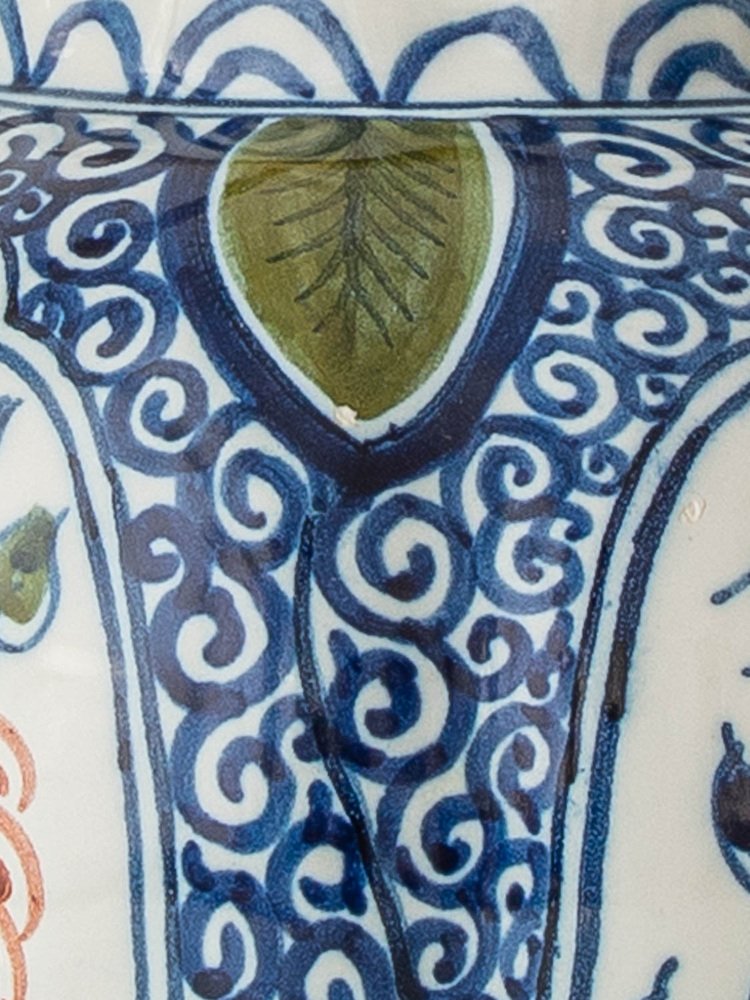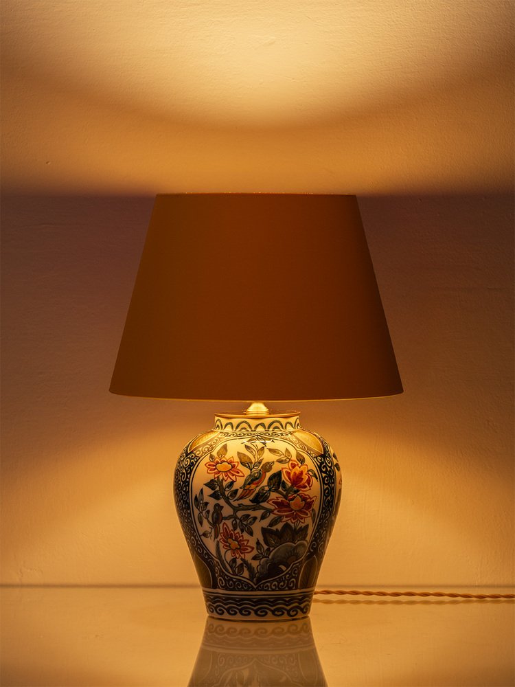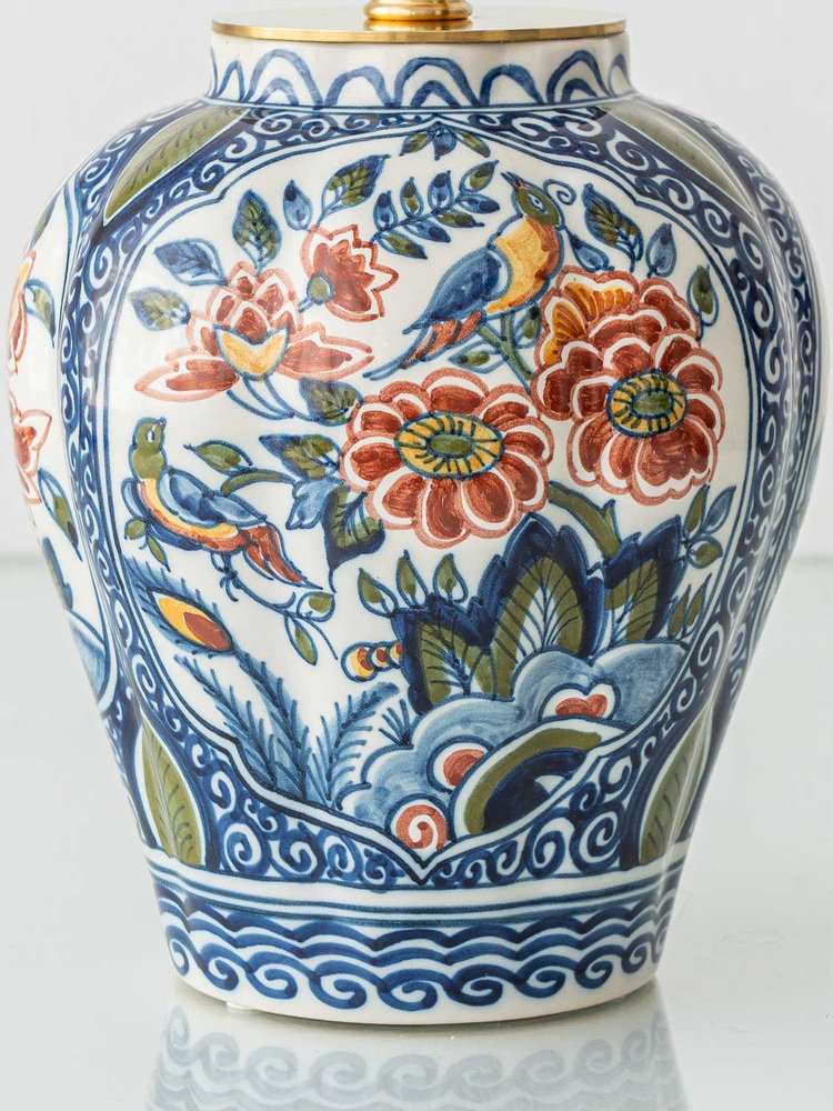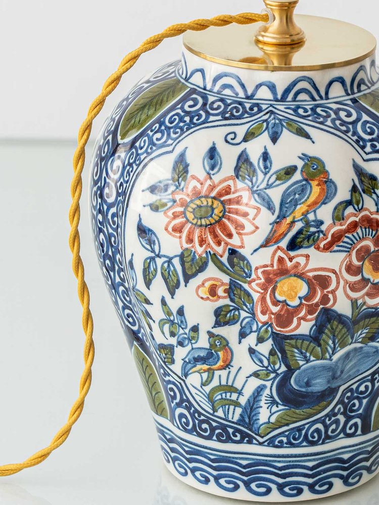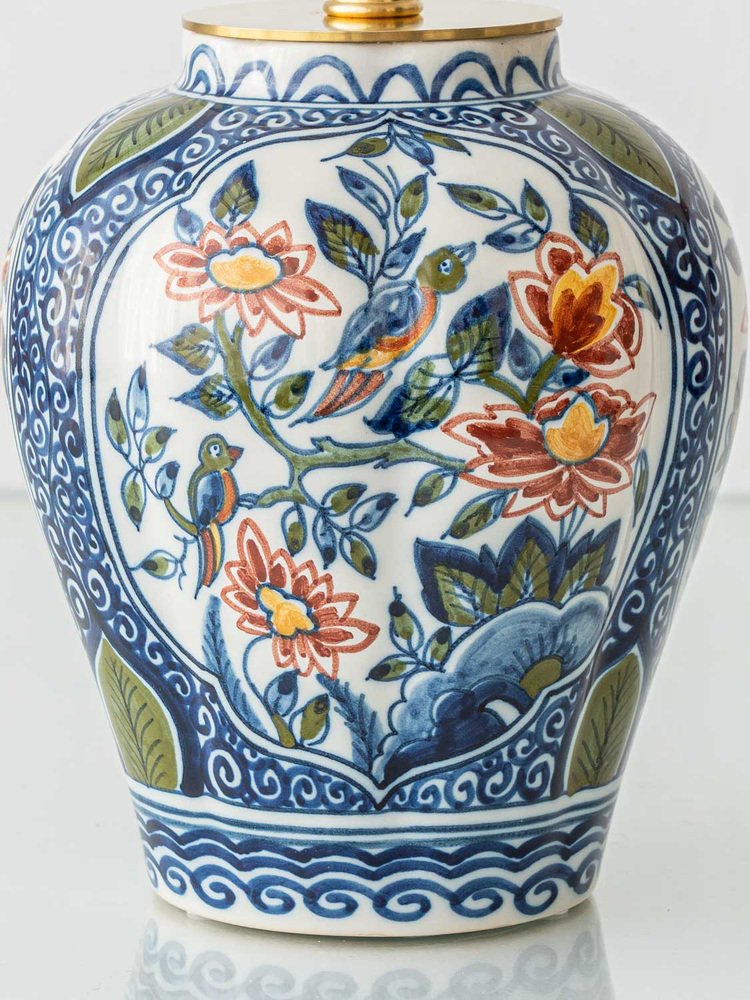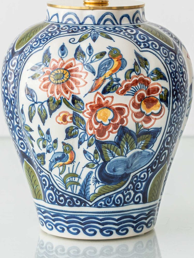 These vivid garden scenes are framed by intricate blue patterns, inspired by swirling motifs found in traditional Chinese porcelain—a clear influence on Delft ceramics. This fusion of Eastern and Western artistic traditions in this Chinoiserie style, reflects the rich cultural exchange that shaped these pieces, resulting in vintage table lamps that are both historically significant and visually striking.