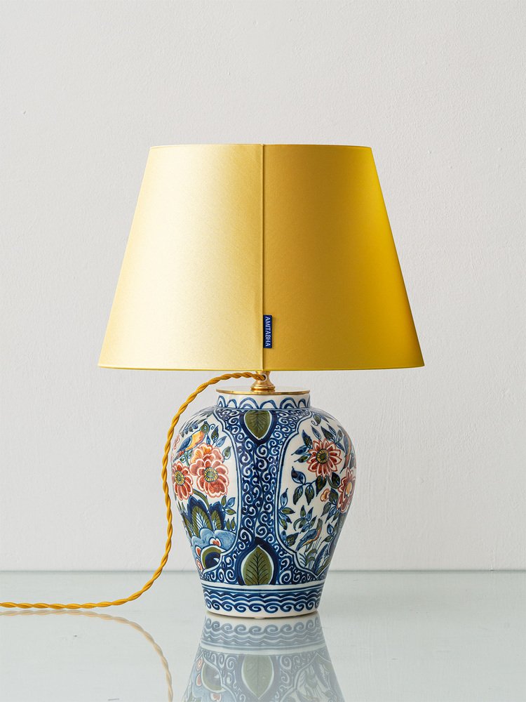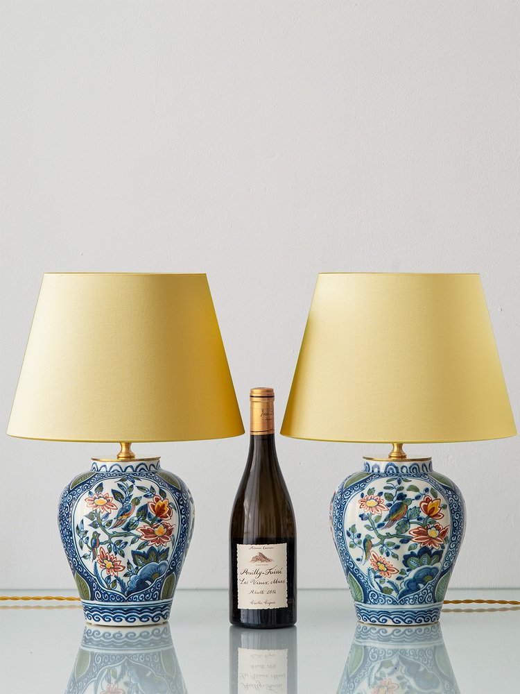 A one-of-a-kind pair of lamps, perfect for a living room or bedroom, Saskia & Serge have been lovingly handcrafted from unique, vintage, hand-painted vases in a Delft Chinoiserie style by Royal Tichelaar Makkum, the Netherlands’ oldest ceramic company, established in 1572. Paired with custom, contemporary lampshades in soft, sunny yellow satin—handmade in an atelier near Amsterdam—these table lamps beautifully balance tradition and modern design.
