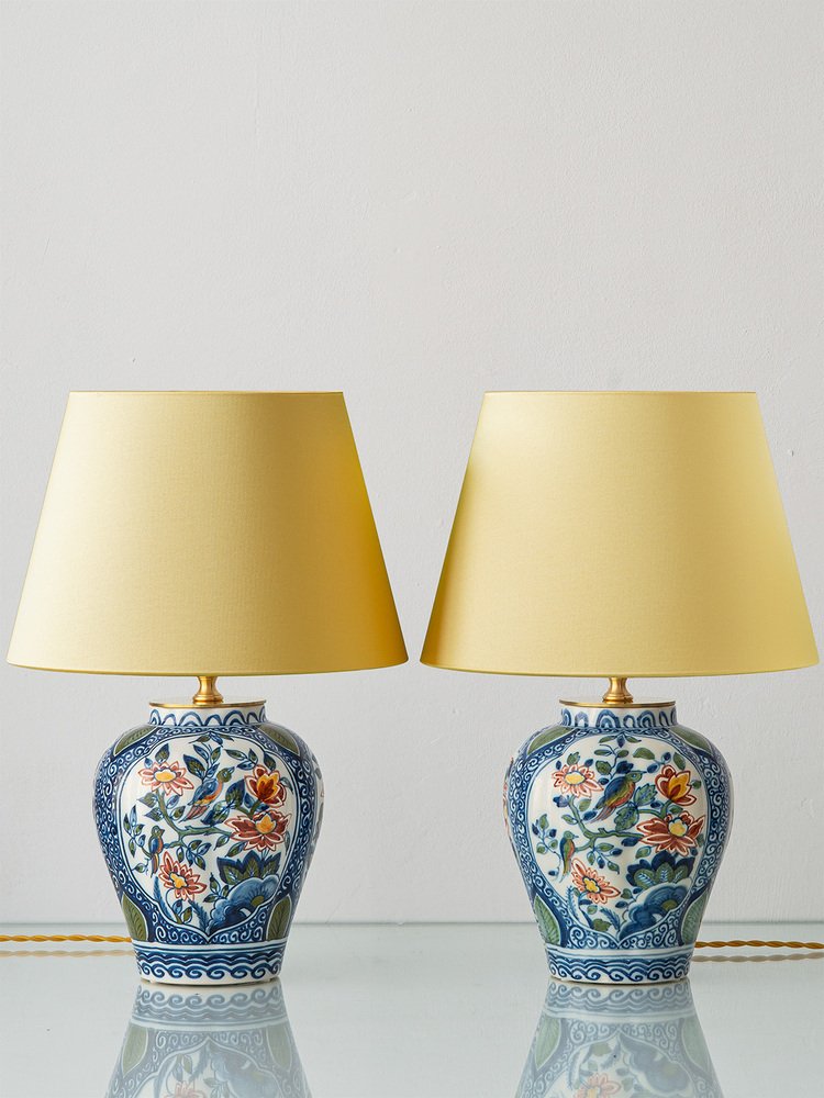Diese lebhaften Gartenszenen werden von komplizierten blauen Mustern umrahmt, die von wirbelnden Motiven in traditionellem chinesischen Porzellan inspiriert sind - ein deutlicher Einfluss auf die Delfter Keramik. Die Verschmelzung östlicher und westlicher Kunsttraditionen in diesem Chinoiserie-Stil spiegelt den reichen kulturellen Austausch wider, der diese Stücke geprägt hat. Das Ergebnis sind Vintage-Tischlampen, die sowohl historisch bedeutsam als auch visuell beeindruckend sind.