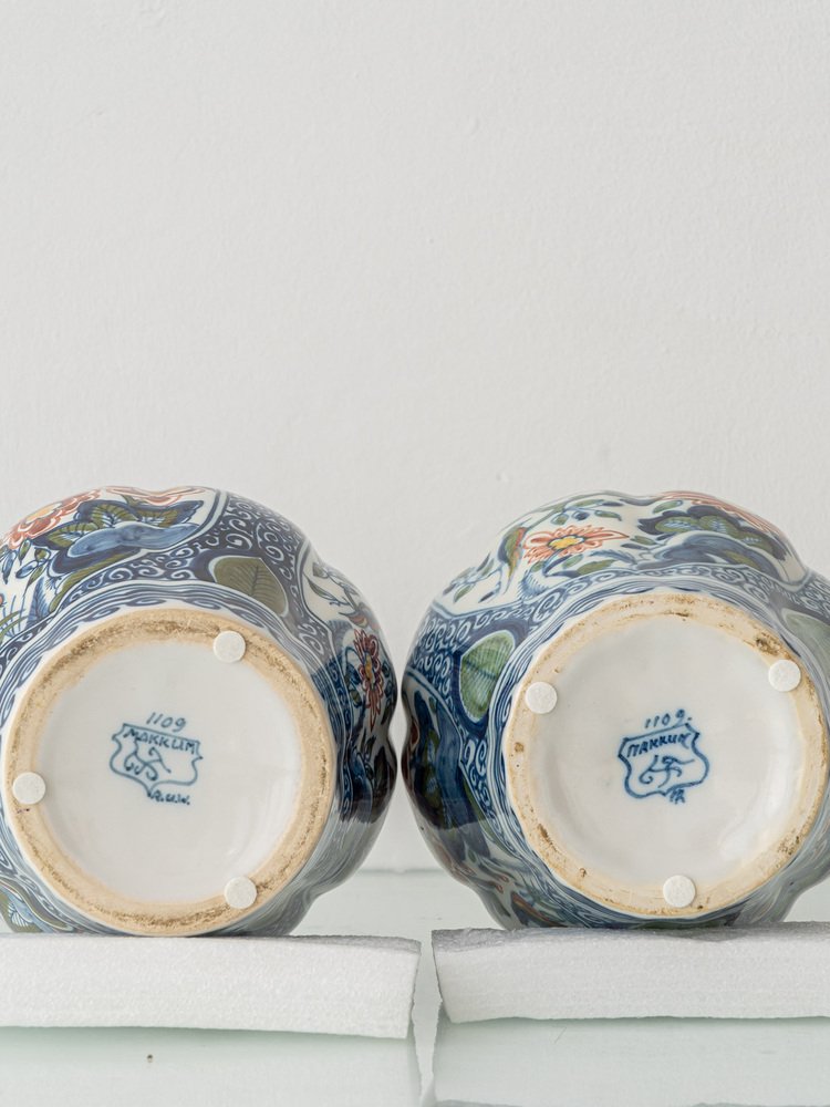 Die Vasen, die den Sockel der Lampen bilden, wurden zwischen 1940-60 von verschiedenen Malermeistern von Royal Tichelaar Makkum handgefertigt und handbemalt, wie die Markierungen auf dem Boden zeigen. Jede Vase zeigt verschiedene Gartenszenen, jede mit einem einzelnen Vogel und einem einzigartigen Blumenarrangement. Die drei Tafeln jeder Vase zeigen ähnliche Blumenmotive wie Pfingstrosen und Chrysanthemen, aber subtile Variationen in Farbe und Komposition verraten die individuelle Note der Meistermaler. Jeder Vogel, der sorgfältig detailliert dargestellt ist, steht als einzigartiger Mittelpunkt in den Szenen und lässt den individuellen Charakter des Malers durchscheinen.