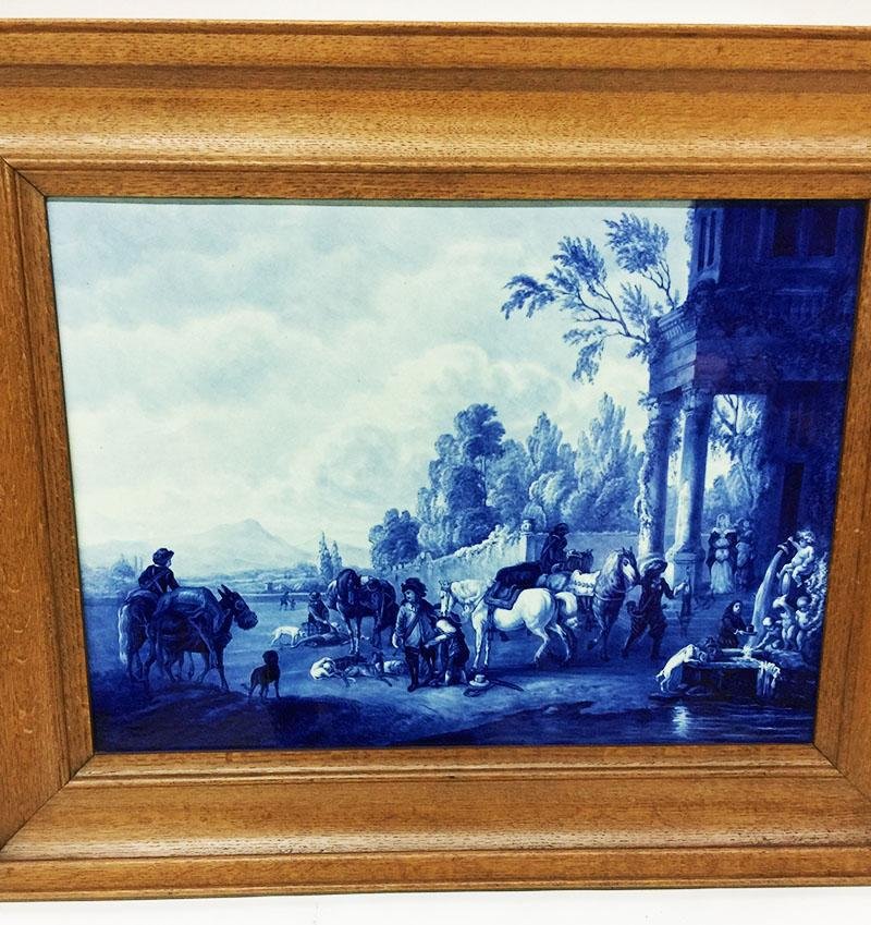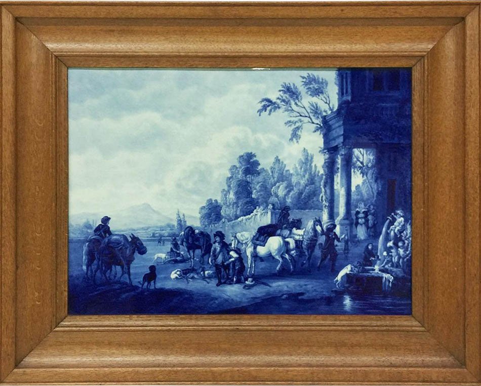 A Porceleyne Fles, delft plaque painted after a painting of Philips Wouwerman A Porceleyne Fles, delft plaque painted after a 17th century. painting by the Dutchman Philips Wouwerman. (Return from the hunt) The plaque of the delft Porceleyne Fles is from 1928 and painted by Lispet. J.W. (1887-1938) The plaque is framed in his original oak wooden frame The measurements are: Plaque 36.5 cm high and 49.5 cm wide Framed 54 cm high, 67 cm wide and the depth is 4.5 cm Weight in total is 6.5 kilos Philips Wouwerman (1619-1668 Haarlem) He was the son of the Dutch Alkmaar painter Pouwels Joostensz. Wouwerman. Wouwerman was a student of his father and of Frans Hals. In 1638 he traveled with his fiancé to Hamburg to get married there. In 1640 he is listed in the guild of Haarlem. He died on May 19, 1668 and was buried on May 23 in the Nieuwe Kerk in Haarlem. Wouwerman is an extraordinary talent and none of the horse painters of his own time, nor from the later centuries has surpassed him as a draftsman and colorist. He was very popular in his day and managed to create demand for his work. A lot of money was paid for his paintings in the 18th century. Stadtholder Willem V even paid 4575 guilders for one canvas, more than was ever paid for a Rembrandt or Vermeer at that time. Frederick the Great had pictures of Wouwerman copied on a set, and then gave it to Catherine the Great as a gift. Despite this, Wouwerman is hardly known anymore, especially among the general public. Philips Wouwerman was the best known among the Wouwermans. In 2009/2010, the first retrospective exhibition of his work ever took place in the Mauritshuis in The Hague and in the Gemäldegalerie Alter Meister in Kassel, Germany.