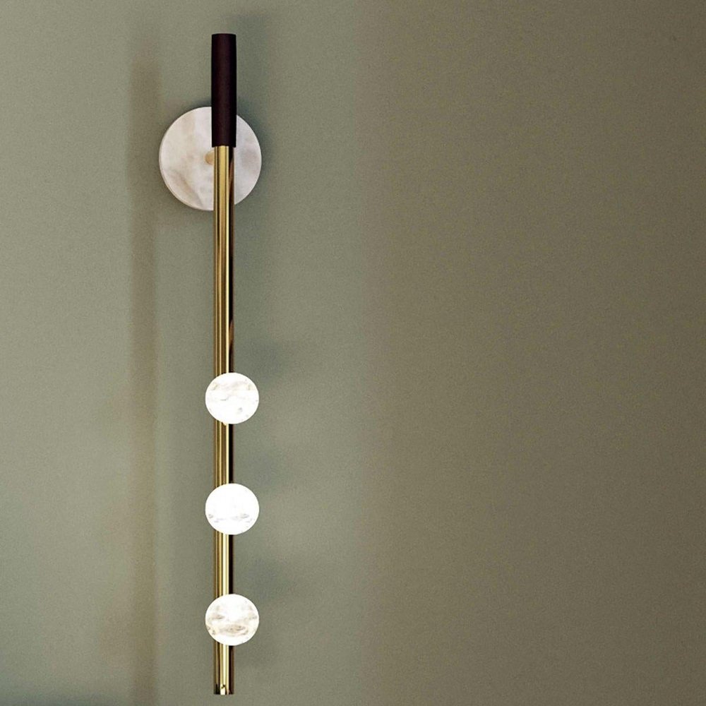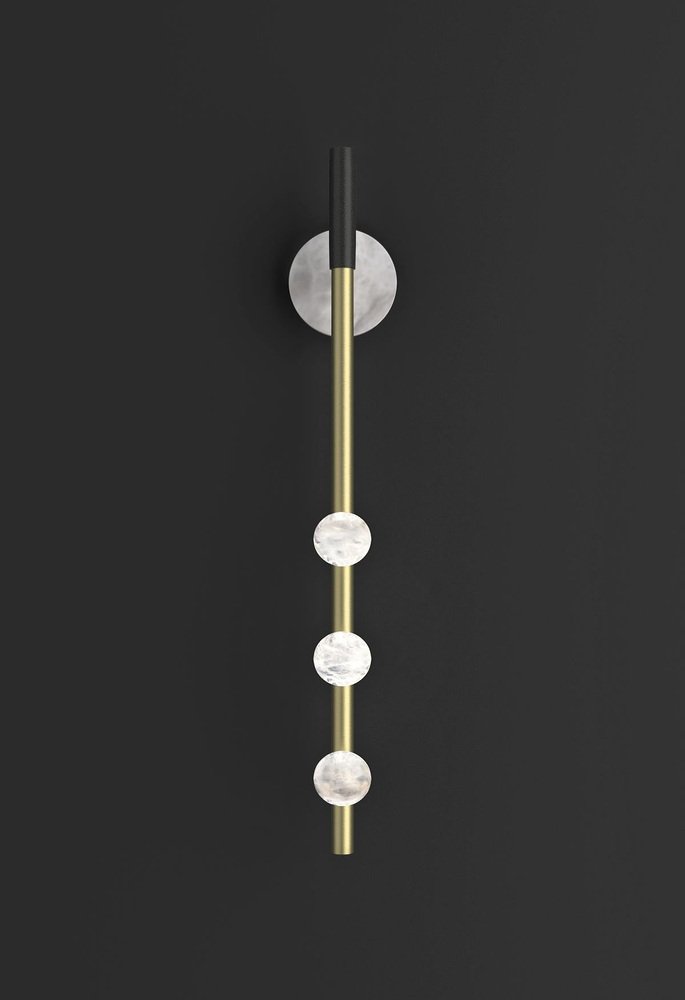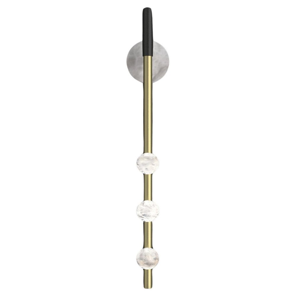 Demetra Brushed Brass Wall Lamp by Alabastro Italiano Dimensions: D 9 x W 10 x H 60 cm. Materials: White alabaster, brass and leather. Available in different finishes: Shiny Silver, Bronze, Brushed Brass, Ruggine of Florence, Brushed Burnished, Shiny Gold, Brushed Black, Freedom Green, Shiny Black and Copper. Please contact us. All our lamps can be wired according to each country. If sold to the USA it will be wired for the USA for instance. The name Demetra, goddess of flora, sister of Zeus, fully reflects the particular shape of this series by Alabastro Italiano. The spheres, of pure hand-turned alabaster, look like fruits hanging from the branches of a hypothetical tree of light. These brilliant elements stand out between heaven and earth and symbolize the richness that only Mother Nature can offer us. After years of experience in the family business, which specializes in design and lighting, Riccardo and Alberto Ongarato found the brand Alabastro Italiano. Each project is conceived and designed to give a strong sign of recognizability and uniqueness. The use of precious materials such as alabaster, brass, leather and blown glass, worked by the skilful hands of our craftsmen, are combined to create “timeless” objects. from the depths of the earth to the light of the sun. ALABASTRO ITALIANO care about these extremes and transcends them in a creative dynamic that emphasizes simplicity and clean-cut lines. The company has created an entirely new project MADE IN ITALY, revolutionizing the previously existing collections into eternal and evergreen lighting elements. By designing clean-cut and original lines, built-in with the latest technology and continuously innovating, ALABASTRO ITALIANO has never lost sight of its goal: perfection. The result of this work is an extraordinary collection of alabaster lightings. Alabaster needs human hands to come to life. The charm of these stone objects comes from their uniqueness, from the fact that they come from the hand of those who has left a mark and a memory with their work, each grain makes each piece unique. Alabaster needs human hands to come to life. The charm of these stone objects comes from their uniqueness, from the fact that they come from the hand of those who has left a mark and a memory with their work, each grain makes each piece unique. Alabaster is a Material that leaves little traces of magic all around it. It is difficult to identify the exact point where the Material ends and its reflection begins. It is impossible to understand how far the light sinks in its soft transparency. It changes according to the positions in which it is placed, depending on the point of view. Alabaster is a compact and rare stone that lays down very precise laws requires a familiarity that only Italian craftsmen possess. Alabastro Italiano collaborates with each client to create a unique project. Starting from the advice for better architectural lighting, it brings its know-how, materials, design and creative inspiration to interior architects and interior designers.