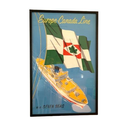 An authentic poster from the Europe-Canada Line, picturing the “M.S. Seven Seas” (the name is writting at the bottom of the poster). The poster shows a large ship with a checkered flag in front of it with the Canadian flag’s maple leaf symbol in the center. The M.S. Seven Seas was one of only two passenger vessels that sailed this line from 1955 to 1967. The colourful poster is a piece of modern history as well as a beautiful appealing addition to the decor! It remains in very good, vintage condition with minor wear consistent with age and use, preserving a beautiful patina. Reyn Dirksen (1924–1999) studied at the Institute of Applied Arts Education, which is now the Rietveld Academy in Amsterdam. He has created dozens of posters for a wide range of products. Many large companies as well as the municipality of Amsterdam made use of his design talent. For Amsterdam, he made a lot of posters for events, of which the most famous ones include HISWA, Fashion week, KLM and Schiphol, Heineken, Bols, Verkade, Rizla, Holland-America and Dutch Railways, Red Cross, etc. His most sought-after fairground posters, such as the LUNAPARK, also date from that time and have become a real collector’s item. This includes the famous “All Colours tot he Mast” poster that was designed for the “Intra-European Cooperation for a Better Standard of Living Poster” by the George C. Marshall foundation. It was picked as the winner out of more then 10.000 designs from all over the world! The poster was seen as a visual metaphor of the poverty in Europe during and after the Second World War and the value of uniting the European countries, like a ship in raging water.