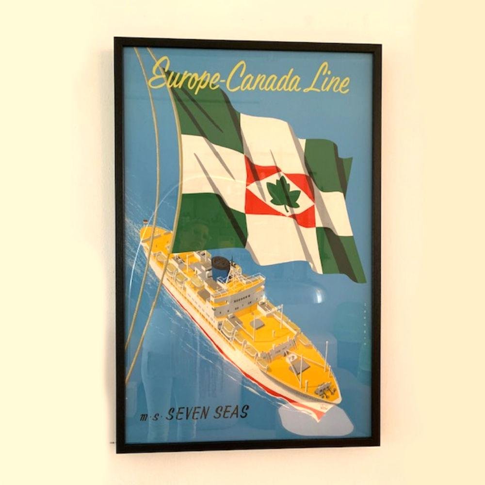 An authentic poster from the Europe-Canada Line, picturing the “M.S. Seven Seas” (the name is writting at the bottom of the poster). The poster shows a large ship with a checkered flag in front of it with the Canadian flag’s maple leaf symbol in the center. The M.S. Seven Seas was one of only two passenger vessels that sailed this line from 1955 to 1967. The colourful poster is a piece of modern history as well as a beautiful appealing addition to the decor! It remains in very good, vintage condition with minor wear consistent with age and use, preserving a beautiful patina. Reyn Dirksen (1924–1999) studied at the Institute of Applied Arts Education, which is now the Rietveld Academy in Amsterdam. He has created dozens of posters for a wide range of products. Many large companies as well as the municipality of Amsterdam made use of his design talent. For Amsterdam, he made a lot of posters for events, of which the most famous ones include HISWA, Fashion week, KLM and Schiphol, Heineken, Bols, Verkade, Rizla, Holland-America and Dutch Railways, Red Cross, etc. His most sought-after fairground posters, such as the LUNAPARK, also date from that time and have become a real collector’s item. This includes the famous “All Colours tot he Mast” poster that was designed for the “Intra-European Cooperation for a Better Standard of Living Poster” by the George C. Marshall foundation. It was picked as the winner out of more then 10.000 designs from all over the world! The poster was seen as a visual metaphor of the poverty in Europe during and after the Second World War and the value of uniting the European countries, like a ship in raging water.