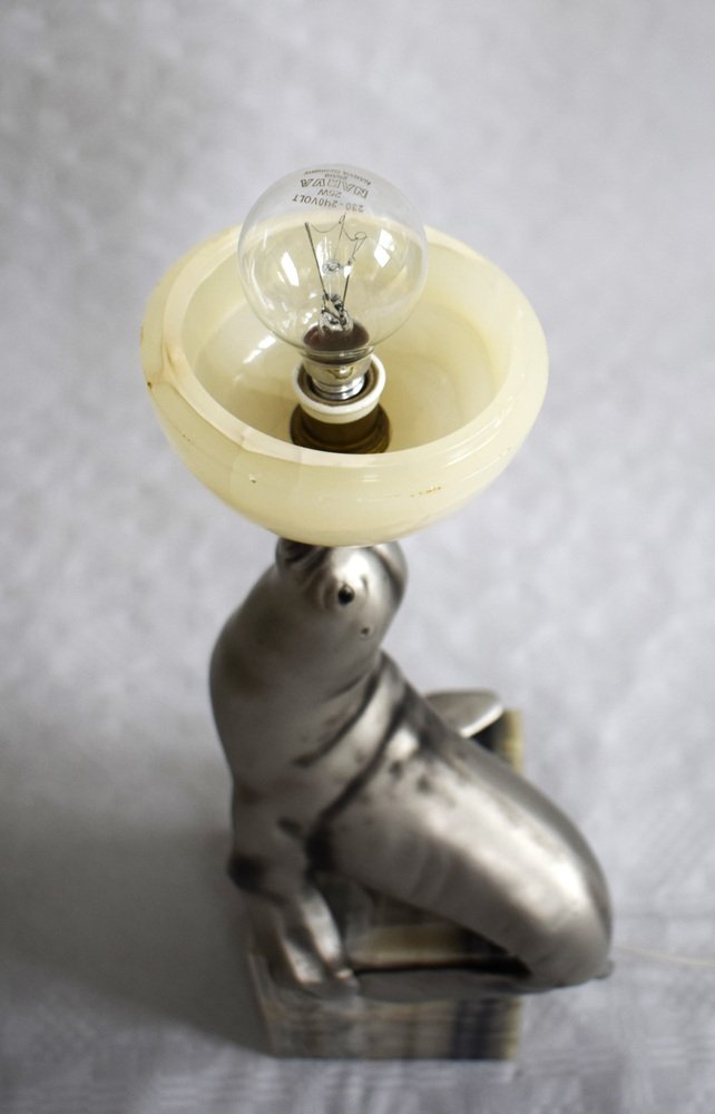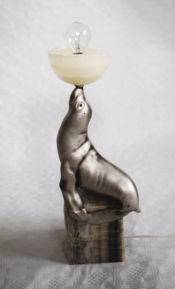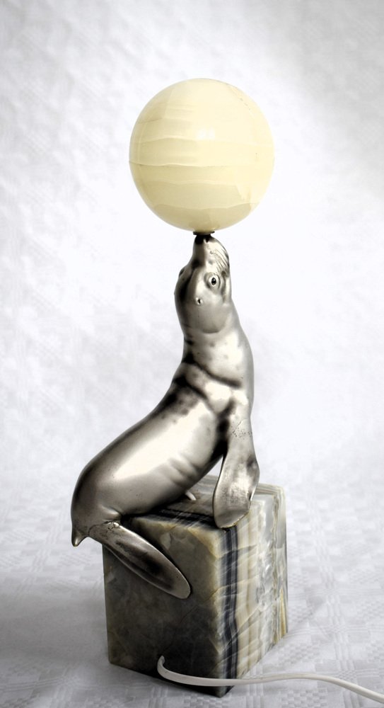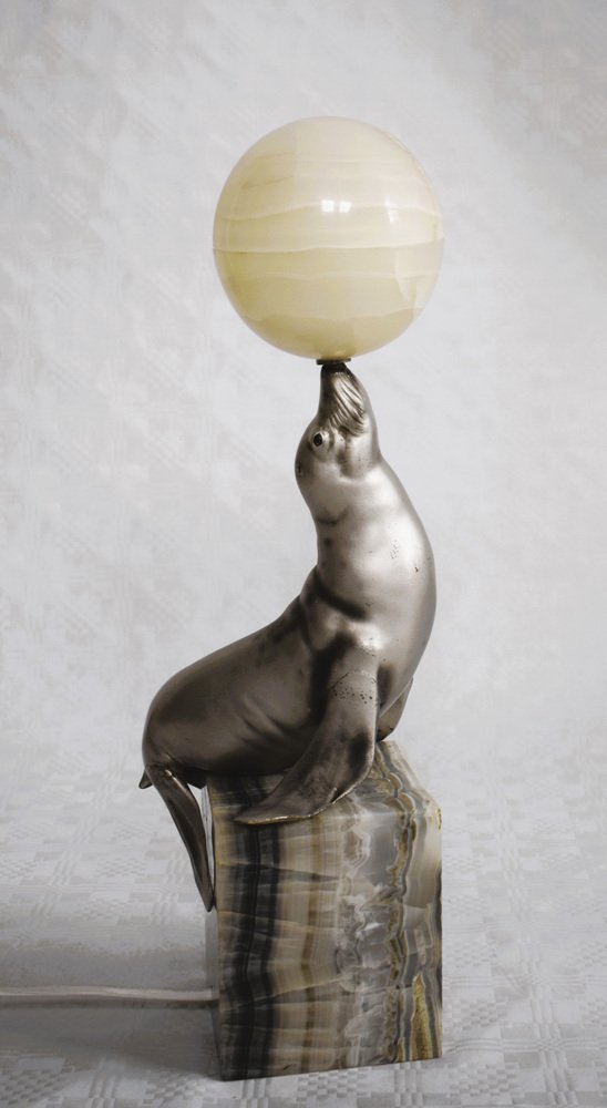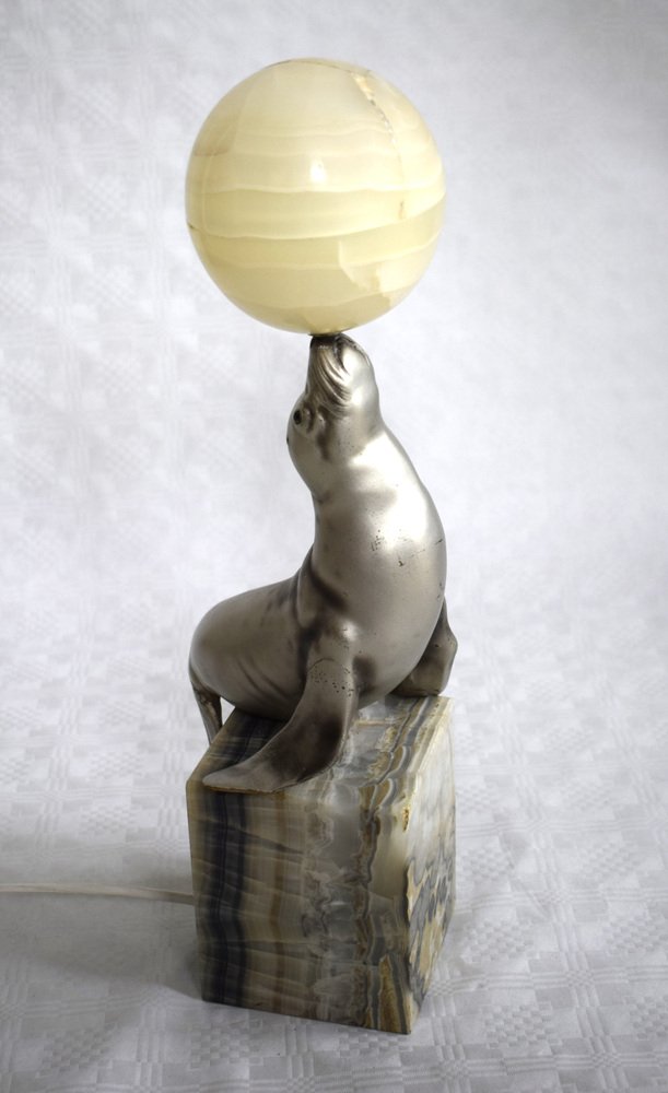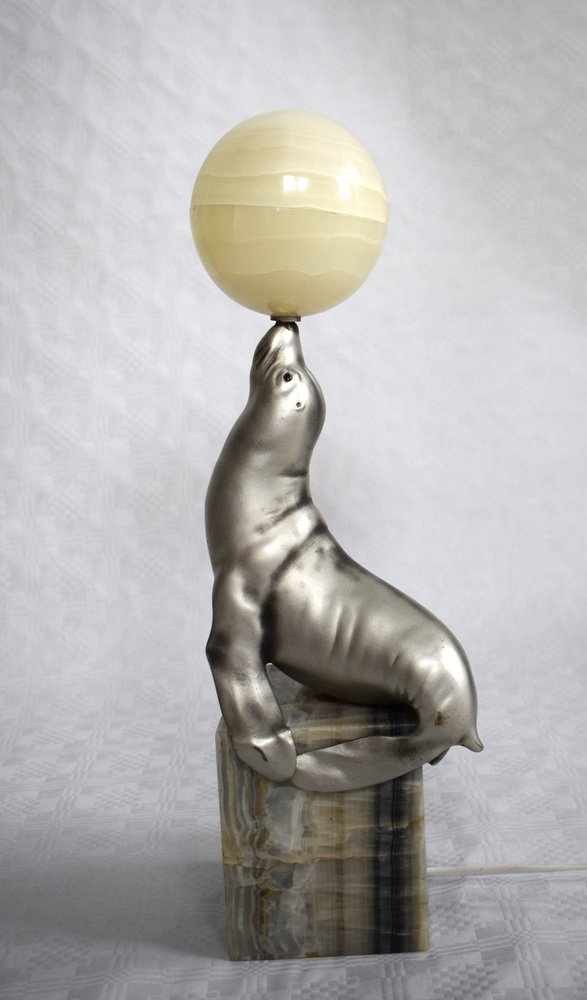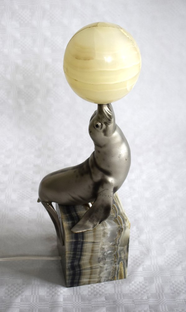 Französische Art Deco Seelöwen Tischlampe mit Alabasterkugel, 1920er