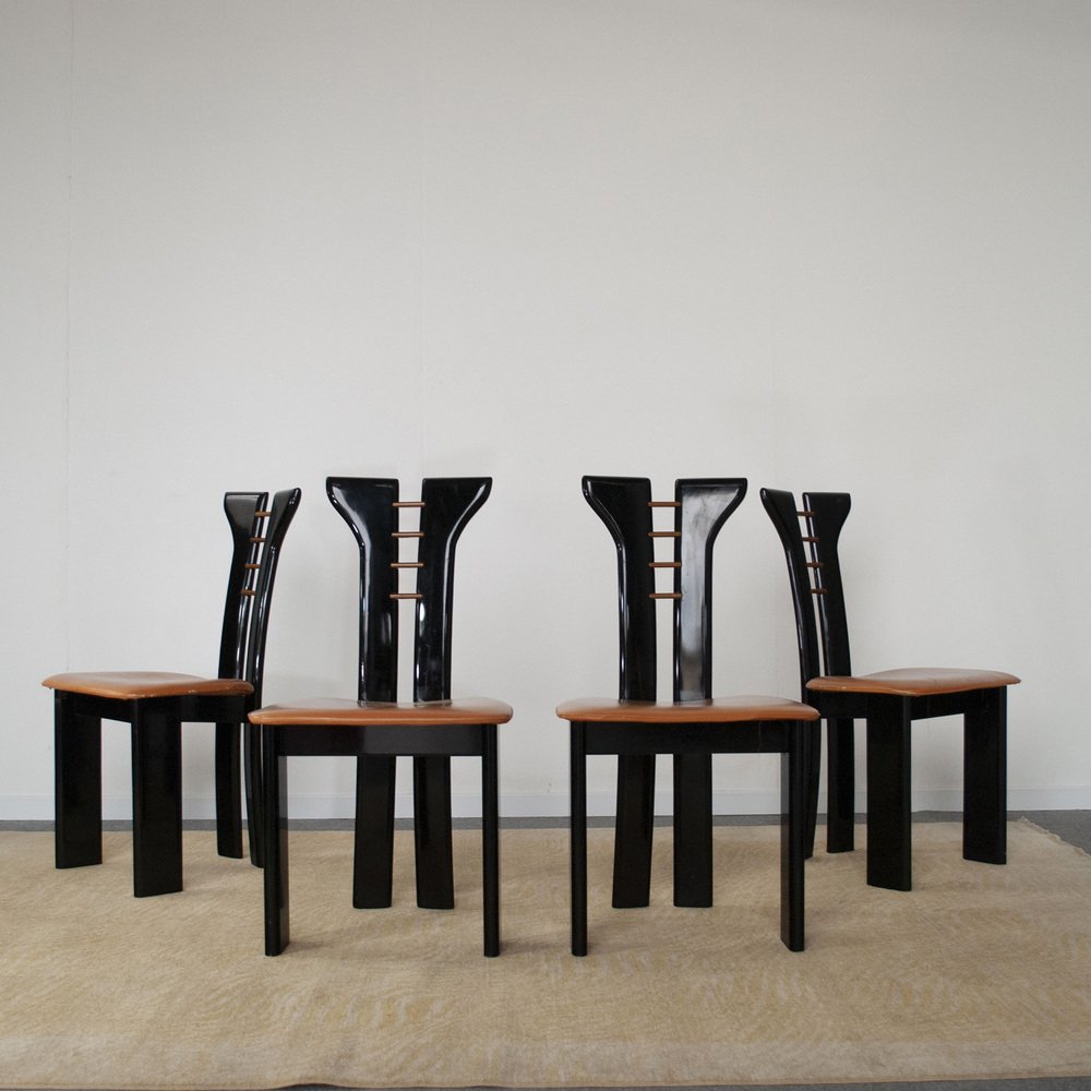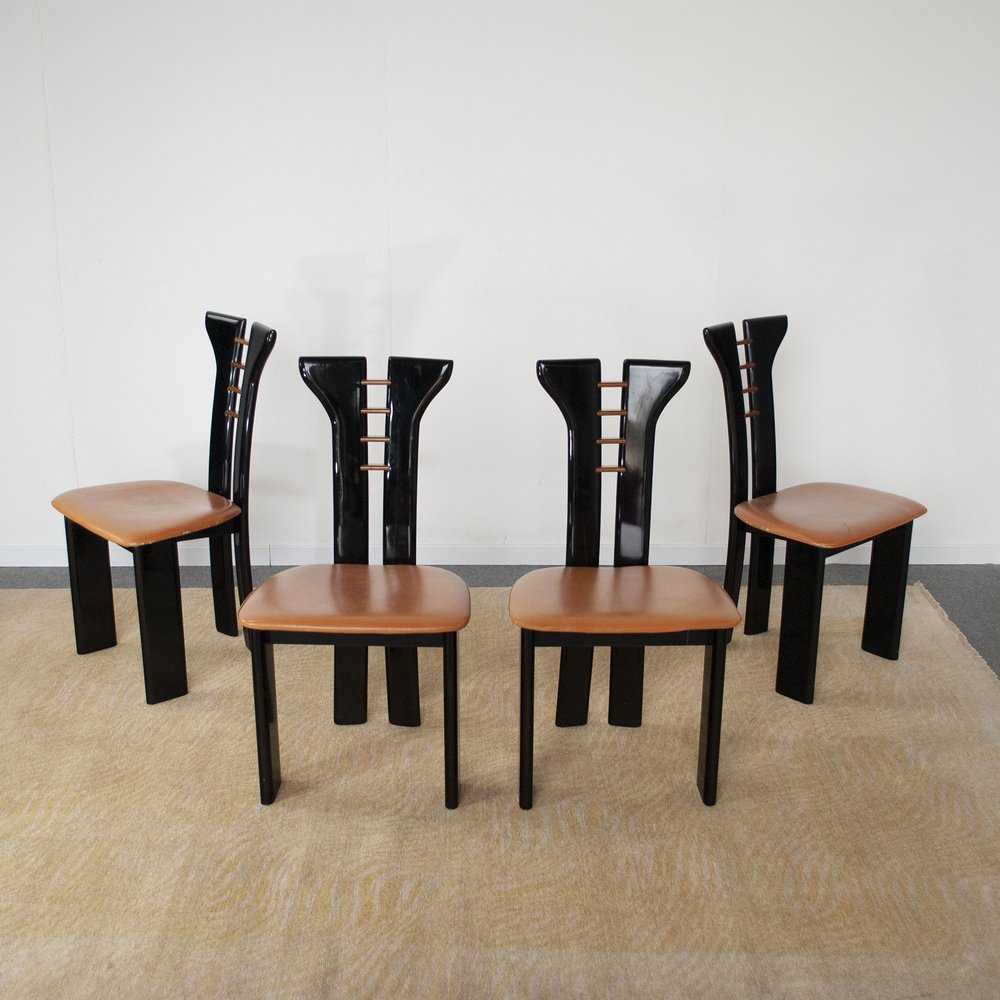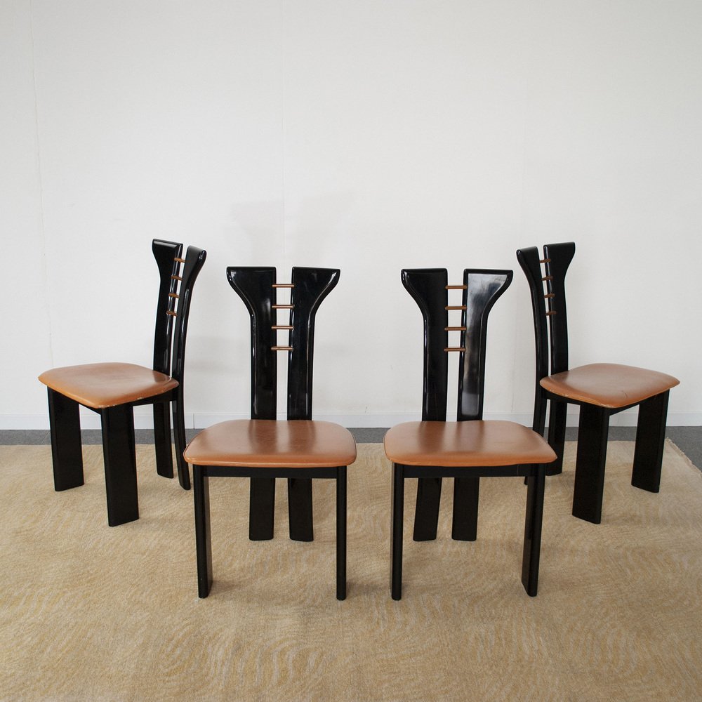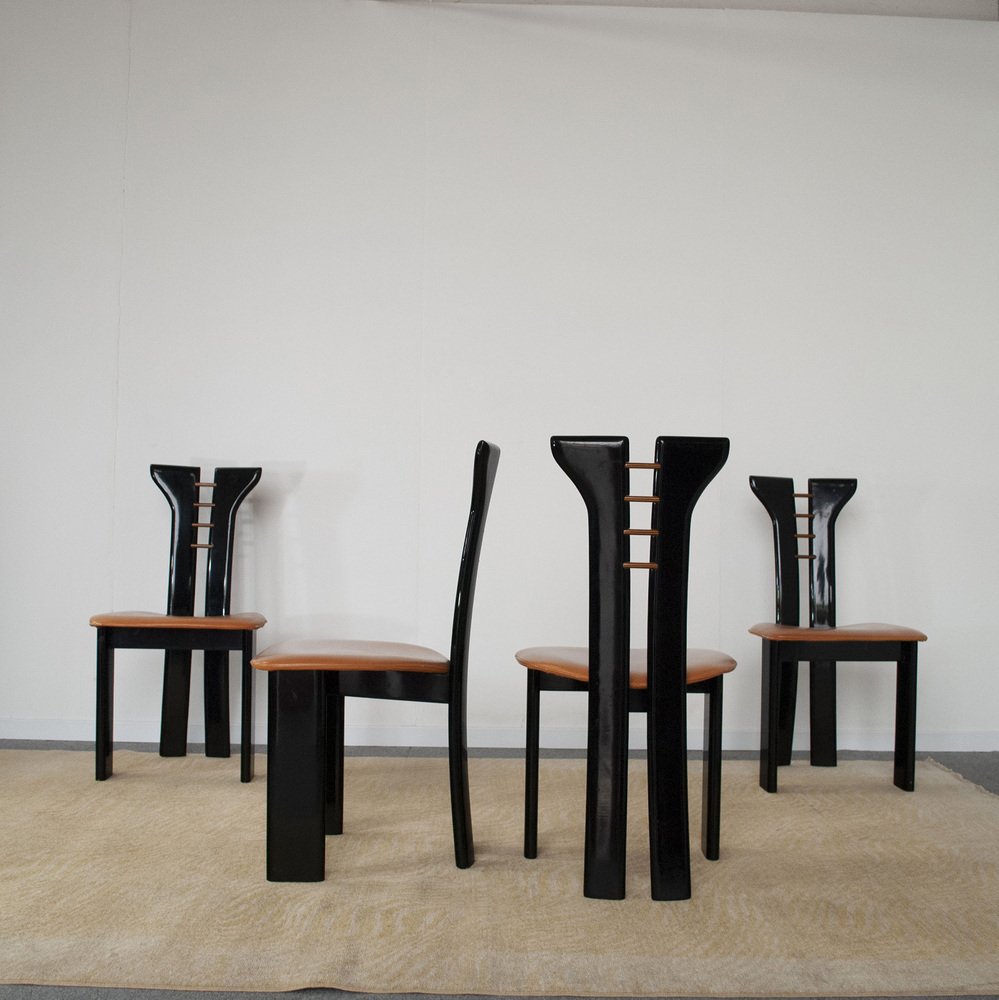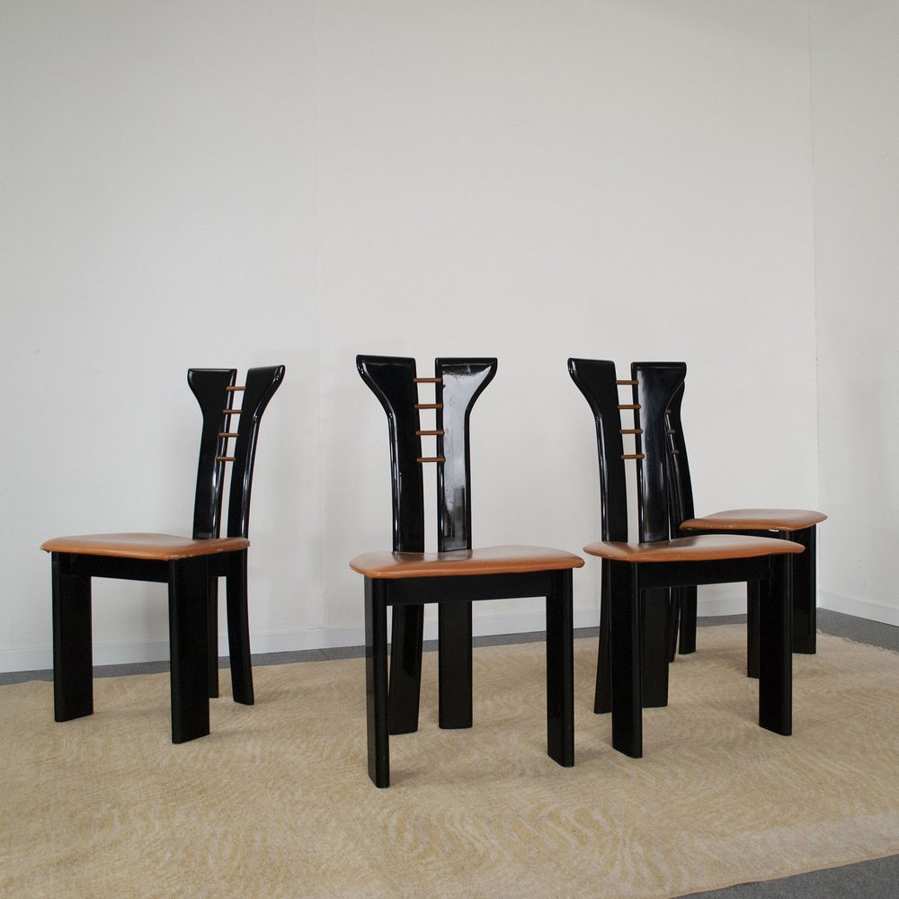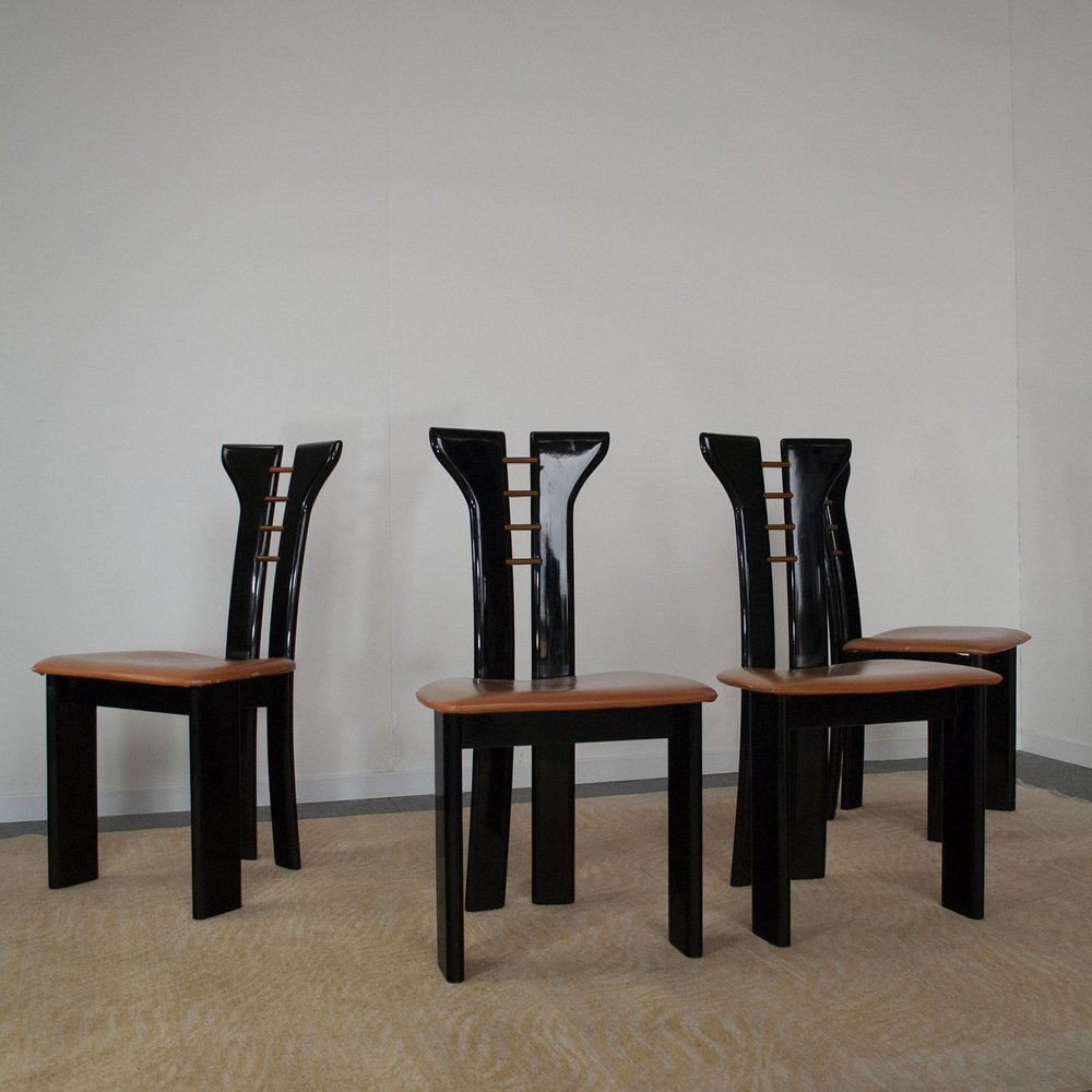 Französische Schwarz Lackierte Holzstühle mit Cognacfarbenem Ledersitz von Pierre Cardin, 1970er, 4er Set