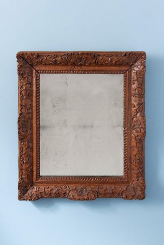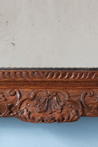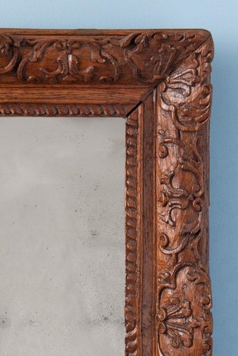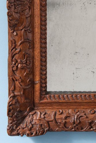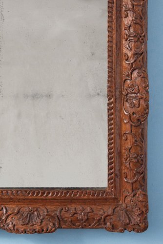 This early 18th-century French oak mirror is richly carved with seashells, flowers, foliage, and graceful scrolls, while the mirror plate is encircled by a delicate frieze of beads. Likely a frame later converted into a mirror, it features an antique mercury plate with attractive foxing.The finely carved motifs are enhanced by the deep brown of the oak, its natural veining, and the tactile quality of the hand-carving. In excellent condition, this rare mirror combines refined craftsmanship with subtle patina.